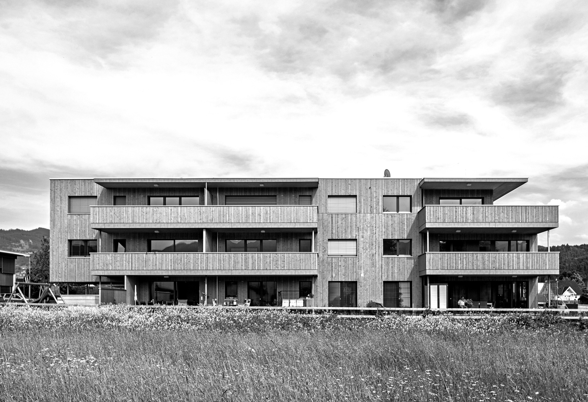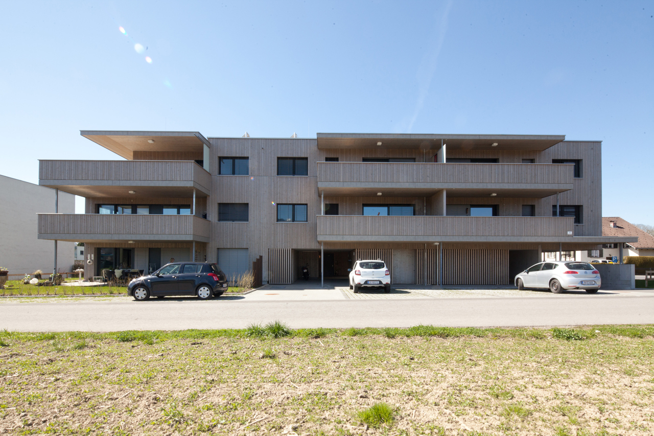 Decken, Wohnungstrennwände und das Untergeschoß sind als Massivbau in Stahlbeton ausgeführt; die Außenwände werden von vorgefertigten Holzfassadenelementen gebildet. Vertikal angeordnete Holzlatten unterschiedlicher Breite verkleiden die Wände und Balkonbrüstungen. Das sägeraue, in silbergrauem Ton dreifach lasierte Fichtenholz wirkt sehr ruhig, edel und fein. Die Laubengänge und Decken im Atrium sind aus Massivholzplatten.