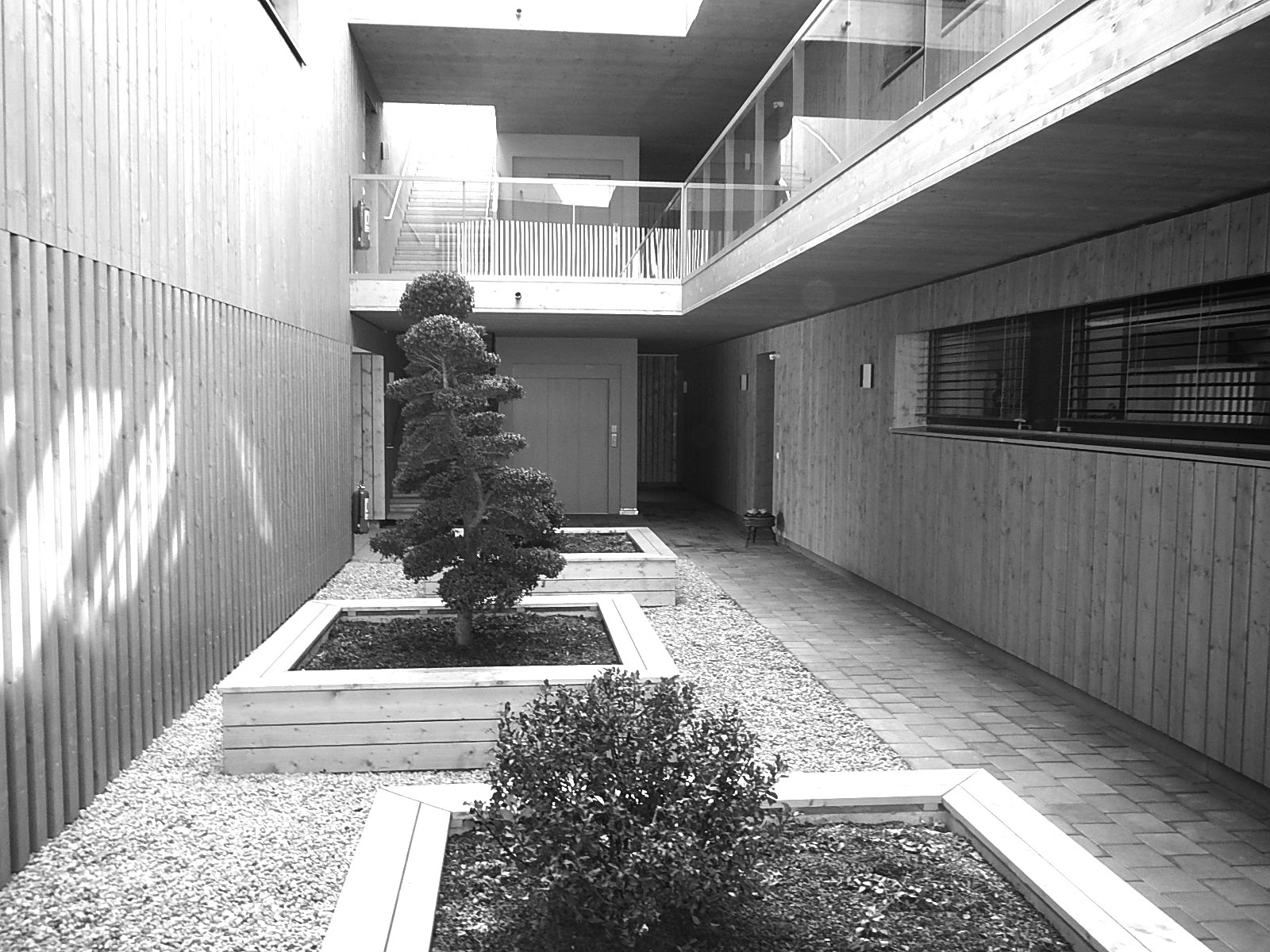 In der Mitte der Ostfassade des dreigeschoßigen Gebäudes liegt der Zugang, welcher direkt in das Atrium führt. Dieses dient der Erschließung aller Wohneinheiten und bildet einen attraktiven Aufenthalts- und Kommunikationsbereich. Die Wohnungen gruppieren sich u-förmig um den langgezogenen Innenhof. Im südlichen Teil des Atriums liegt die Treppenanlage, welche um den Lift herum in die Obergeschoße führt. Der Zugang zu den einzelnen Wohnungen erfolgt über brückenartige Stege, die komplett in Holz ausgeführt sind.