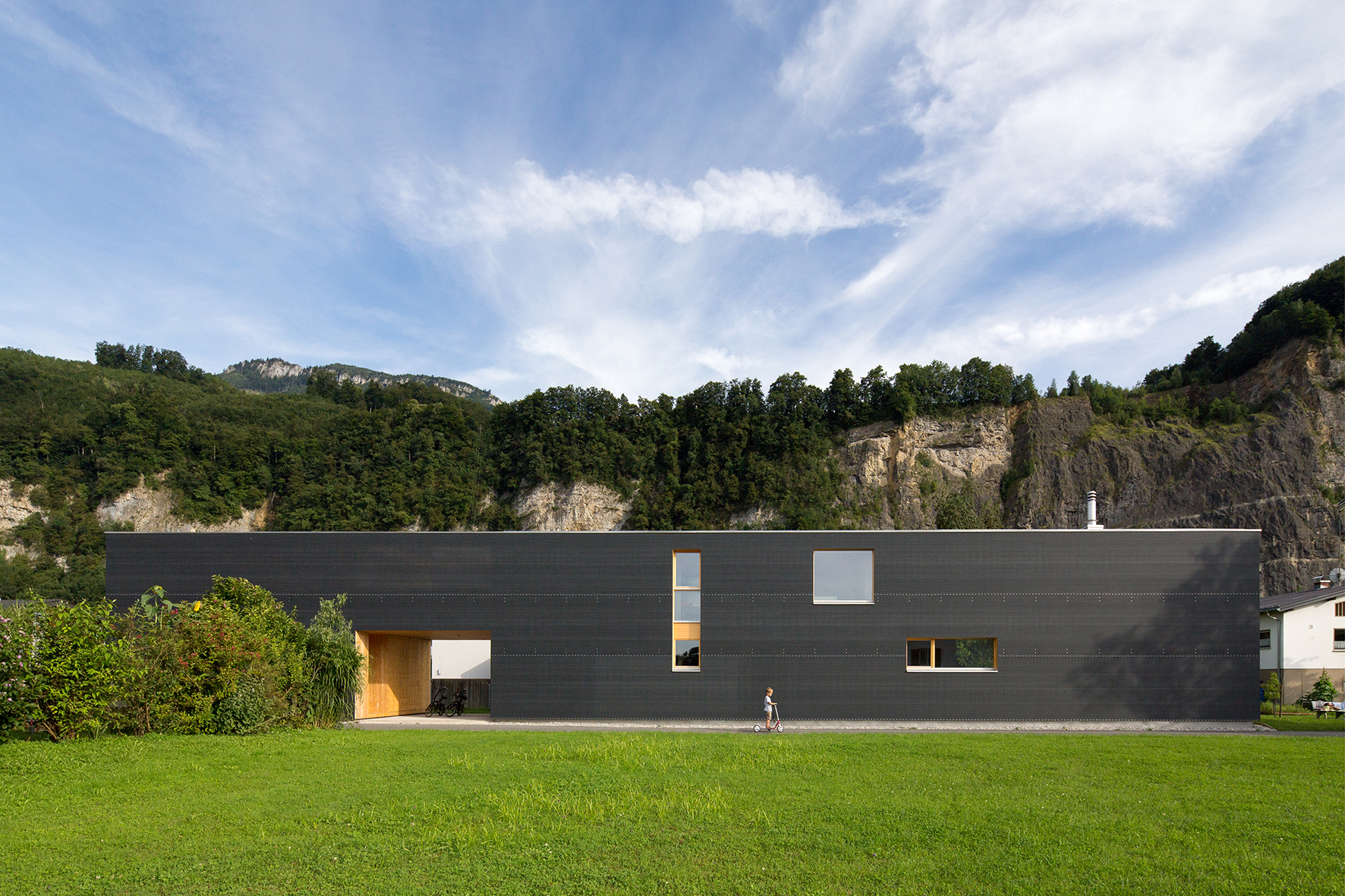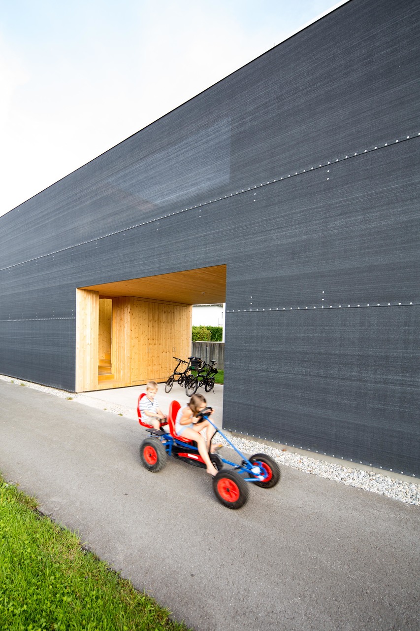 Der zweigeschoßige Holzbau ist an beiden Längsfassaden mit einem anthrazitfarbenen Polyethylen-Netz verkleidet. Die dezente grafische Gestaltung stammt von der Bauherrin selbst: Schrauben, welche zur Befestigung des Netzes benötigt werden, sind so angeordnet, dass eine Meterskala entsteht – wie ein überdimensional langes Lineal. Im Vorbeigehen lassen sich so Meter und Dezimeter der außergewöhnlichen Gebäudelänge ablesen.