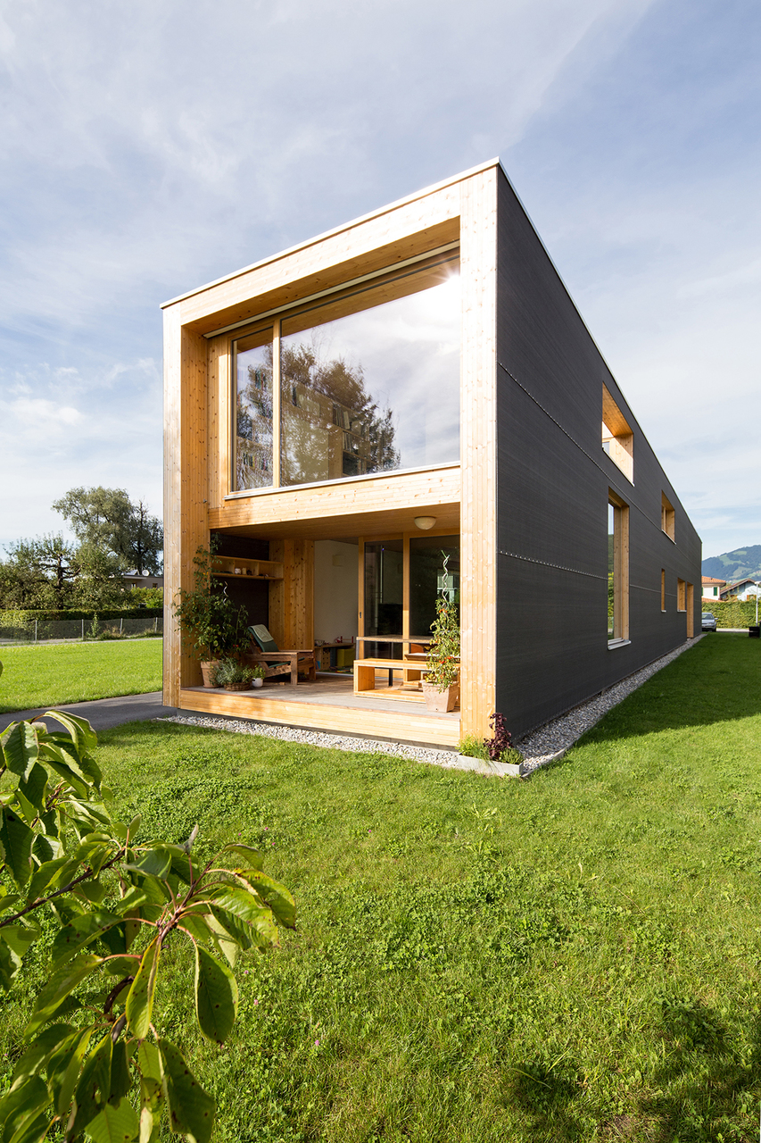 Wohnen und Arbeiten sind unter einem Dach vereint. Den Großteil des Gebäudes nimmt die großzügige Wohneinheit der Jungfamilie ein; im nördlichen Teil, Richtung Straße, ist ein Grafikbüro untergebracht. Die beiden Funktionen sind zwar eng beieinander, aber durch den zentralen schopfartigen Eingangsbereich und die darüberliegende Loggia klar voneinander getrennt.
