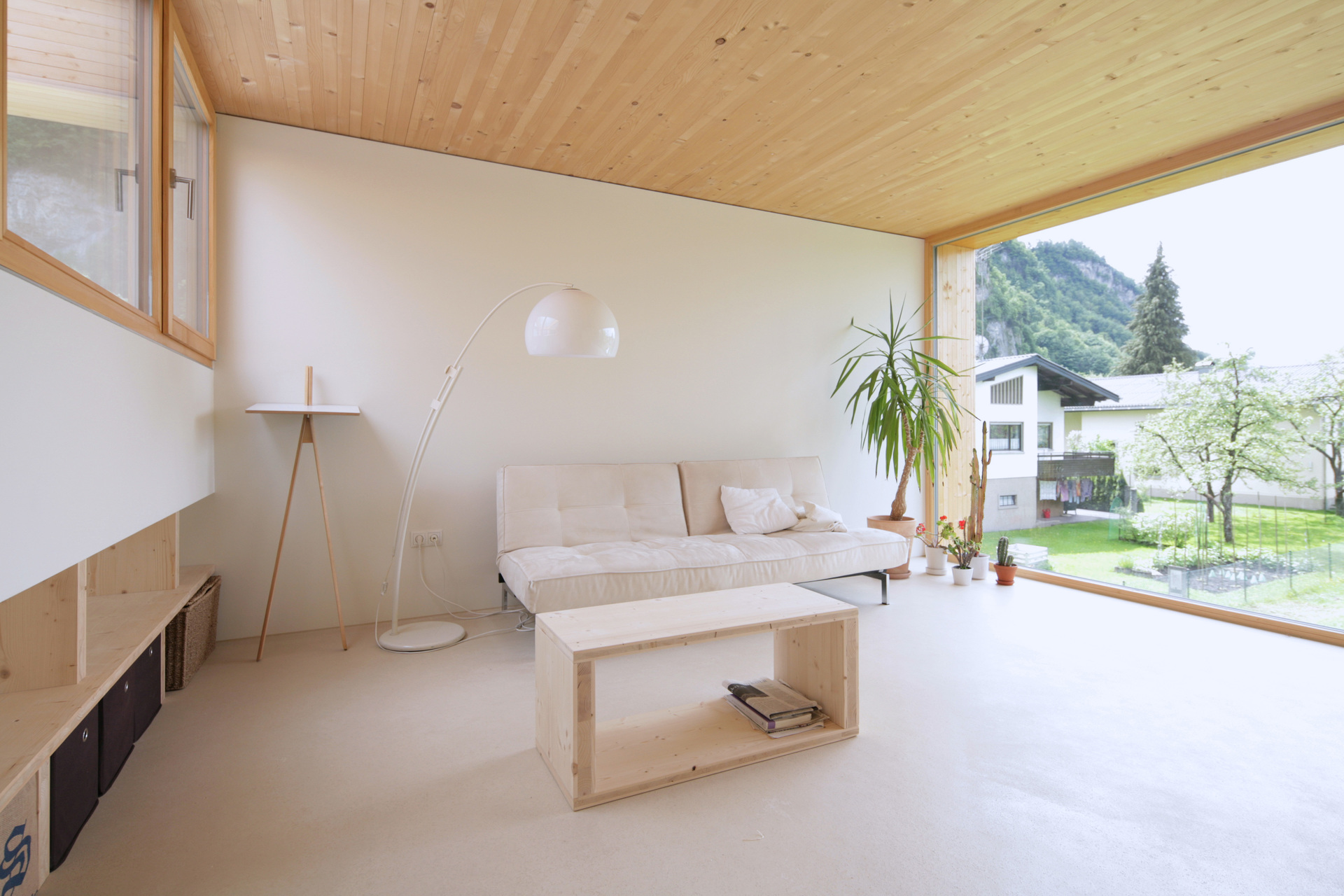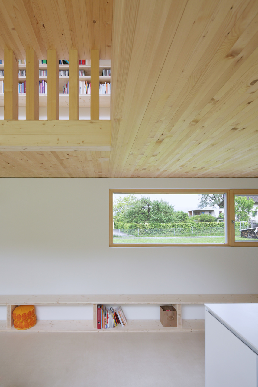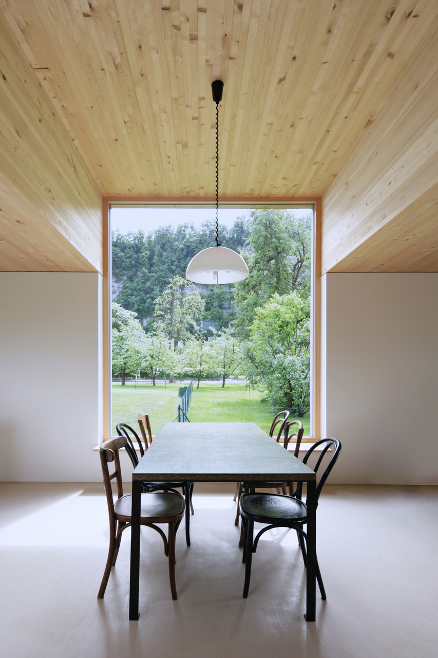 Aufgrund der geringen Spannweite braucht es im Inneren keine tragenden Wände; Massivholzdecken aus Fichtenholz überspannen die 4,20 Meter breiten Innenräume. Am Boden befindet sich ein Anhydrit-Estrich, der hineingegossen und abgeschliffen wurde. Der Sicht-Estrich ist strapazierfähig und wirkt sehr wohnlich, warm und samtig.