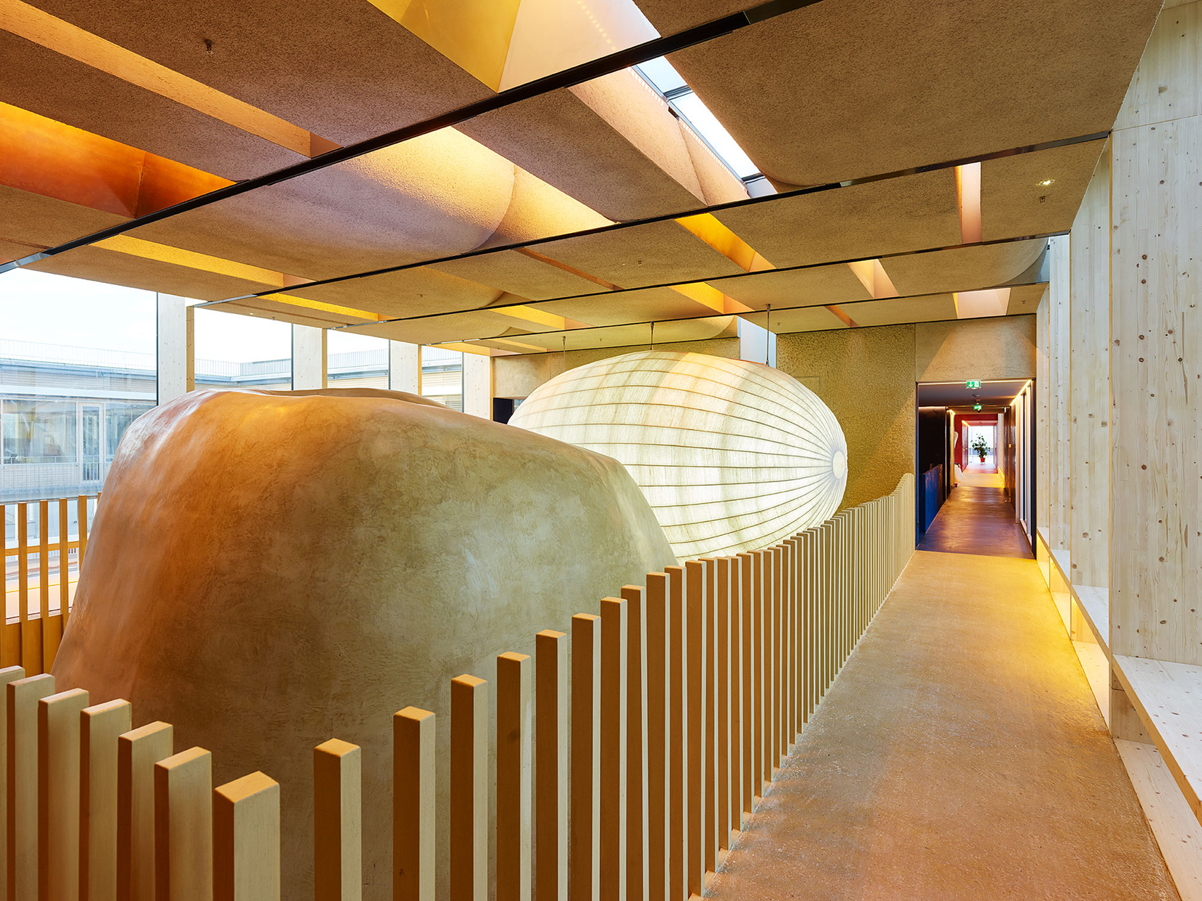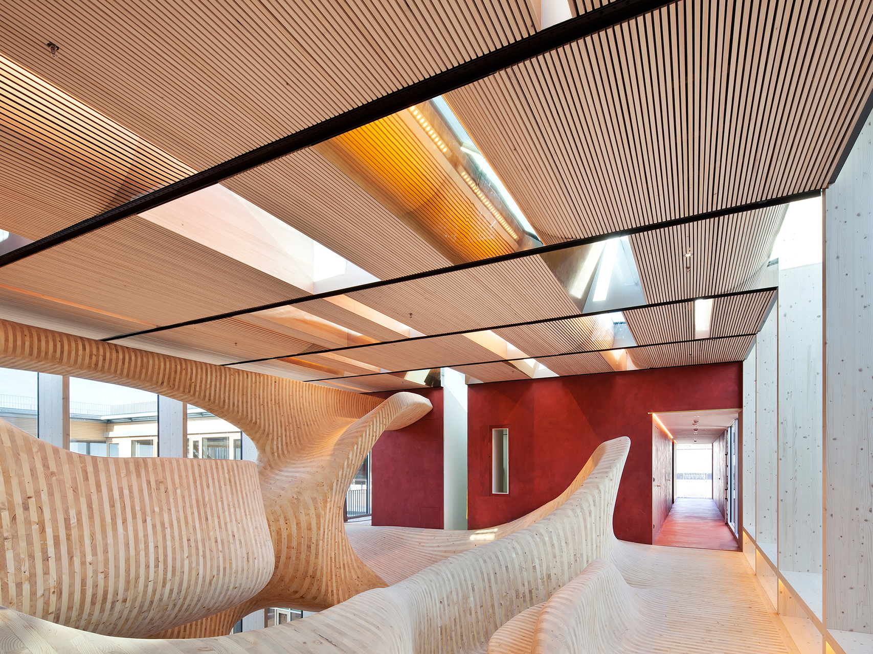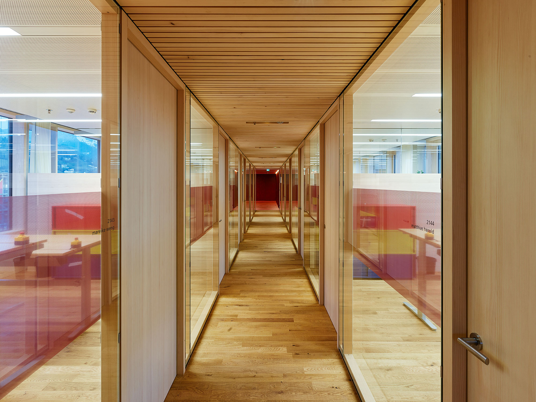 Das weltweit tätige Unternehmen OMICRON wurde schon mehrfach für seine besondere Firmenkultur ausgezeichnet. Mit der Vergrößerung des Standorts in Klaus um 200 Arbeitsplätze und zusätzliche Lagerräume wurde der hohe Anspruch an architektonische Qualität und Arbeitsklima fortgesetzt. Das Raumprogramm und die Gestaltung spiegeln die flache Hierarchie im Betrieb. Alles ist im selben hochwertigen Standard ausgeführt, Weißtanne für die Wände, Eichenböden, Kühldecken aus Metall und angenehme Beleuchtung. Die Büros können je nach Bedarf und Teamgröße flexibel angepasst werden.