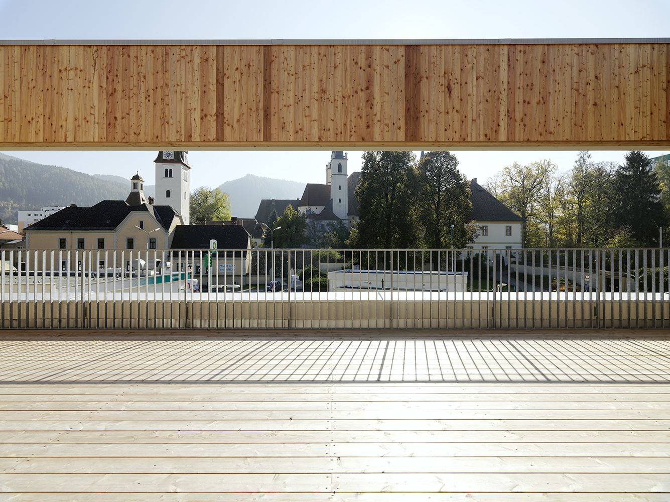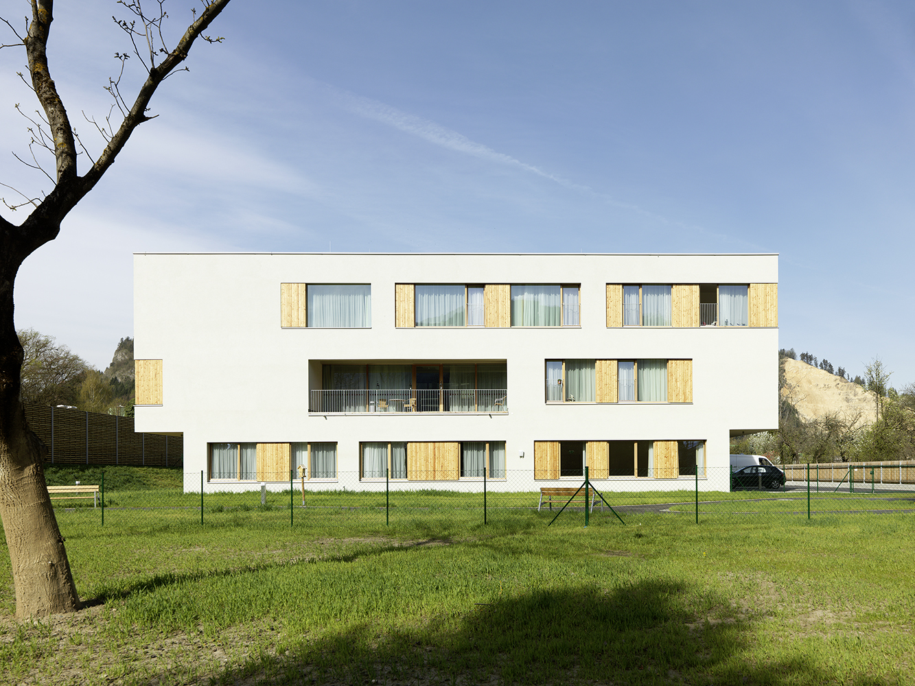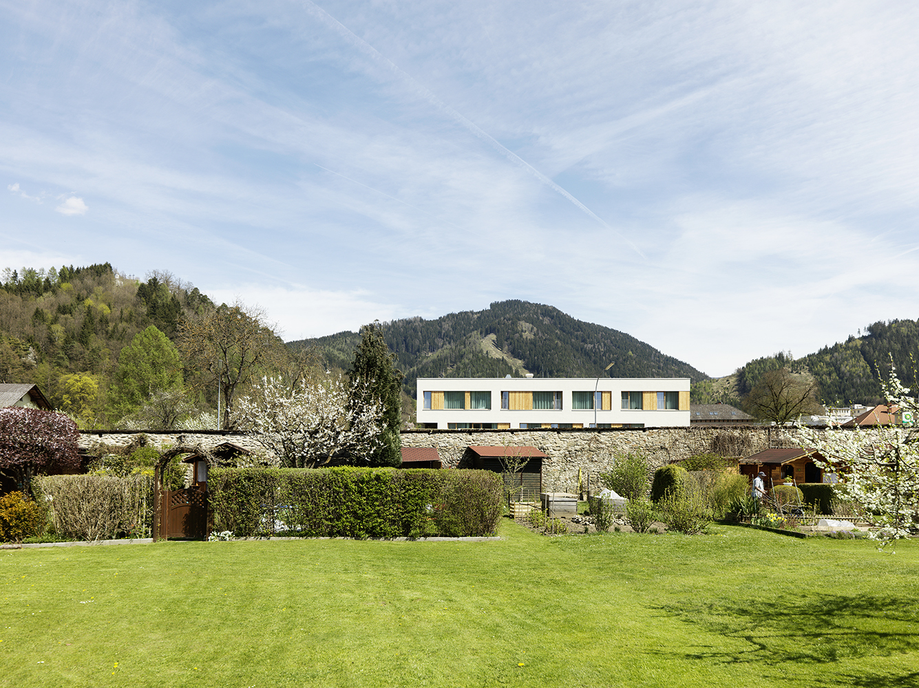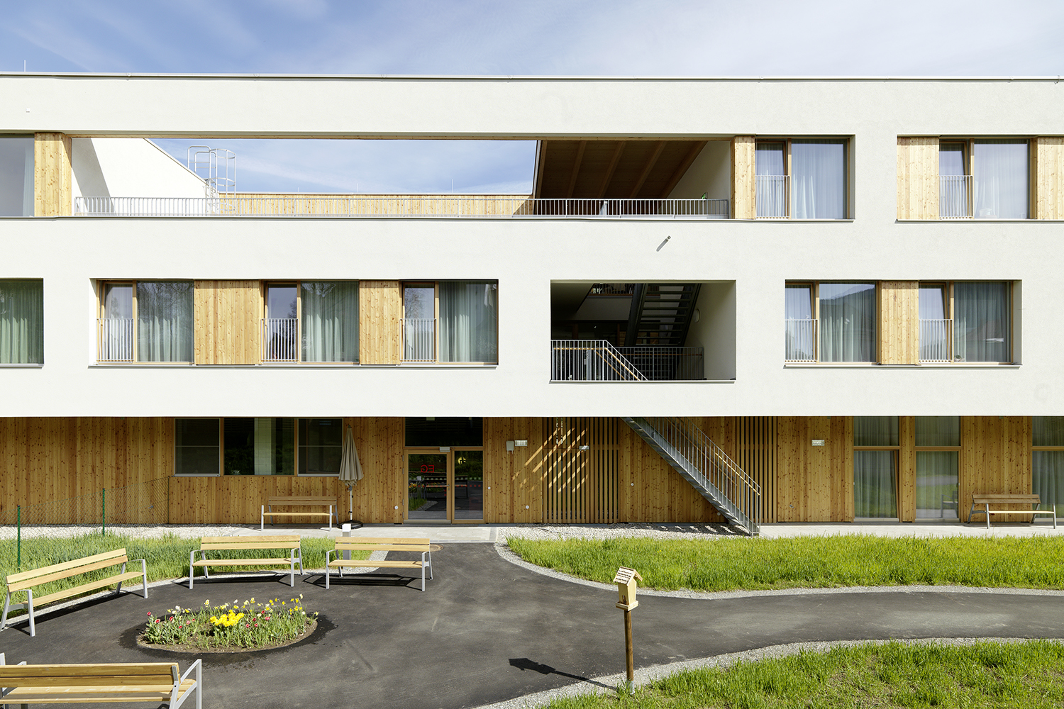 Das Raumprogramm erlaubte einen kleineren Zuschnitt des Erdgeschoßes, wodurch die Obergeschoße entlang der Nord- und Südseite auskragend ausgeführt wurden. Daraus ergeben sich schöne, witterungsgeschützte Außenbereiche und die Möglichkeit, die Fluchttreppen innerhalb der Gebäudeaußenkanten zu integrieren. Die geschoßweise differenzierte Nutzung bildet sich in einem lebhaften Fassadenspiel ab.