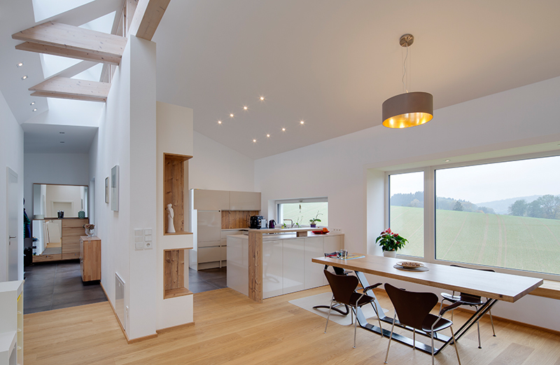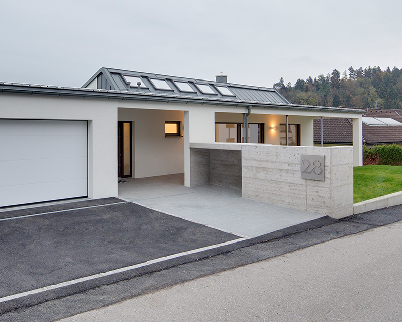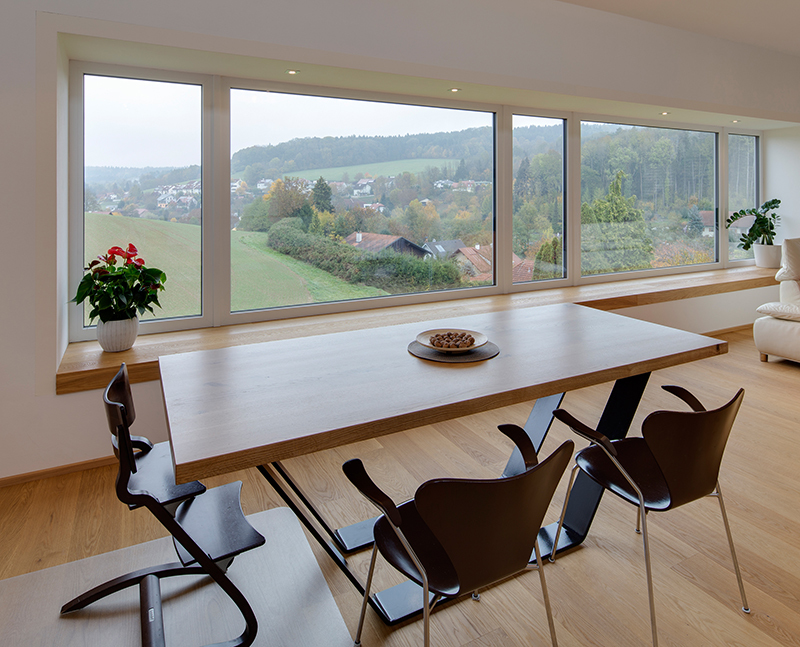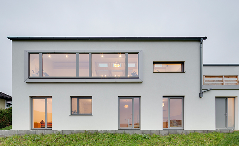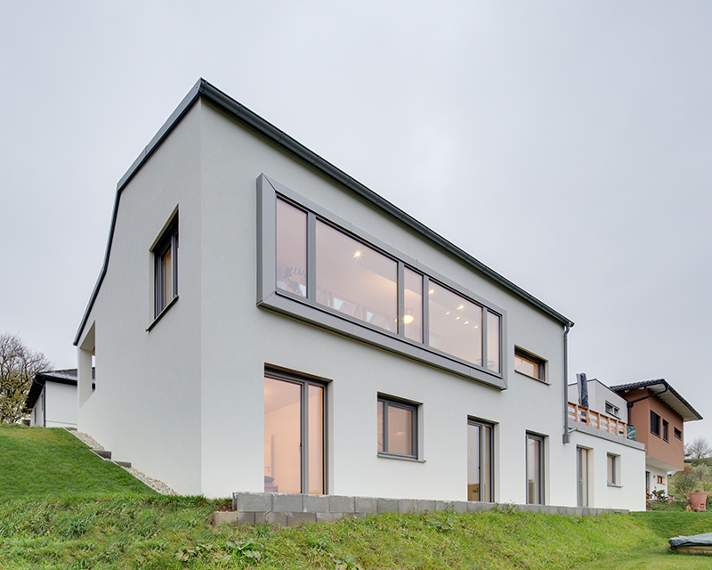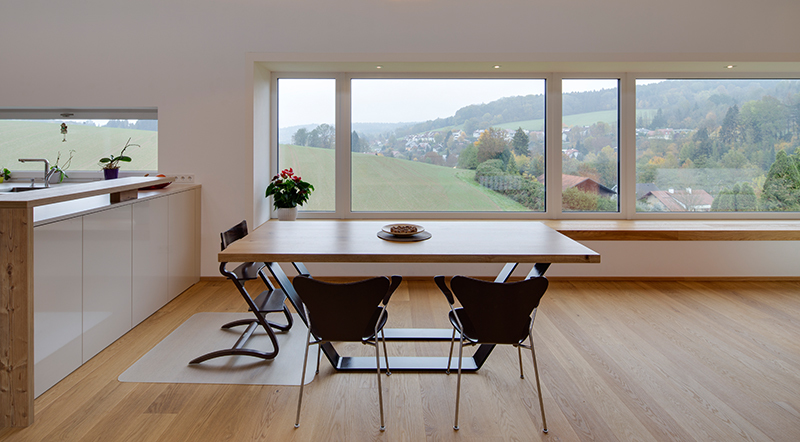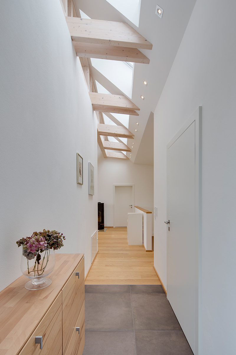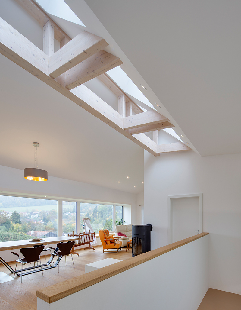 Die Grundrissstruktur ist klar, einfach und entspricht den gewünschten Wohnanforderungen einer vierköpfigen Familie: Dienende Nebenräume sind straßenseitig angeordnet, während sich die Wohn,- und Schlafräume Richtung Garten orientieren. Da sich trotz Nordhang alle Wohnräume in Richtung Garten orientieren, wurde eine Satteldachstruktur gewählt, die sich Richtung Süden mit einem großzügigen Oberlichtband öffnet. Diese Staffelung der Dachlandschaft ermöglicht einen großzügigen Lichteinfall für den gesamten Wohnbereich bei gleichzeitigem Wunsch nach innerer Geborgenheit. Im Innenraum erzeugt die sichtbare Dachlandschaft in Verbindung mit dem Oberlichtband ein harmonisches Licht- und Schattenspiel. Über die gesamte Länge des Wohn- und Essbereiches befindet sich ein durchgehendes Fensterelement welches als „Sitzerker ausgebildet ist, wodurch das weite Landschaftspanorama zum wichtigsten Teil dieser Ebene wird.