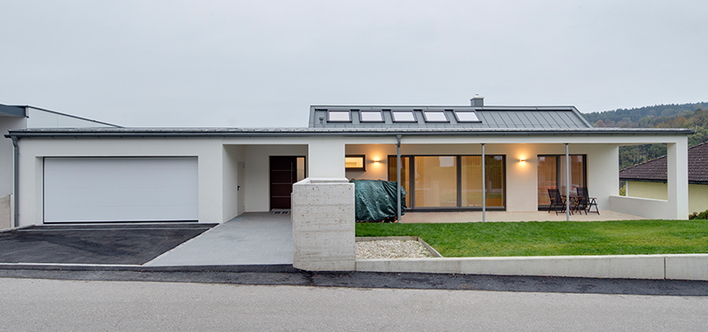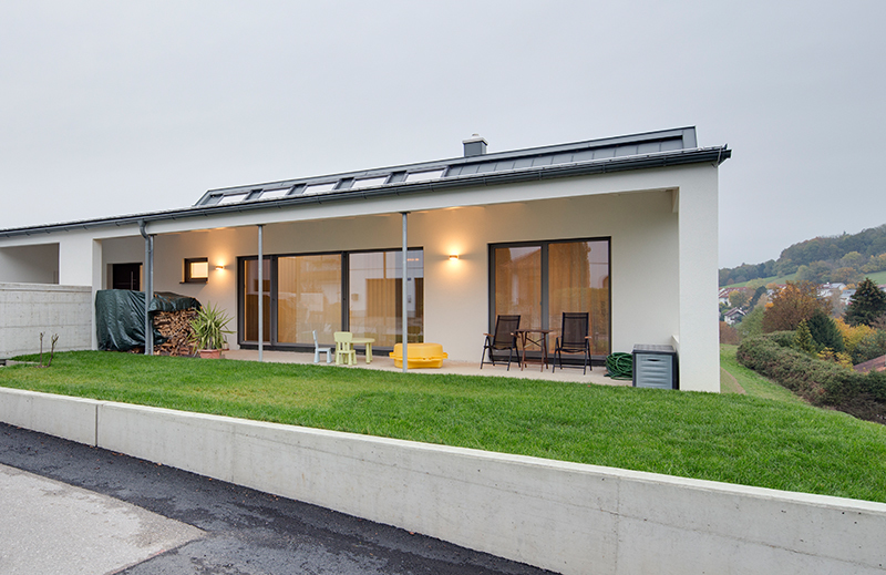 Das Niedrigenergiehaus, ausgestattet mit kontrollierter Wohnraumlüftung, Wärmepumpe und Sonnenkollektoren, wurde in Massivbauweise errichtet. (Text: Architekten)