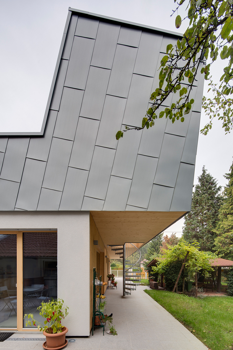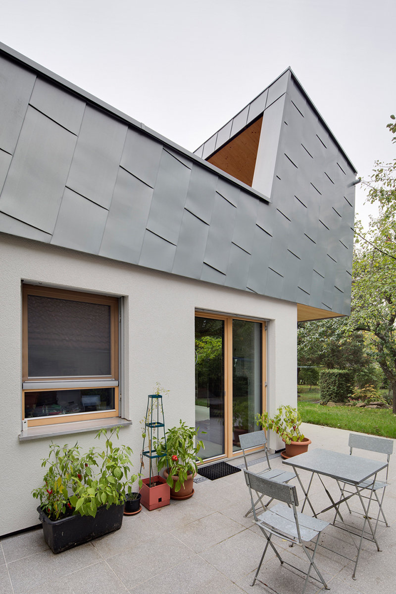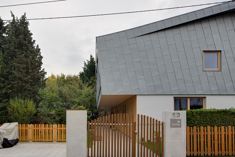 Der Entwurf nimmt nun dieses Thema der „Symmetrie-Asymmetrie“ auf, um durch die Aufstockung die verloren gegangene Harmonie wieder herzustellen: Insofern konnte dies nur ein Satteldach bewerkstelligen, um mit der Nachbarsilhouette verbunden zu bleiben. Da der Zugangsbereich mit dem auskragenden Obergeschoss einen gedeckten Zugang erhielt, wurde die Dachneigung gegenüber dem Nachbarn variiert. Zusammen mit der Verblechung bildet das Obergeschoss nun eine Art „Einschübling“, der jedoch die Symmetrie mittels des auf null auslaufenden Dachvorsprungs andeutet. Somit erhält die Haushälfte ihre Eigenständigkeit ohne auf seinen „Zwilling“ zu vergessen.