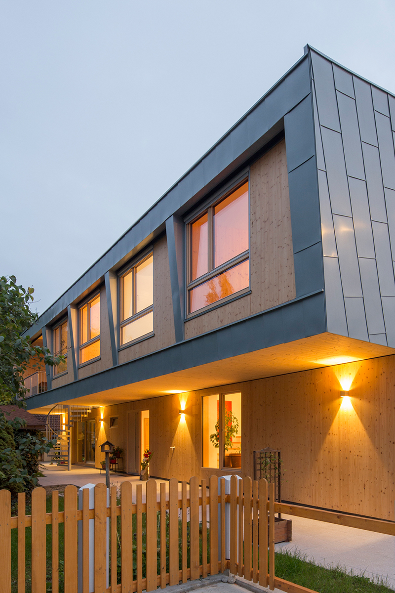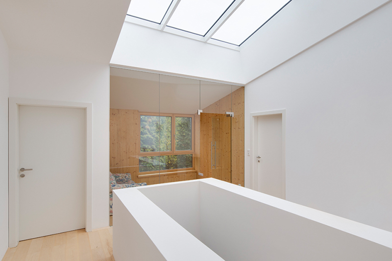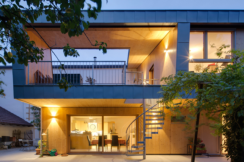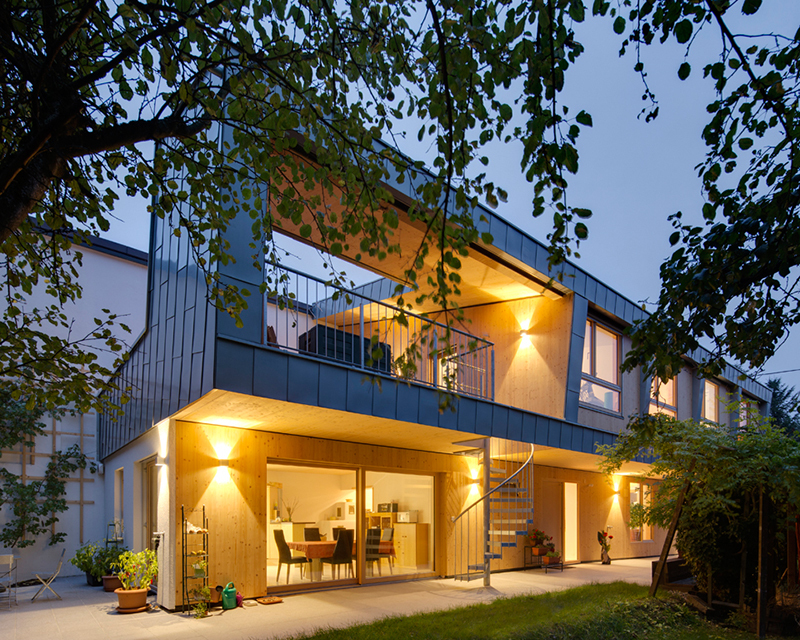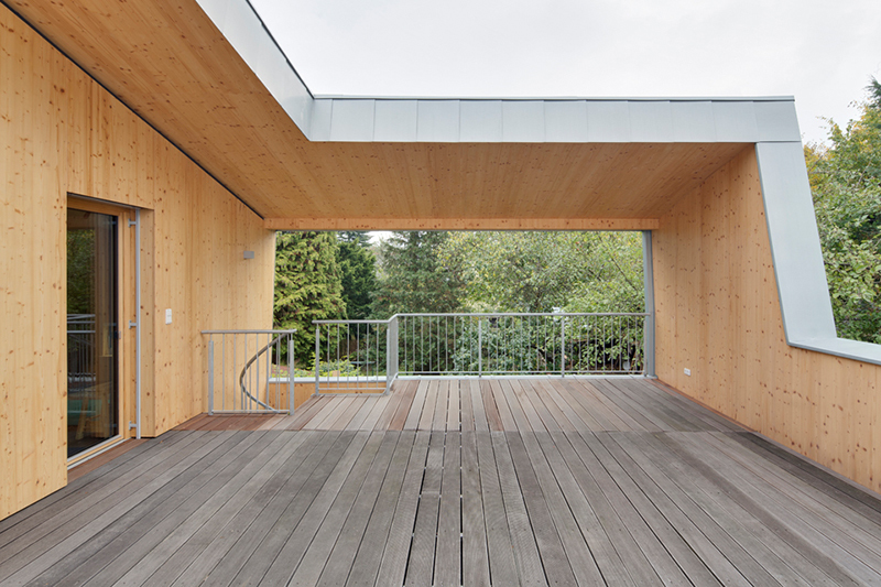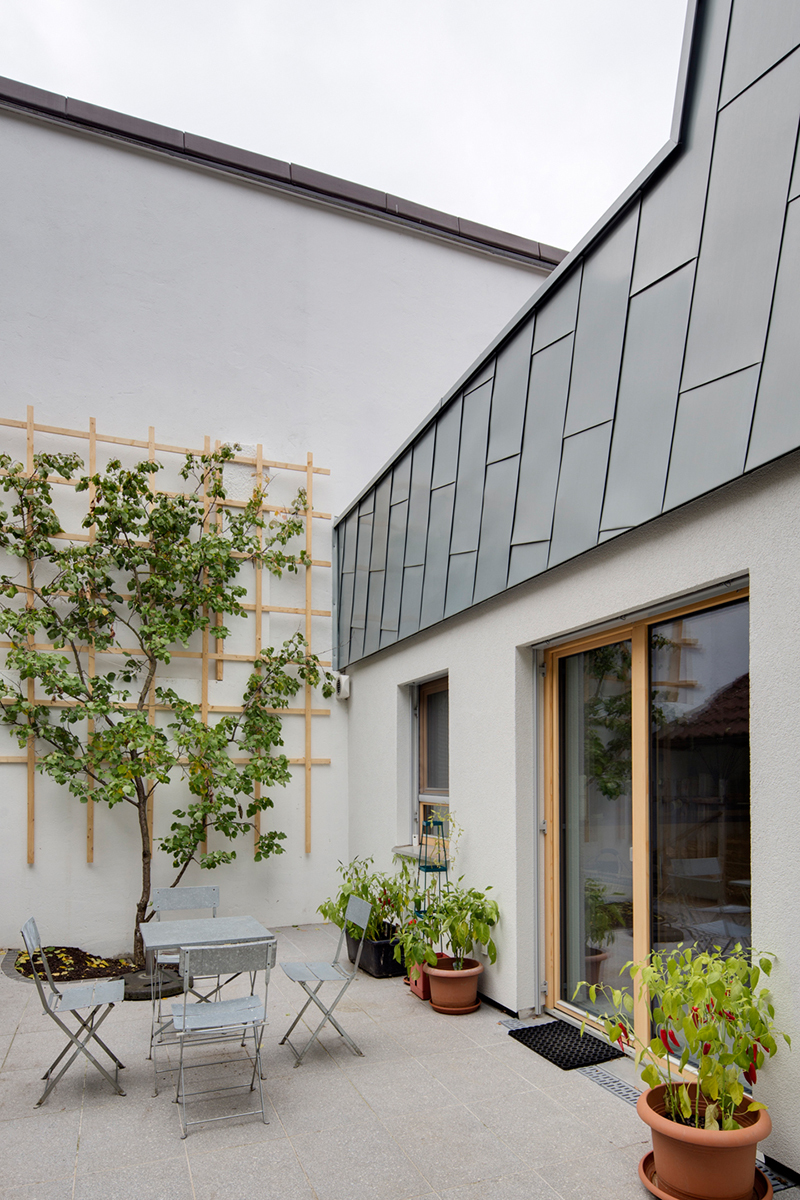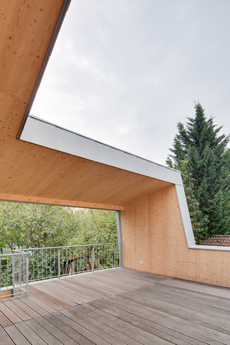 Da sich die Haushälfte Richtung Osten in den Garten orientiert, fehlte dem Haus und den Innenräumen die Nachmittagssonne. Durch die Ausbildung eines glasgedeckten Atriums wird nun das Gebäude für die Nachmittagssonne geöffnet. Die Gartenfassade kippt um einige Grad nach vorne um mit dieser Schräge des Daches dem gesamten Baukörper eine neue Einheit zu verleihen. Eine gedeckte, windgeschützte Terrasse im OG, die mit einer neuen Wendeltreppe mit dem Garten verbunden ist, steigert zusätzlich die funktionalen Qualitäten. Die Terrasse bietet somit einen erhöhten Freisitz mit einem gerahmten Blick in den Garten. (Text: Architekten)