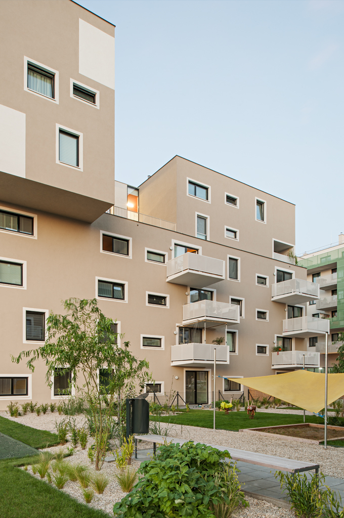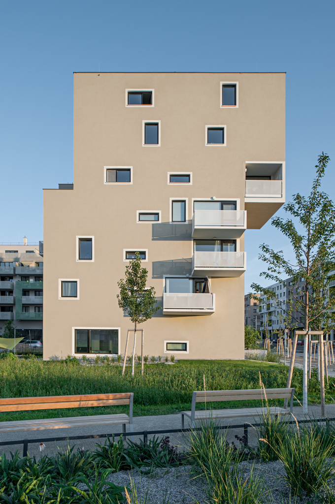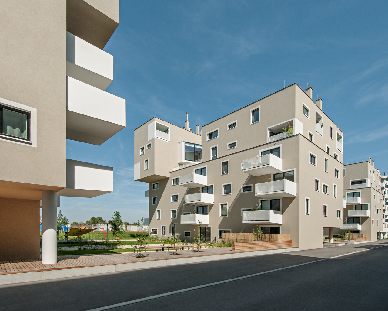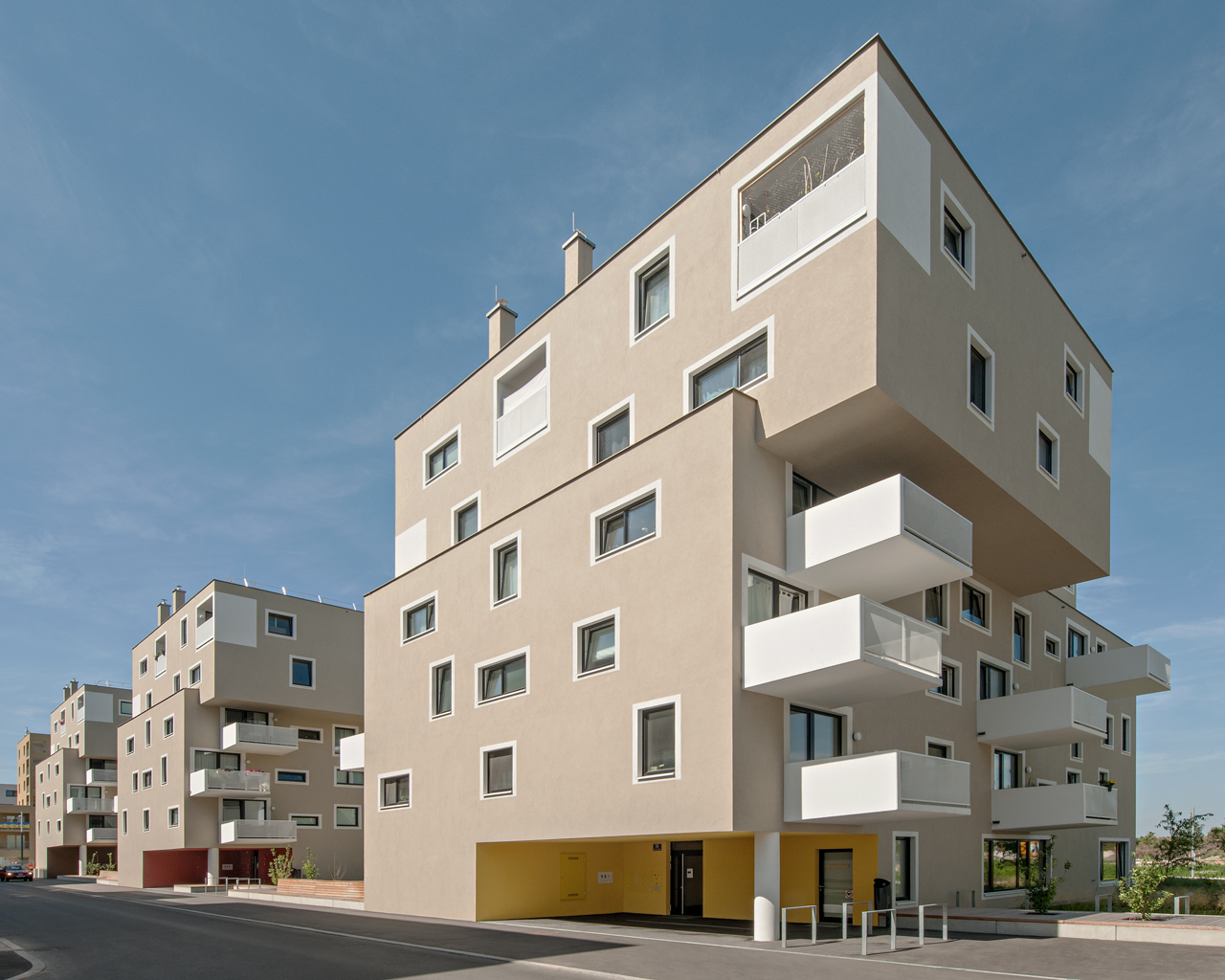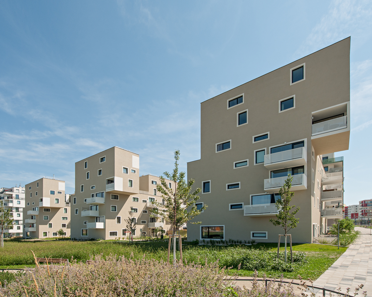 Die Wohnungstypologie weist eine sehr kompakte Struktur, minimale Erschließungsflächen und eine durchschnittliche Wohnungsgröße von 70 m² auf. Der Großteil der Wohnungen sind 2-Zimmer SMART-Wohnungen. Es wird eine Kombination von A- und C-Typen angeboten, welche miteinander verbunden werden können, sodass hier ein nebeneinander von Generationen erleichtert wird (intergeneratives Wohnen). Dabei werden einzelne Wohnungsgrundtypen, zu Großwohnungen verknüpft und können später für einzelne Personen, sowohl Jugendliche als auch ältere Menschen, innerhalb des Wohnungsverbandes wieder abgeteilt werden. (Text: Architekten)