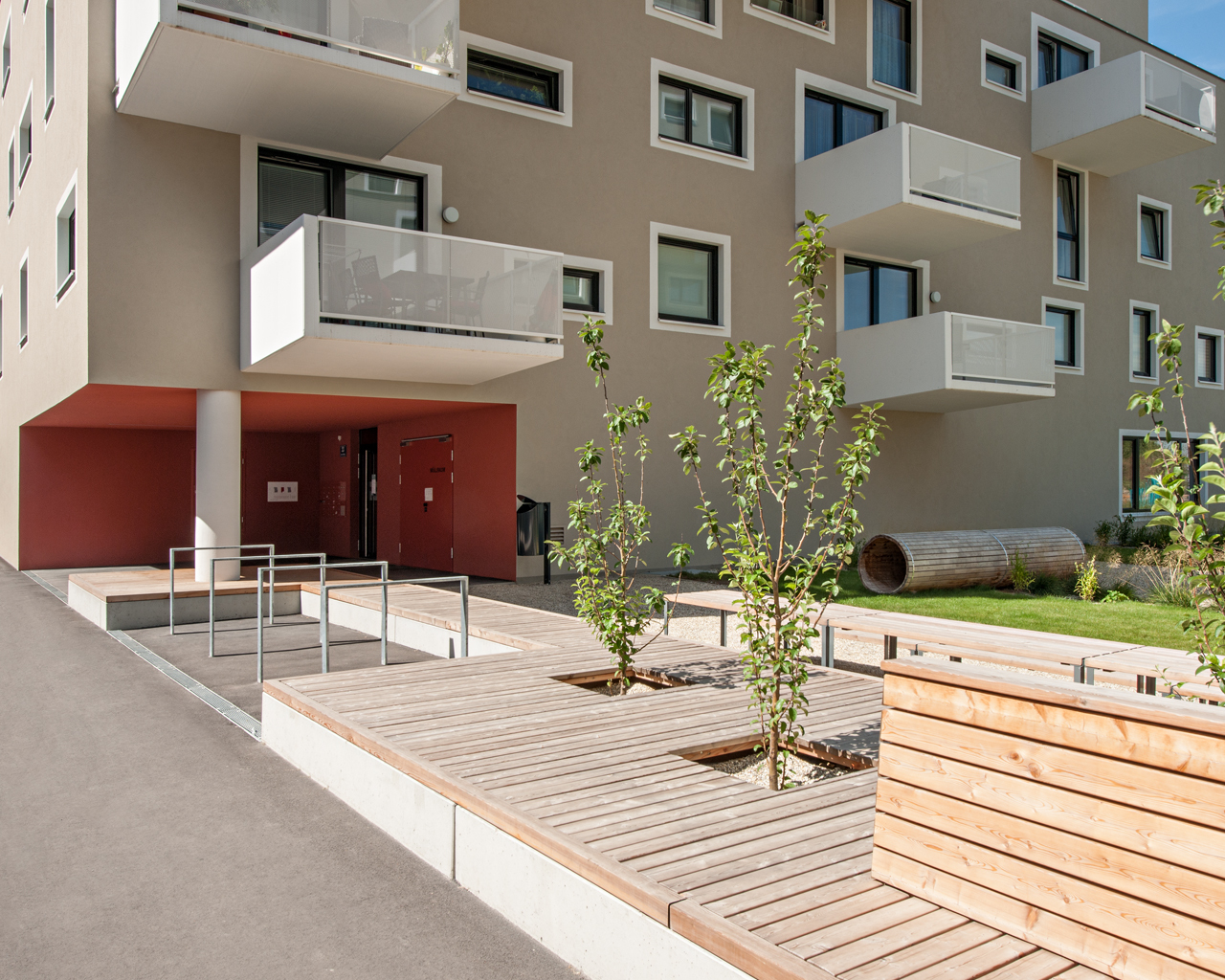 Introvertierte, hofähnliche Situationen und parkartige Szenarien schließen an extrovertierte, straßenraumbezogene Räume an. Die großen Innenhöfe bieten eine differenzierte Freiraumgestaltung mit öffentlichen, halböffentlichen und privaten Bereichen an. Im Übergangsbereich zum Straßenraum schaffen Sitz- und Trennmöbel gemeinsam mit der Bepflanzung eine „Barriere“ zur Öffentlichkeit.