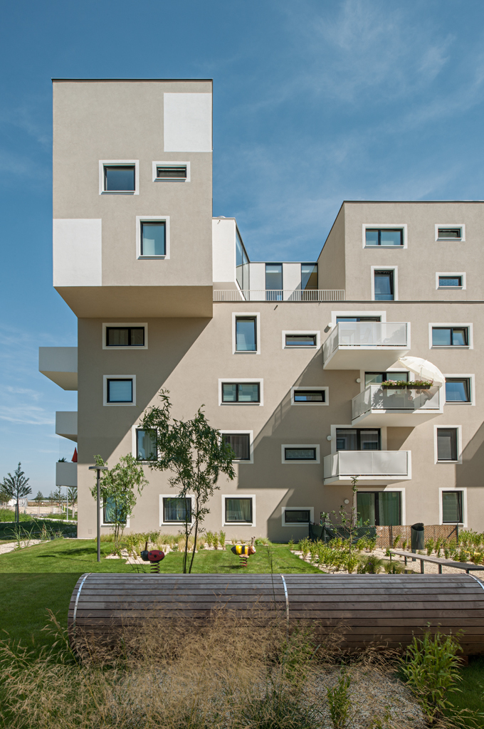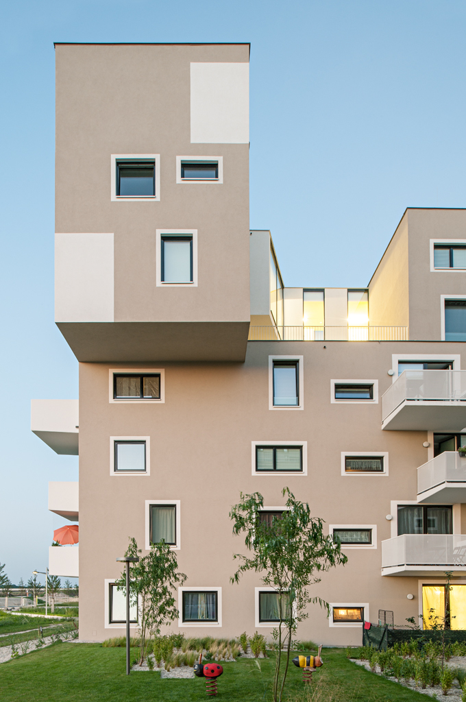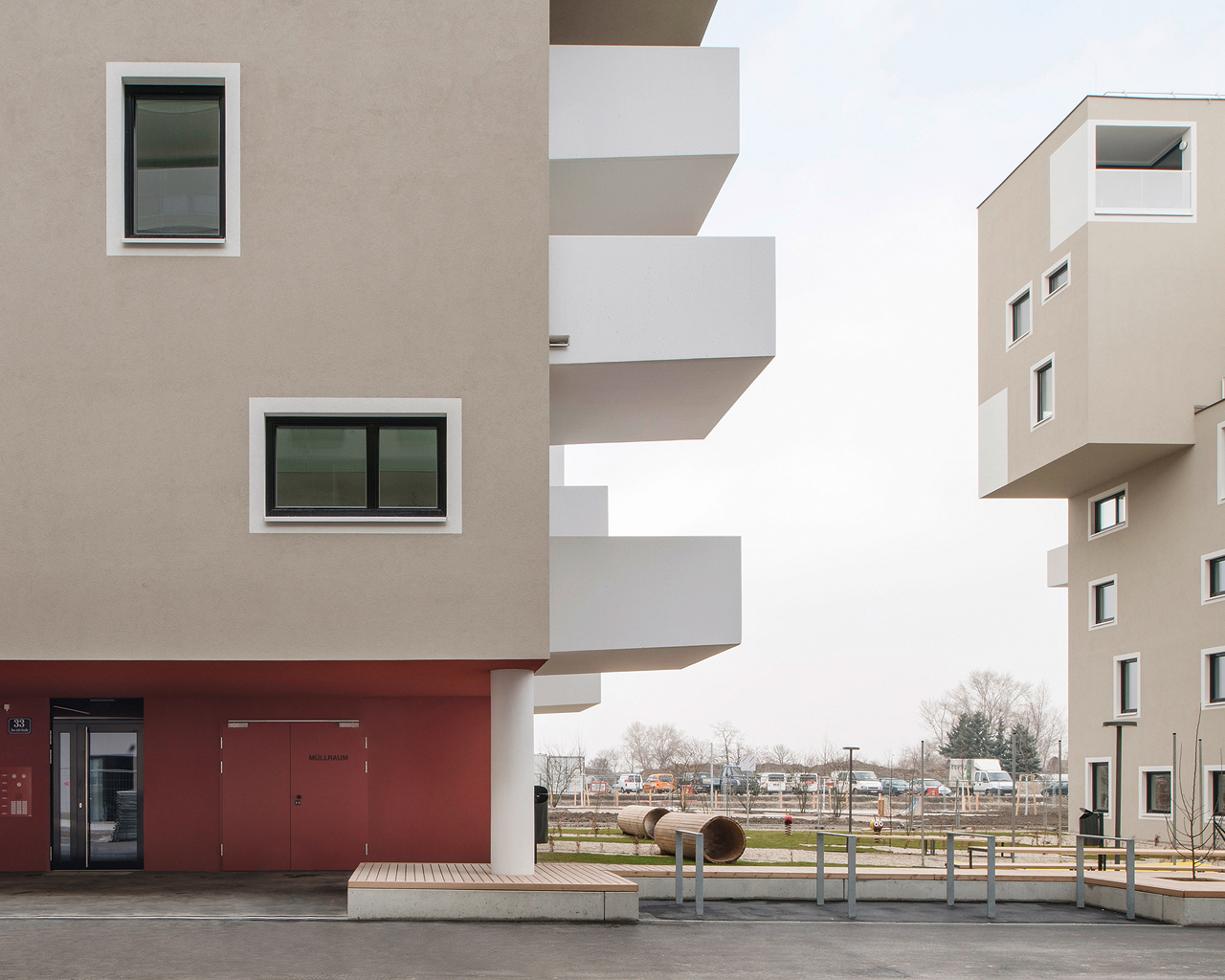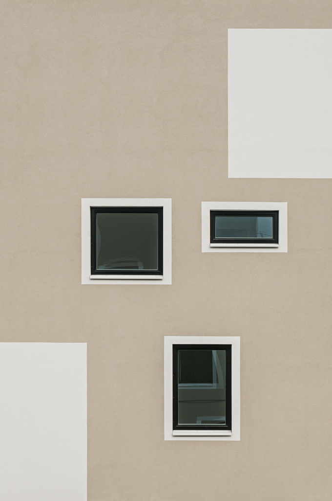 Die einfachen Lochfassaden weisen jeweils 4 verschiedene Fenstergrößen auf, die durch Ihren unterschiedlichen Versatz und die Proportionen als Fläche wirken. Unterschiedliche Wohnungsgrundtypen mit jeweils speziellen, zugeordneten Freiräumen werden zu einer neuen Typologie gestapelt. Allen Wohnungen ist eine große, individuelle Freifläche zugeordnet.