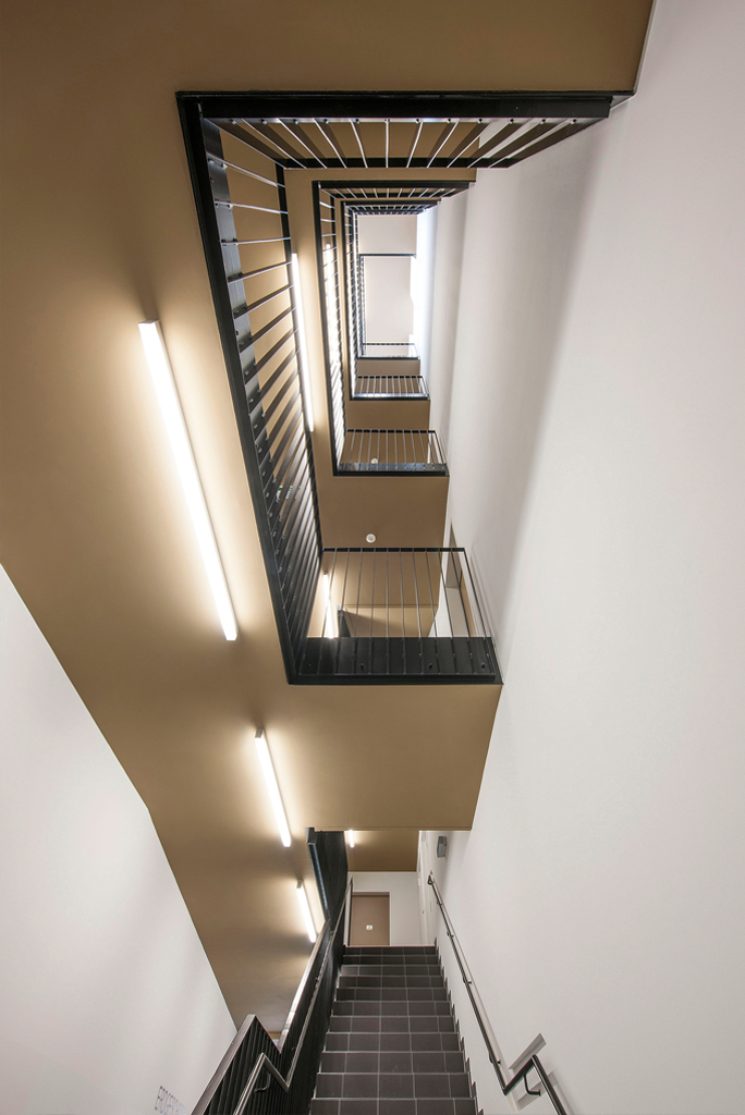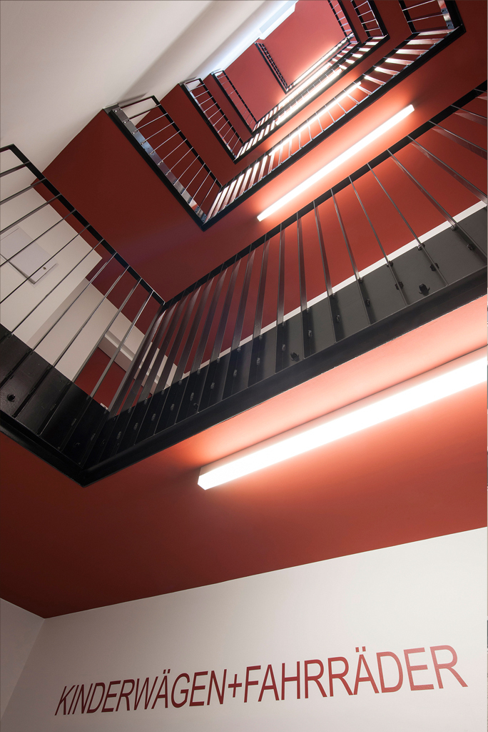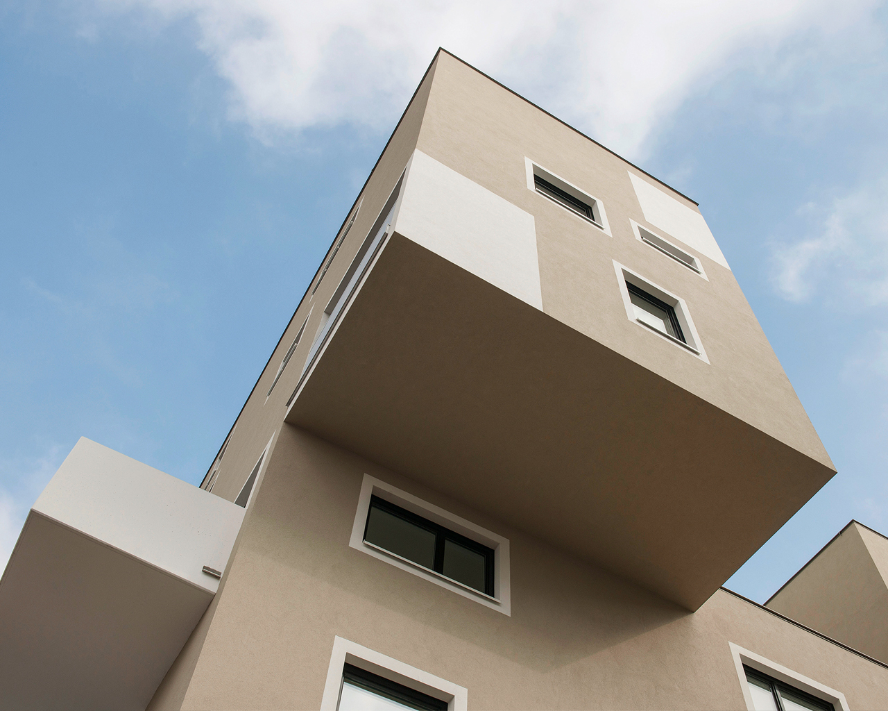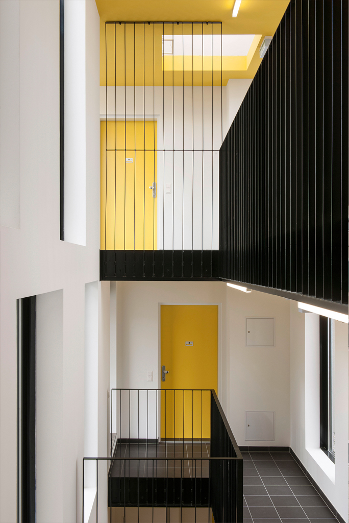 Die einfachen Lochfassaden weisen jeweils 4 verschiedene Fenstergrößen auf, die durch Ihren unterschiedlichen Versatz und die Proportionen als Fläche wirken. Unterschiedliche Wohnungsgrundtypen mit jeweils speziellen, zugeordneten Freiräumen werden zu einer neuen Typologie gestapelt. Allen Wohnungen ist eine große, individuelle Freifläche zugeordnet.