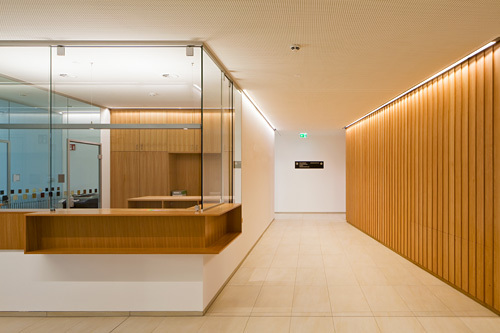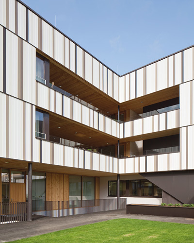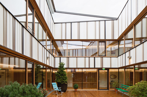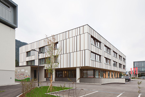 Sowohl die Außenwände als auch die Wände rund um die Höfe erhielten eine vertikale Stülpschalung mit hinterlüfteten Faserzementpaneelen. Unregelmäßig angeordnet verleihen die in Weiß und in verschiedenen Braunschattierungen gehaltenen Paneele dem Sozialzentrum Kundl ein charakteristisches Erscheinungsbild. (Text: Claudia Wedekind)