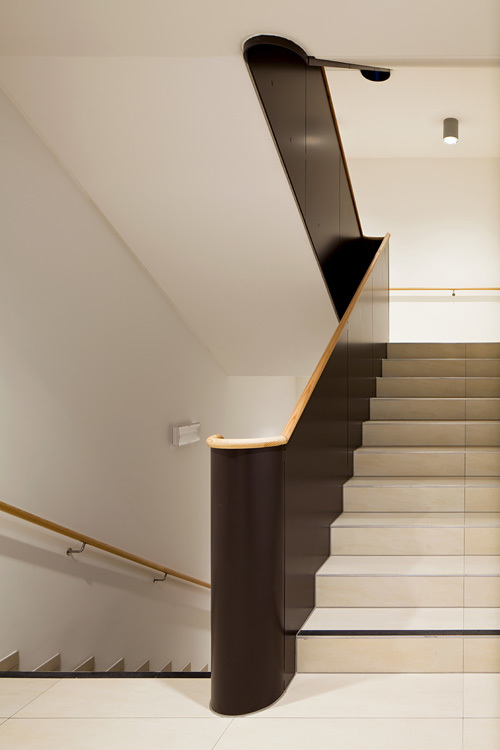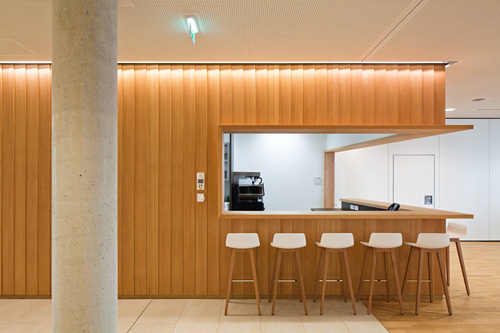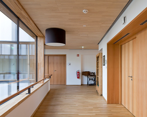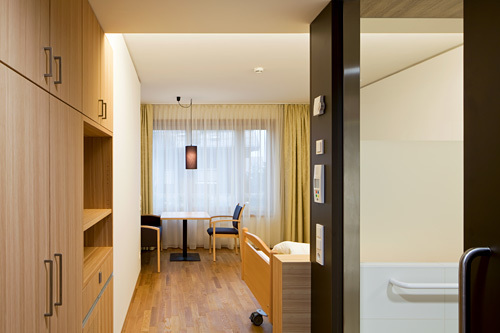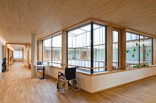 In den Obergeschossen sind pro Geschoss zwei Wohngruppen untergebracht, in sich abgeschlossene Einheiten aus 14 Einzelzimmern mit jeweils eigener Küche, Essbereich und einer großen Loggia. Diese „Wohnstuben“ sind spiegelbildlich und versetzt zueinander angeordnet, in ihrem Schnittpunkt liegen der Erschließungskern und der Pflegestützpunkt, womit ein rationeller Betrieb ermöglicht wird. Im Zentrum jeder Wohngruppe befindet sich ein unregelmäßig geformtes Atrium, das zusammen mit den Loggien eine lichtdurchflutete Innenraumsituation schafft. Die breiten, hellen Gangflächen rund um das Atrium gehen nahtlos in die Aufenthaltsbereiche über und sind so selbst Teil der Gemeinschaftsfläche, Details wie ein Handlauf aus Holz entlang der Fensterfront gehen auf die Bedürfnisse der Bewohner:innen ein.