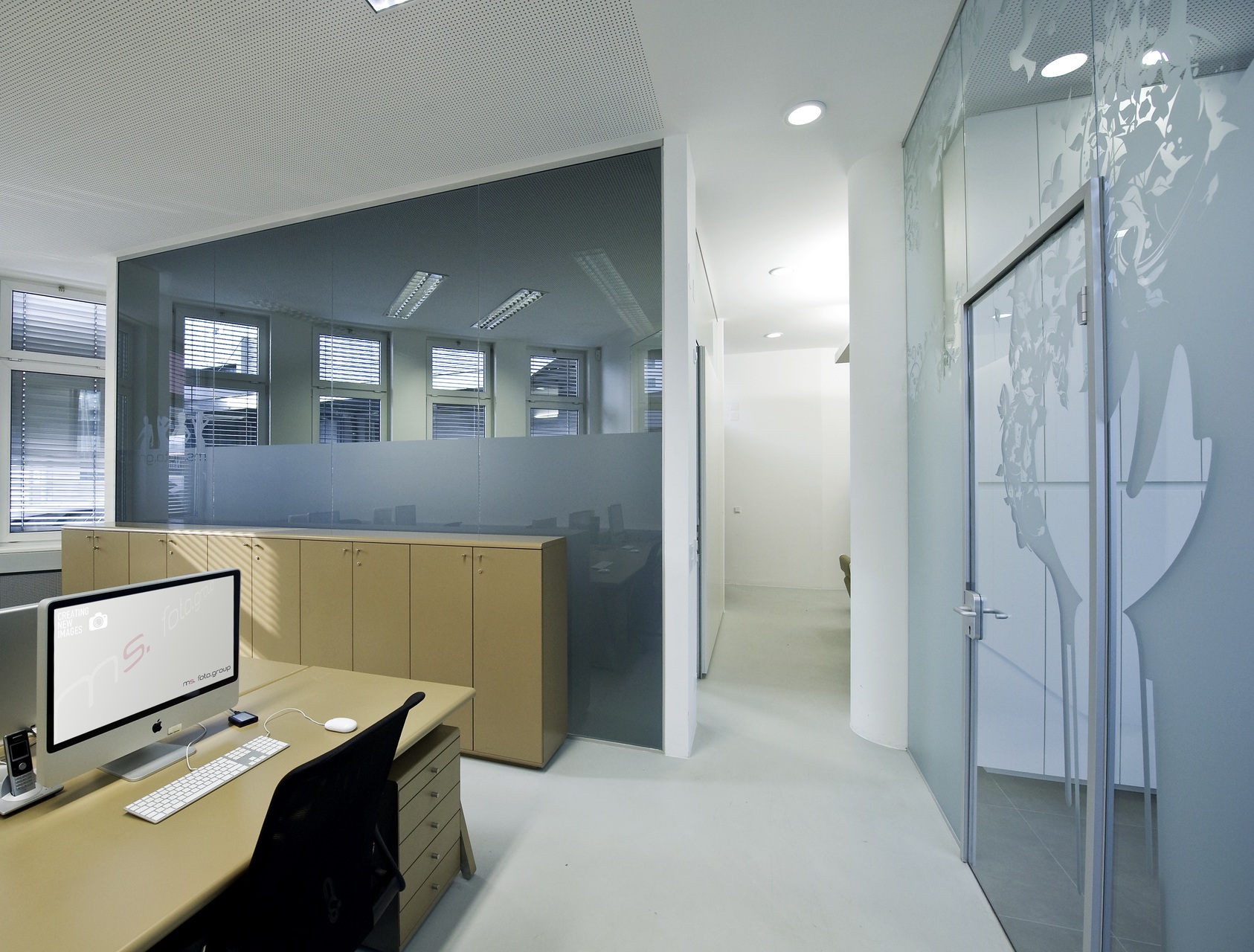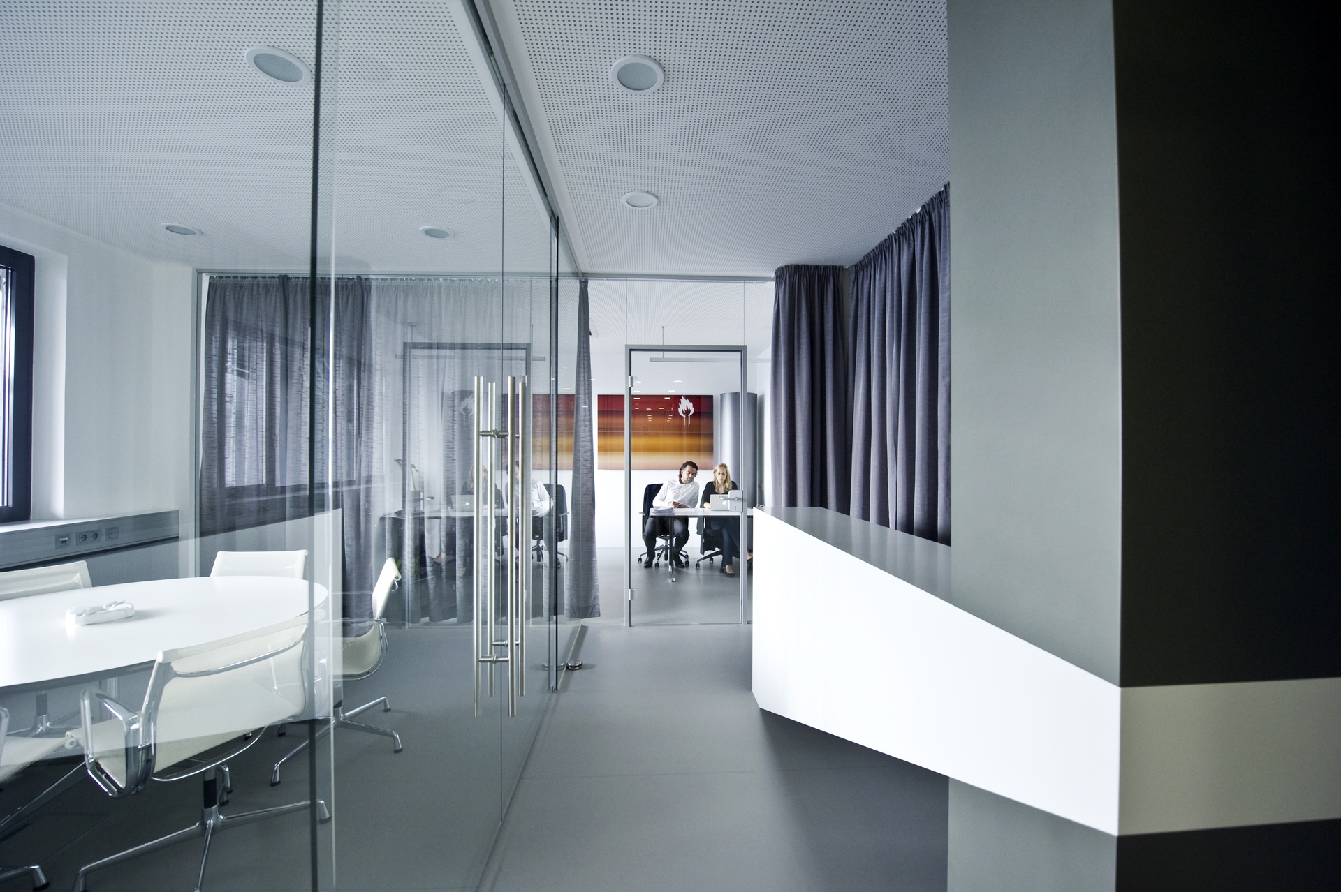 Der Umbau beinhaltet den Empfangsbereich, ein offen angelegtes Großraumbüro, eine Lounge-Situation und neue representative Chefbüros. Auch die Arbeitsplätze der Grafikabteilung, der Bildbearbeitung und der Buchhaltung wurden durch eine räumliche Neuorganisation optimiert. (Text: Architekten)