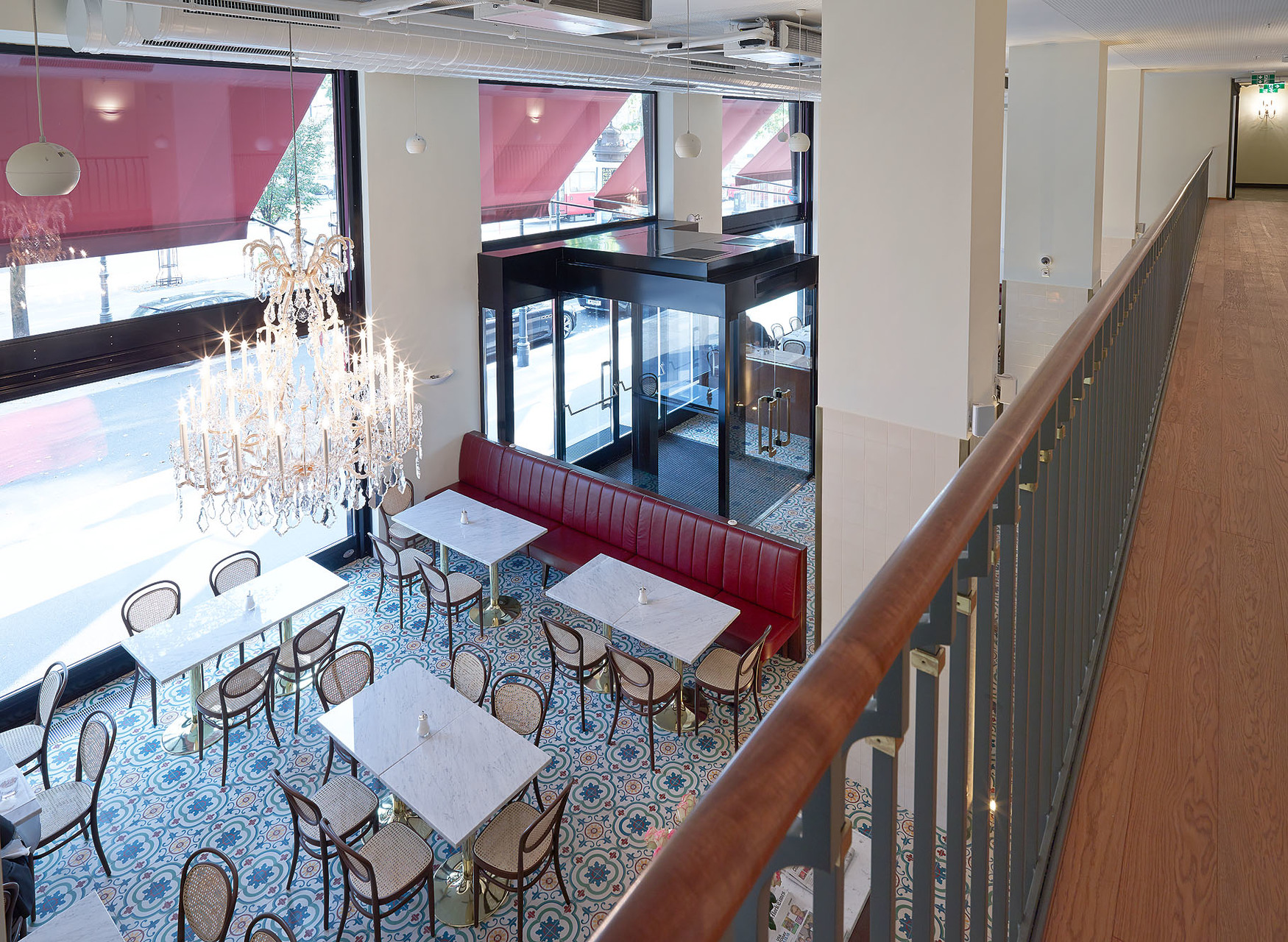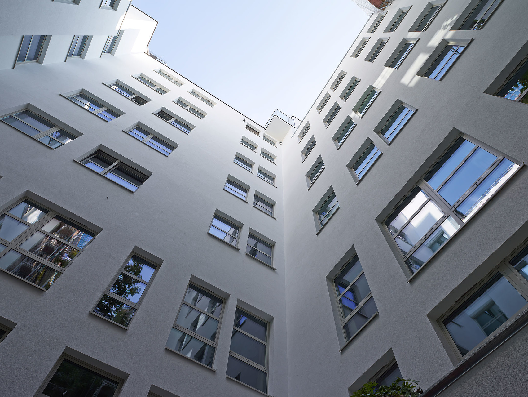 Im Mittelpunkt des architektonischen Konzeptes steht die Öffnung des Erdgeschosses über zwei Etagen. Die großzügige Raumhöhe trägt die gewonnene Weiträumigkeit nach außen. Ein Durchblick zum neu geschaffenen Innenhof lockt von der Straße in das Gebäude hinein. In halber Höhe befindet sich eine Galerieebene, auf der ein Steg zu den Büroräumen führt und die Hoftrakte verbindet. Auch einer der beiden „Schlafsäle“ ist hier untergebracht.