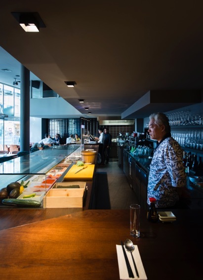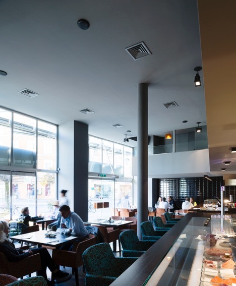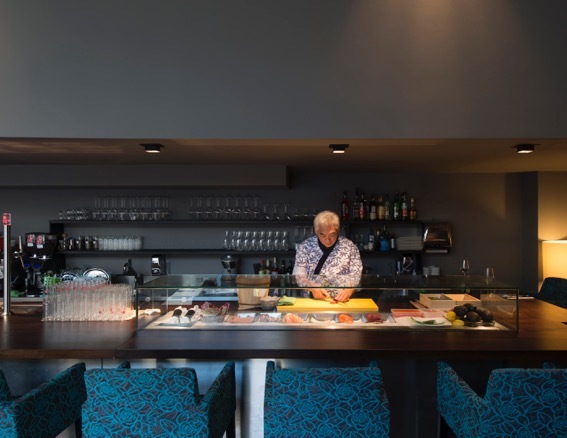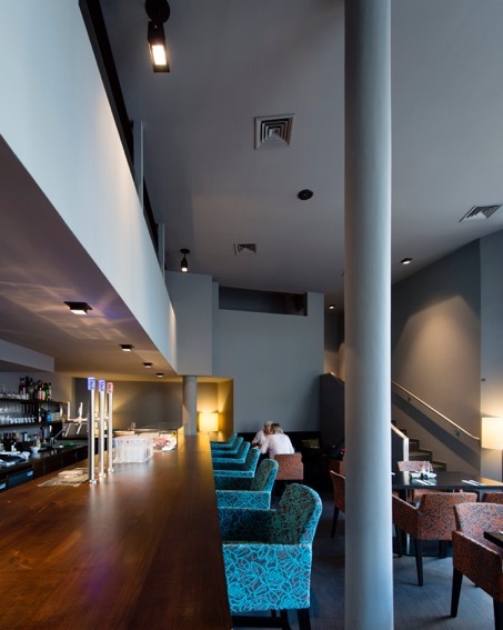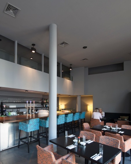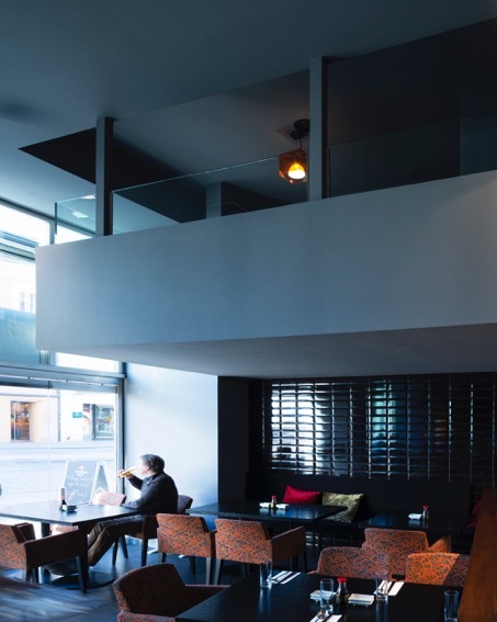 Unter diesen Voraussetzungen mussten sowohl der graue, großformatige Fliesenboden, als auch alle Rigipsdecken erhalten werden. Aus dieser pragmatischen Entscheidung entwickelte sich der wichtigste Entwurfsansatz: alle Oberflächen wurden – nach Verschluss der unzähligen „Spotöffnungen“ – in einem Grau ähnlich dem Boden gestrichen, die Küchen- und Barmöbel in Edelstahl ausgeführt und eine überbreite Bar-Arbeitsplatte in dunklem Holz auf die technischen Korpusse gelegt. Die notwendige, in Schwarz ausgeführte Verfliesung hinter der Kochstelle, zieht sich an einer Wand hinaus in den Gastbereich, um diesen, ebenso wie durch die Metallmöbel, unkompliziert mit der offenen Küche zu verbinden. Mit einfachen, leicht gelblich leuchtenden Stehlampen und bequemen, mit orangem bzw. türkisem floralen Stoff gepolsterten Stühlen wird Wohnlichkeit und Wärme in die zurückhaltend graue Raumplastik gebracht, in der Kochen und Essen recht uninszeniert miteinander verbunden sind.