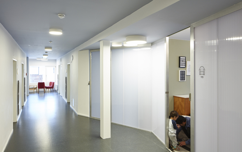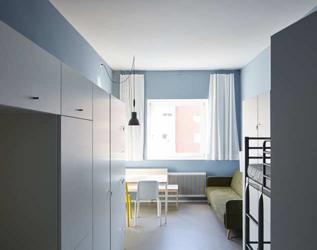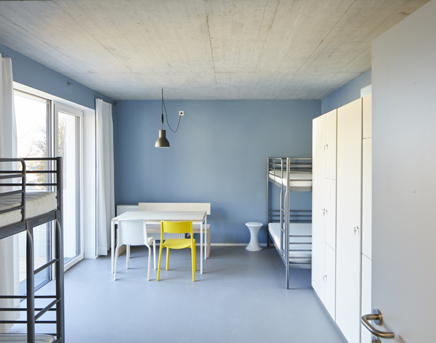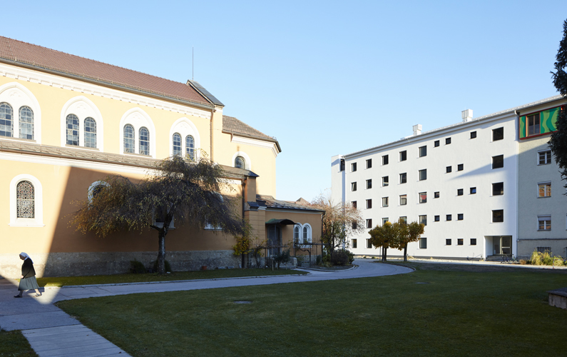 Noch vor dem Akut-Werden der Flüchtlingskrise beschloss die Ordensgemeinschaft der Barmherzigen Schwestern in Innsbruck 2014, eine Unterkunft für Menschen auf der Flucht zu schaffen und damit gemäß ihrem Glaubensgrundsatz das Wort in die Tat umzusetzen. Sie stellten sowohl das ehemalige Internatsgebäude auf dem Areal ihres Ordenshauses im Saggen, als auch die zur Sanierung und Erweiterung des Gebäudes notwendigen finanziellen Mittel zur Verfügung und ermöglichten damit, dass für über 130 Menschen auf der Flucht eine erste Unterkunft realisiert werden konnte.Unter der Prämisse, die vorhandenen Mittel bestmöglichst zu nutzten, wurde das aus den 1960er Jahren stammende Mädcheninternat generalsaniert und um einen Zubau inkl. Treppenhaus erweitert. Auf fünf Stockwerken wurden jeweils Wohngemeinschaften für 25 bis 27 Menschen eingerichtet, die sich eine Küche und – bis auf eine Zimmereinheit - auch die Sanitärräume teilen. Im Bestand gab das vorhandene Grundraster die Zimmergrößen vor, die jeweils für 3 Personen gedacht sind, wobei für größere Familienverbände ein Nachbarzimmer mittels einer Verbindungstür angekoppelt werden kann. Im Anbau wurden 4-Personen-Zimmer eingerichtet, die zum Teil auch über einen eigenen Balkon verfügen. Herzstück jeder Wohngemeinschaft ist das gemeinsame, zentral gelegene Wohnzimmer, außerdem gibt es pro Stockwerk einen weiterer Allgemeinraum, z.B. einen Kinderspielraum, Fitnessraum, Lernraum oder ein Nähzimmer. Nachdem der bestehende Gang mit seinen parallel verlaufenden Wänden einen nicht gewünschten Anstaltscharakter vermittelte, wurde die Wand in der Gangmitte – vor den Gemeinschaftsräumen – aufgebrochen und durch schräg gesetzte Kunststoffverglasungen und Schiebetüren aufgeweitet. Die damit akustisch nicht sehr wirksame Abtrennung der Wohnzimmer und Gemeinschaftsräume vom Gang wurde bewusst so gewählt – ist doch die Versuchung einer Funktionsänderung aufgrund des ständig steigenden Bedarf an Betten groß. Aber gerade jene Räume, die ein gemeinsames Miteinander ähnlich dem Leben im privaten Familienverband ermöglichen, sind für ein qualitätvolles Wohnen in der Gemeinschaft notwendig.