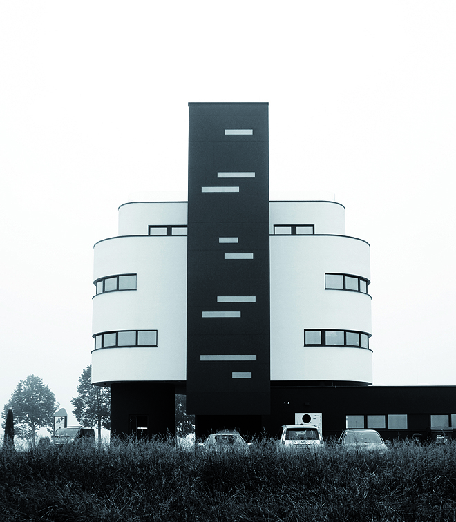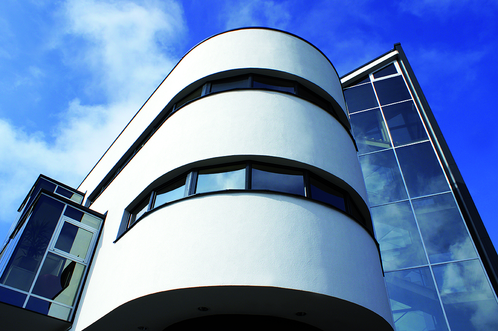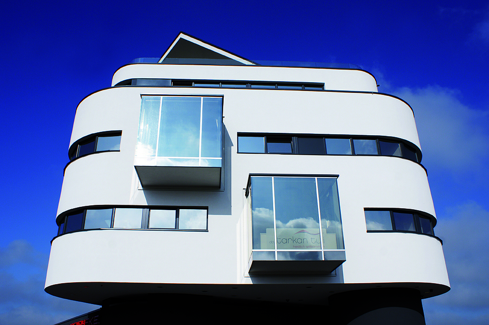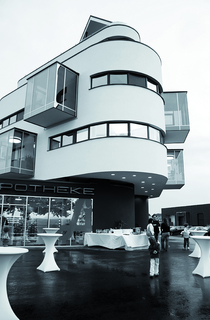 Der massive Baukörper nimmt mit seiner skulptural geformten und gerundeten dreiecksförmigen Grundrisskonfiguration die umgebende Landschaft auf und streckt sich mit den überdimensionierten Glaskuben weit in das schöne Aussen nach Luft und Sonne aus.
