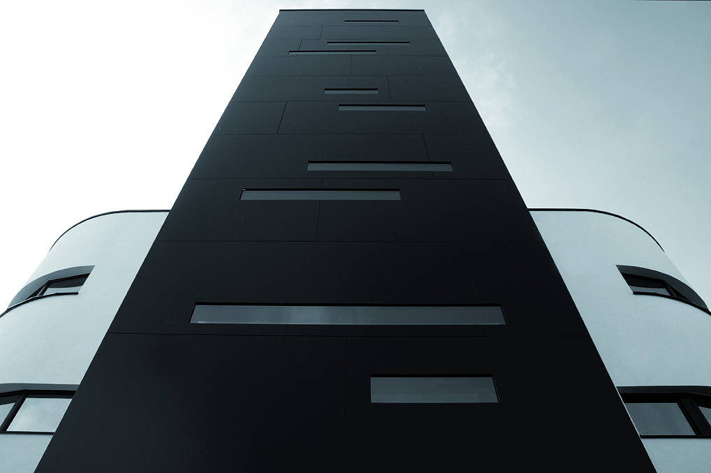 Die Erschliessung des Gebäudes bildet das Rückgrat des vertikalen Hauptbaukörpers und betont die turmartige, zeichenhafte Gestalt des Hauses. Durch ein intern errichtetes Heizwerk kann der Neubau sehr effizient mit Energie versorgt werden und die überschüssige Heizleistung für die umliegenden Bauten ins Netz speisen.