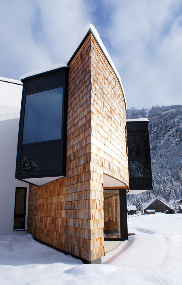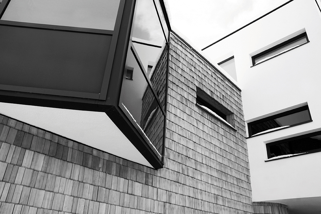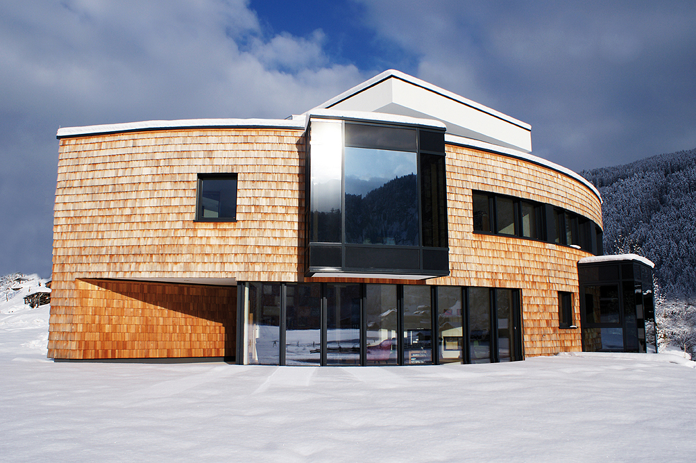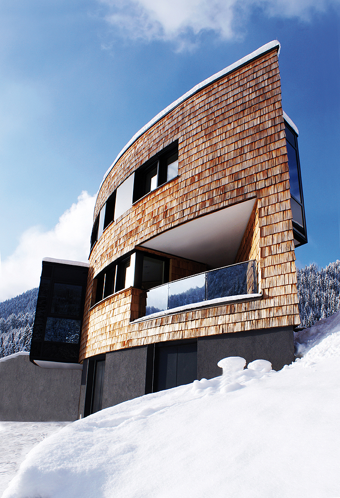 Das Dachgeschoss wurde nach oben hin zurückgestuft, und parallel zum Hang gebaut.