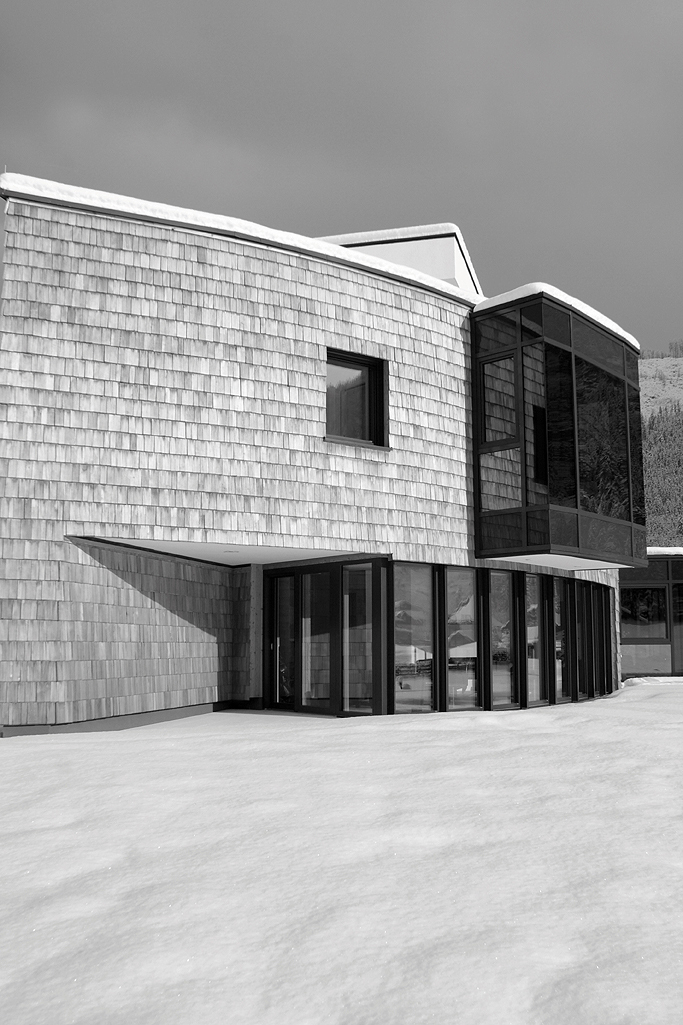 Der zeitgemässe Baukörper besticht durch seine klare, geometrische Form, die sich einerseits an den flachen Hang anschmiegt und sich andererseits in die Landschaft ausstreckt. Der auskragende Bauteil im Erdgeschoss unterstreicht den Bezug zum Hang und bietet gleichzeitig Schutz vor Sonne und Regen.