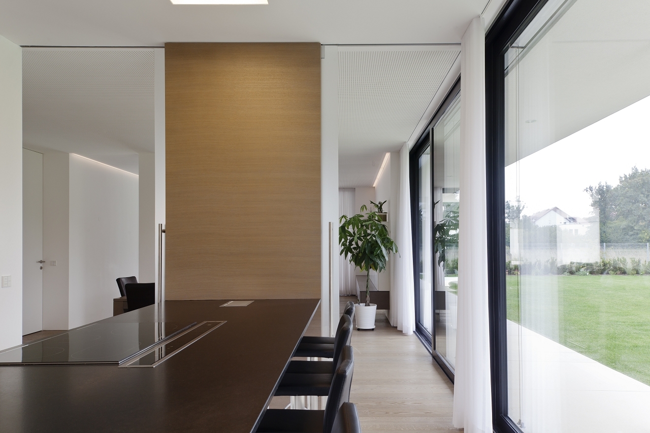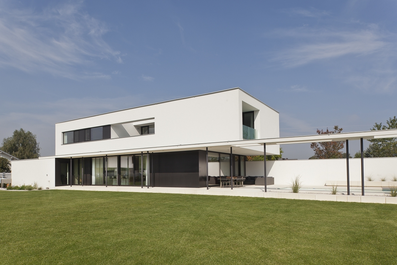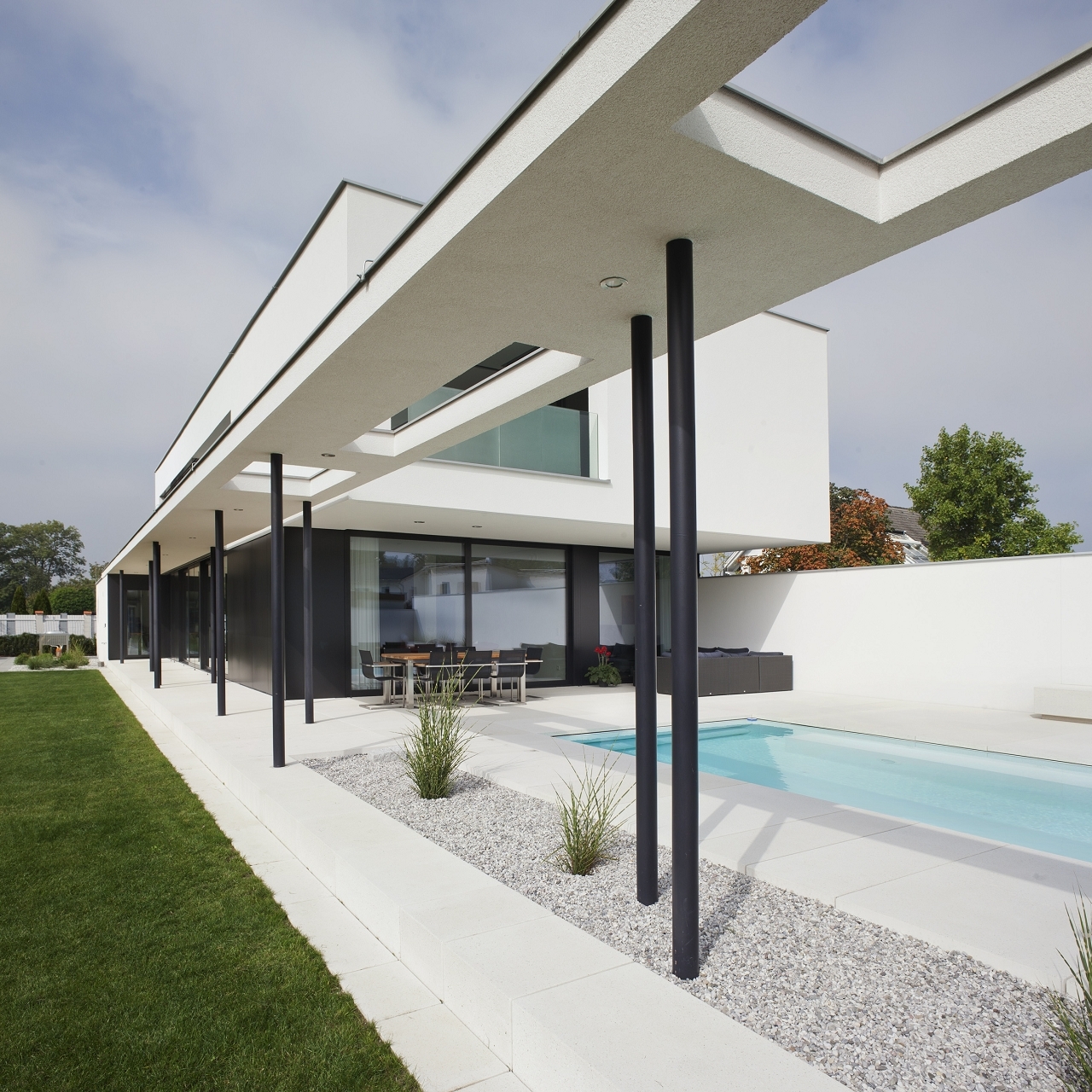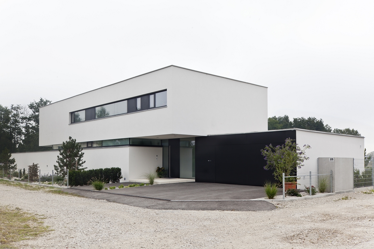 Das Obergeschoss scheint zu schweben, liegt optisch nur auf dem Garagenbaukörper auf und bildet mit seiner Auskragung einen klar erkennbaren und geschützten Eingangsbereich.