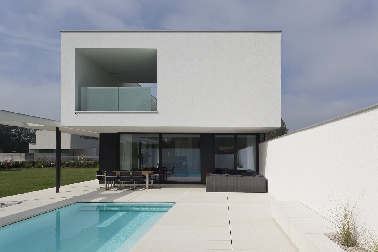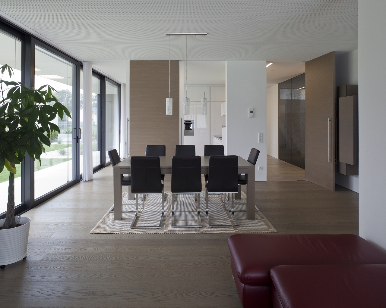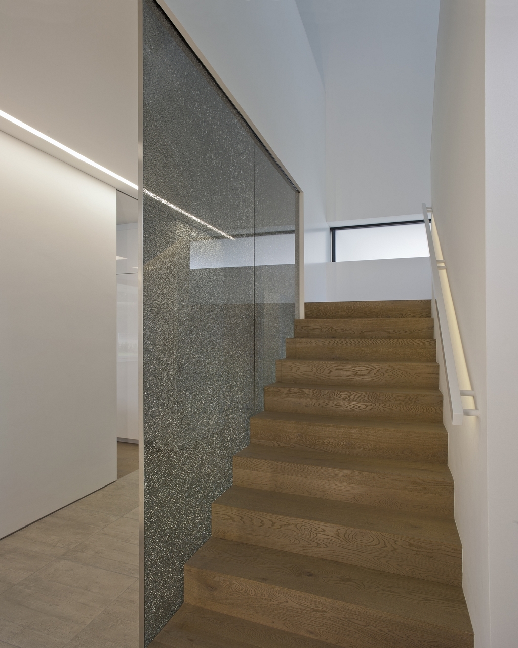 Das Obergeschoss scheint zu schweben, liegt optisch nur auf dem Garagenbaukörper auf und bildet mit seiner Auskragung einen klar erkennbaren und geschützten Eingangsbereich.