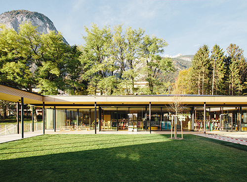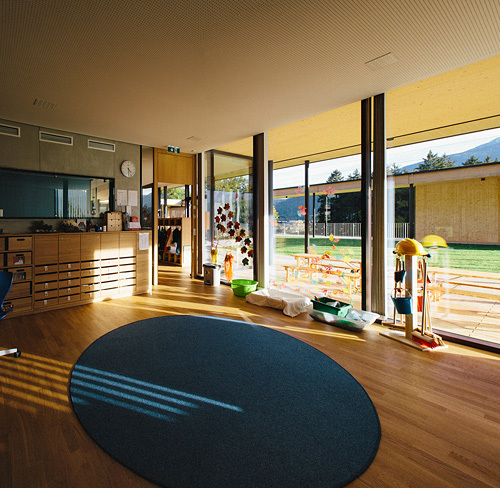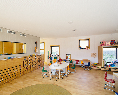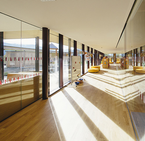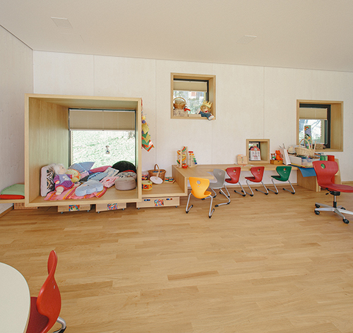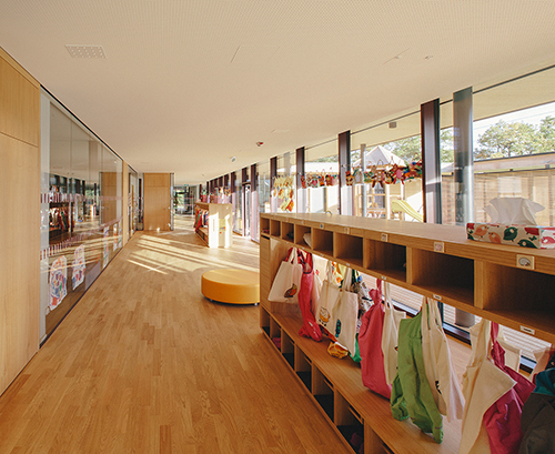 Im Unterschied zu einem klassischen L-förmigen Atrium liegt die Erschließung der Gruppenräume nicht an der nördlichen Außenseite, sondern zum Garten hin. Vom Innenhof aus bildet der überdeckte Außenraum der Terrassen eine erste Raumschicht, auf die die Erschließungs- und Garderobenzone als verglaster, überdeckter Innenraum folgt. Die dahinter liegenden Gruppen- und Teilungsräume öffnen sich damit Richtung Garten, während sie zu den Allgemeinflächen hin weitgehend geschlossen sind. Gezielt gesetzte Fenster unterschiedlicher Größe erlauben vielfältige Sichtbeziehungen und sind mit ihren tiefen Laibungen gleichzeitig als Stell- oder Sitzfläche nutzbar, Alkoven bieten den Kindern Rückzugsnischen. Indem der Kindergarten gegenüber dem westlich gelegenen Spielplatz erhöht liegt, wird die notwendige Intimität auch ohne weitere Abgrenzung etwa in Form eines Zauns geboten. (Text: Claudia Wedekind)