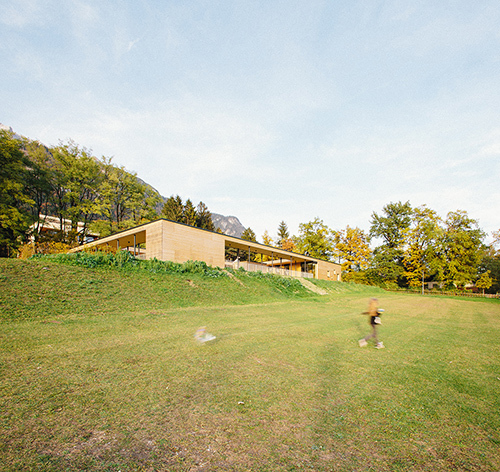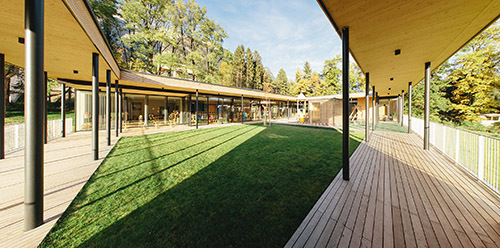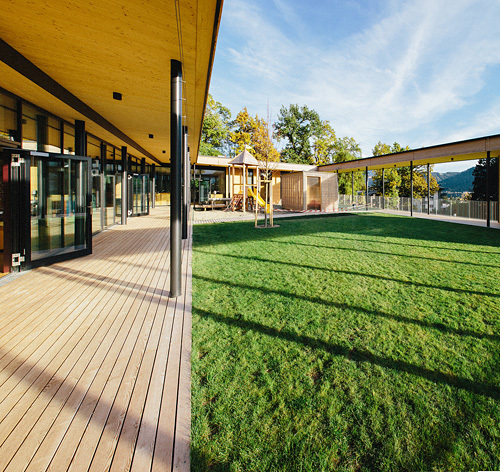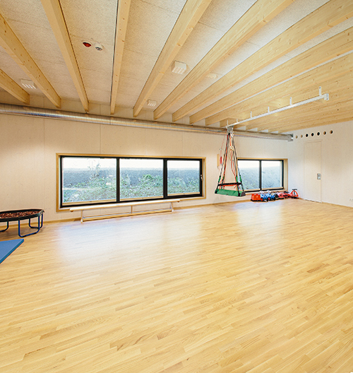 Das aus einem geladene Wettbewerb hervorgegangene Projekt von reitter_architekten besteht aus einem eingeschossigen Holzbau, der ohne große Erdbewegungen auf die bereits eingeebnete Fläche im Osten des Fußballplatzes gesetzt wurde. Der flache, L-förmige Baukörper umschließt zusammen mit zwei Terrassenflügeln einen rechteckigen Innenhof, der den Kindern den notwendigen Freiraum bietet. Witterungsgeschützte Bereiche in den umlaufenden gedeckten Terrassenflächen, eine offene Grünfläche, ein großer Sandkasten-Bereich und eine mit Gummimatten belegte Spielfläche stellen einen vielfältig und bei jedem Wetter nutzbaren Freiraum direkt „im Haus“ zur Verfügung, ein zusätzlicher, notwendiger Weise immer abgezäunter Spielbereich im öffentlichen Grünraum war damit nicht notwendig.