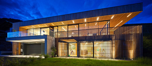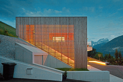 Auf einem steilen Hanggrundstück nördlich des Lienzer Talbodens entstand ein Wohnhaus, das mit Büroräumen für die eigene Firma „all mountain sports Vertriebs GesmbH“ Wohnen und Arbeiten verbindet. Als Bauplatz stand eine Restfläche zwischen Dorfstraße und bebauten Grundstücken anschließend an den kleinen Weiler Untergaimberg zur Verfügung. Hier wünschte sich der Bauherr ein möglichst offenes Haus mit viel Ausblick auf die Dolomiten und möglichst wenig ungewollten Einblicken. Außerdem sollte das Haus einfach, unaufdringlich und ländlich sein – nicht im Erscheinungsbild, sondern im Zugang zum Thema.Realisiert wurde ein kubischer, stadelförmiger Baukörper mit Lärchenfassade, der in beiden Geschossen direkt an den Garten angebunden ist. Der hintere, in den Hang eingegrabene Bauteil ist in Stahlbeton ausgeführt, der Rest in Holzmassivbauweise errichtet. Die Hauptseite orientiert sich zum Tal und damit zur Sonne und ist – je nach Nutzung – mehr oder weniger geöffnet. Im Erdgeschoss bilden zum Teil bewegliche Fassadenteile den gewünschten Filter, im Obergeschoss ist der Baukörper zum Tal hin völlig offen.