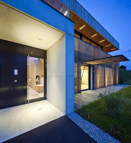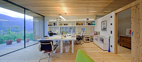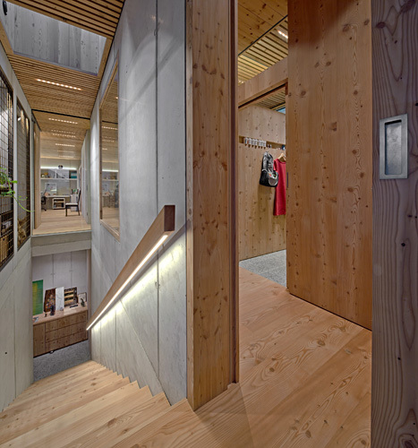 Von einem kleinen, befestigten Vorplatz aus wird das Haus mittig über einen tief in den Baukörper reichenden Gardarobenbereich erschlossen, ein Betonwinkel markiert den Eingang. Eine offene, zwischen Sichtbetonscheiben eingespannte Lärchentreppe führt ins Obergeschoss, wo sich im Süd-Osten der offene Wohn-Essbereich befindet. Im Südwesten, direkt über dem Eingang, liegt das Büro mit eigener Terrasse, das von außen getrennt erreichbar ist.