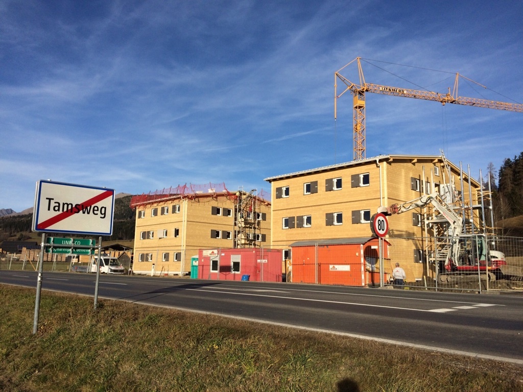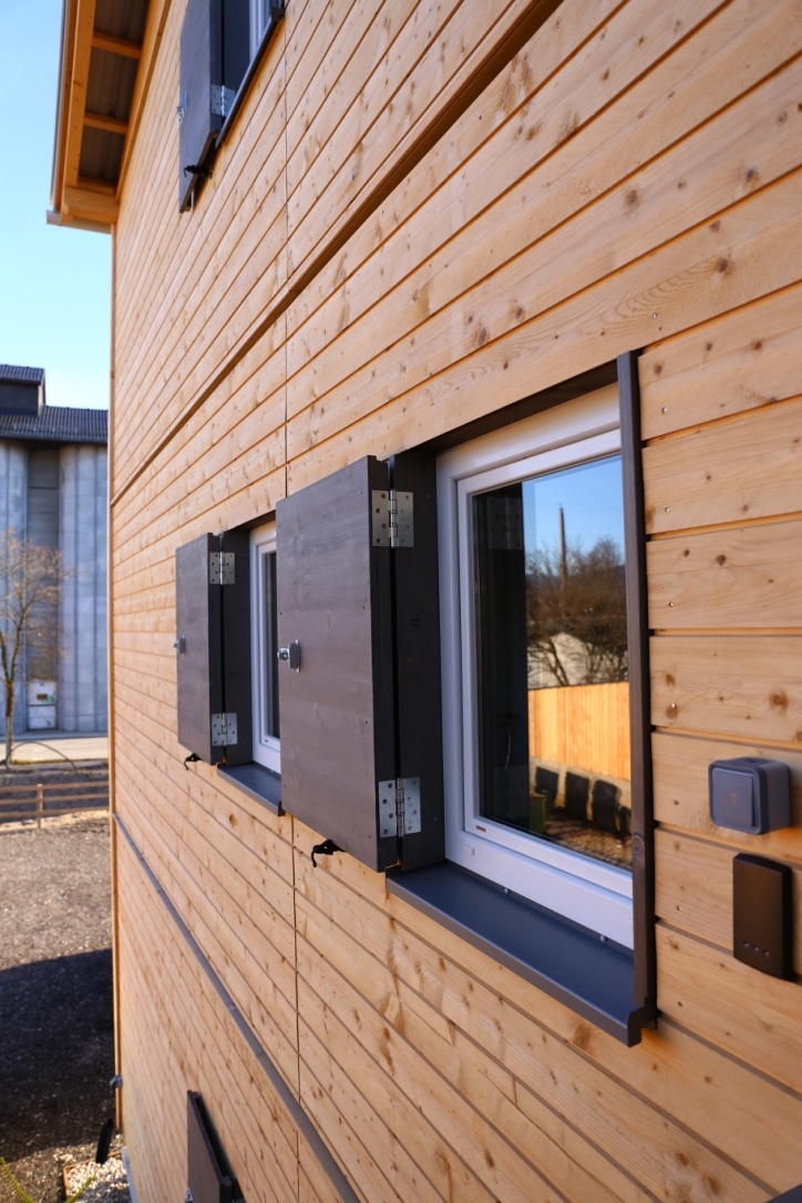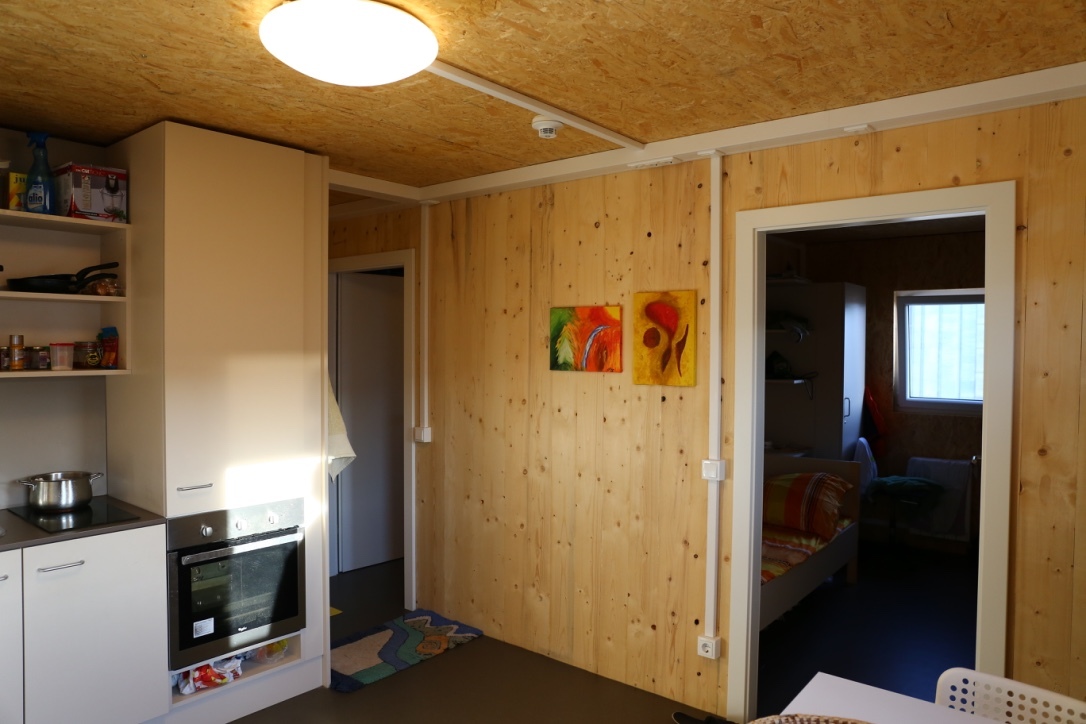 Die (zeitlich befristete) Novellierung der Salzburger Bauordnung ermöglicht die Errichtung widmungsferner, also im Gewerbegebiet angesiedelter Unterkünfte. Die Novellierung betrifft auch die bautechnischen Anforderungen hinsichtlich Festigkeit, Brandschutz, Hygiene, Nutzungssicherheit und Schallschutz, die für temporäre Unterkünfte auf ein „tragbares Maß“ reduziert werden dürfen. Verglichen mit herkömmlichen Container-Notunterkünftigen wirken die Holzhäuser mit den Fensterläden im Verband überraschend repräsentativ. Beim Betreten wird jedoch deutlich, dass der Standard, der sich hier bietet, keiner ist, auf den Herr und Frau Österreicher neidisch sein können. Die geringeren bautechnischen Anforderungen, die für die temporären Unterkünfte zur Anwendung kommen, wirken sich direkt aus: Die Trittschalldämmung ist geringer als bei üblichen normgerechten Wohnhäusern. Die Raumhöhe ist geringfügig niedriger und auch die Fensterflächen unterschreiten in ihrer Dimension die üblicherweise geltenden Mindestgrößen. Es ist eben kein Wohnhaus, sondern eine temporäre Unterkunft. Der reduzierte Standard ermöglicht letztlich ihre Errichtung, das Ziel sind menschenwürdige Unterkünfte, errichtet auf Basis von Spendengeldern.