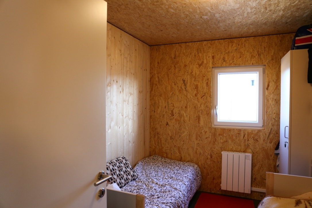 Die Wohneinheiten für jeweils vier Bewohner:innen sind auf das Wesentliche reduziert: zwei Schlafräume (zwei Bewohner:innen je Schlafraum), ein gemeinsam genutzter Wohn-/Kochbereich und eine ebenfalls gemeinsam genutzte Nasszelle (GFK-Fertigteilnasszelle). Die Größe der Wohneinheiten ist mit knapp 50 m² mehr als bescheiden. Für vier Erwachsene, die in der Regel als Einzelpersonen und nicht im Familienverband eine Wohneinheit beziehen, heißt es zusammenrücken.