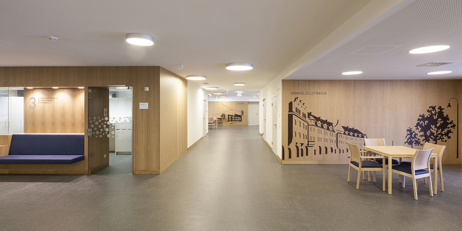 Die mit hellem Holz, unaufdringlich hellen Böden und einer vereinzelten, mit Stoff bezogenen Bank dem Begriff „wohnlich“ so weit wie möglich angenäherte Stimmung im Haus wird von den Kunstprojekten mitgetragen. Walter Kainz und Marion Kilianowitsch haben mit ihren Werken – einem Eichenrelief und einem Metallbild – den Andachtsraum ruhig und meditativ gestimmt. Großformatige Holzintarsien mit Linzer Stadtansichten von mia2/Gnigler/Wilhelm Architektur unterstützen Gedächtnis und Orientierung im Haus; und die von Gerhard Brandl in den Natursteinboden der Eingangshalle gravierten Teppiche erinnern die Bewohnerinnen und Bewohner vielleicht ebenso an daheim wie Margit Greinöckers Guglhupf-Skulptur an der dem Haupteingang gegenüberliegenden Wand.