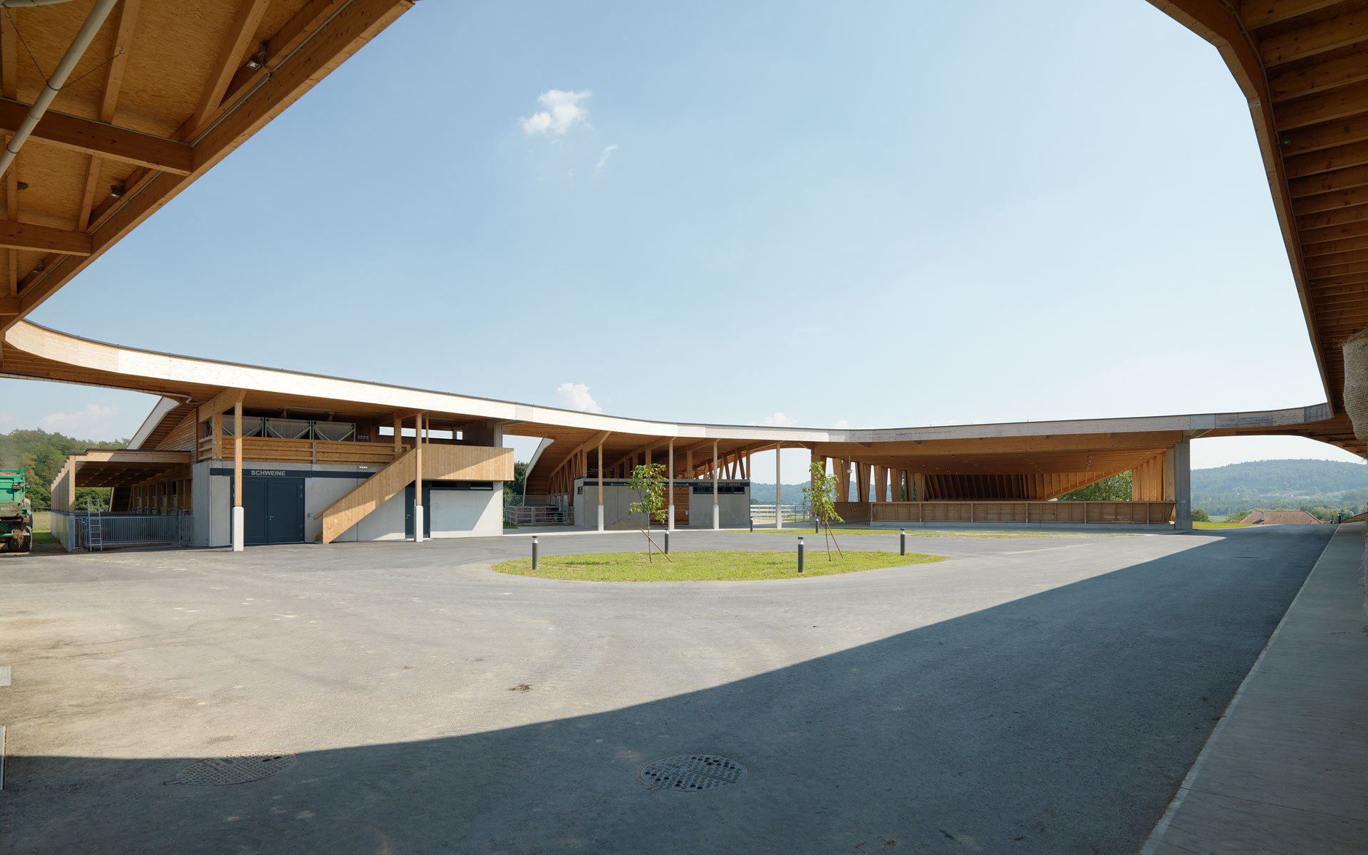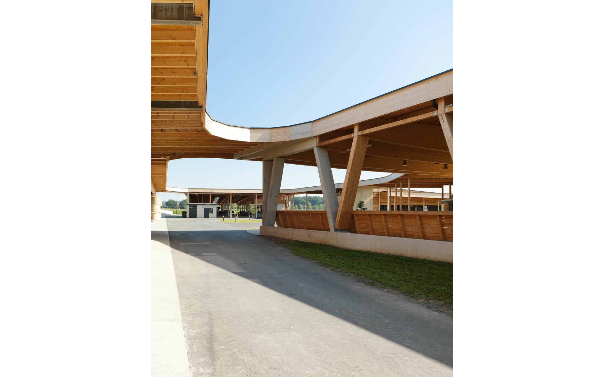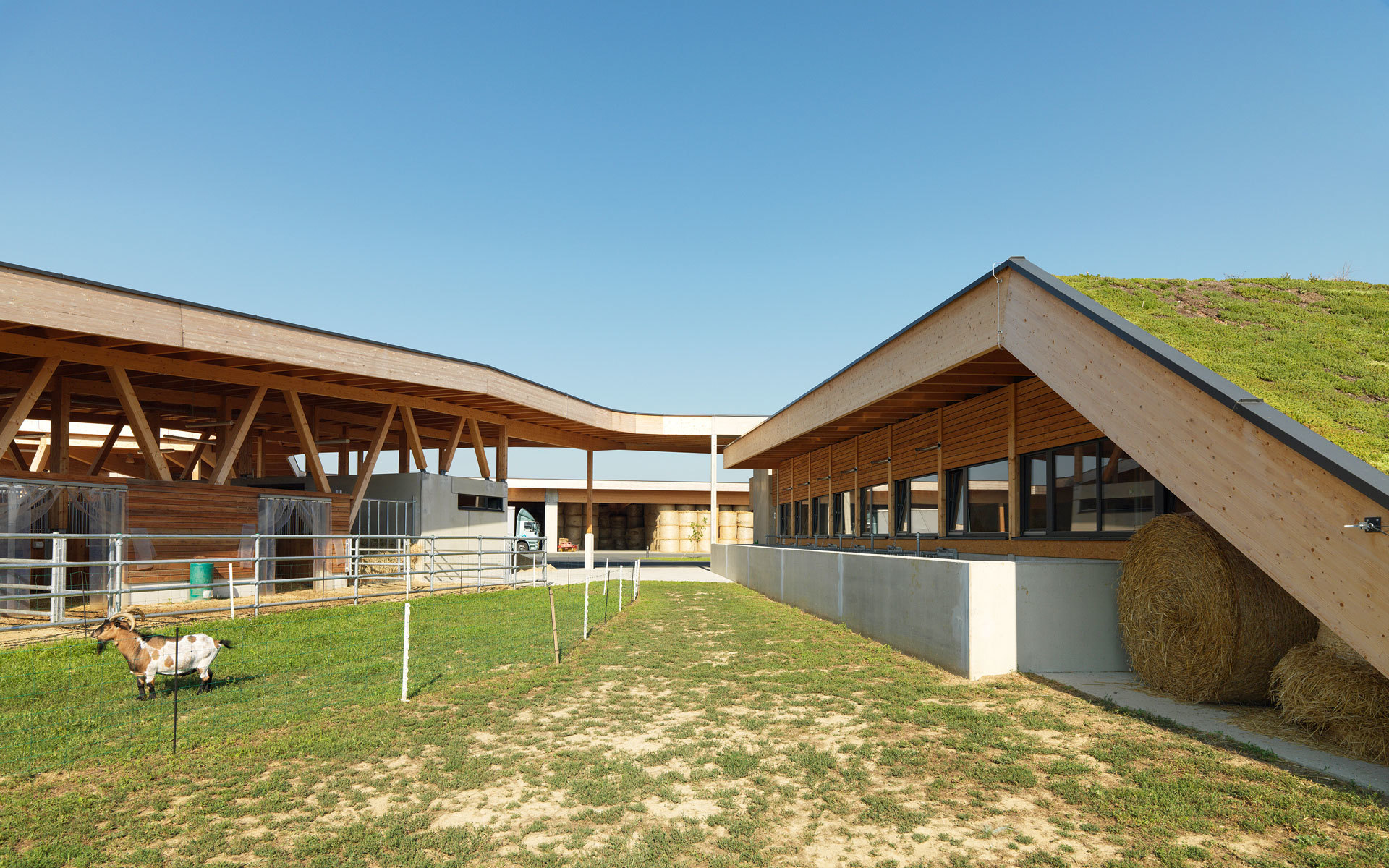 Die Ställe strecken sich locker wie Finger in die umgebende Landschaft. Die Anlage erscheint eher als ein Cluster, denn als vierkanthofartiges Bollwerk. Bewusst werden die Bauten als Teile des Landschaftlichen gesehen, die sich aus den umgebenden Wiesen herausfalten und deren Dächer quasi als hochgestelzte Grasnarben in Erscheinung treten. Das Ganze ist ein locker gestreuter LANDwirtschaftsbetrieb und keine kompakte Industrieanlage. (Text: Architekt)