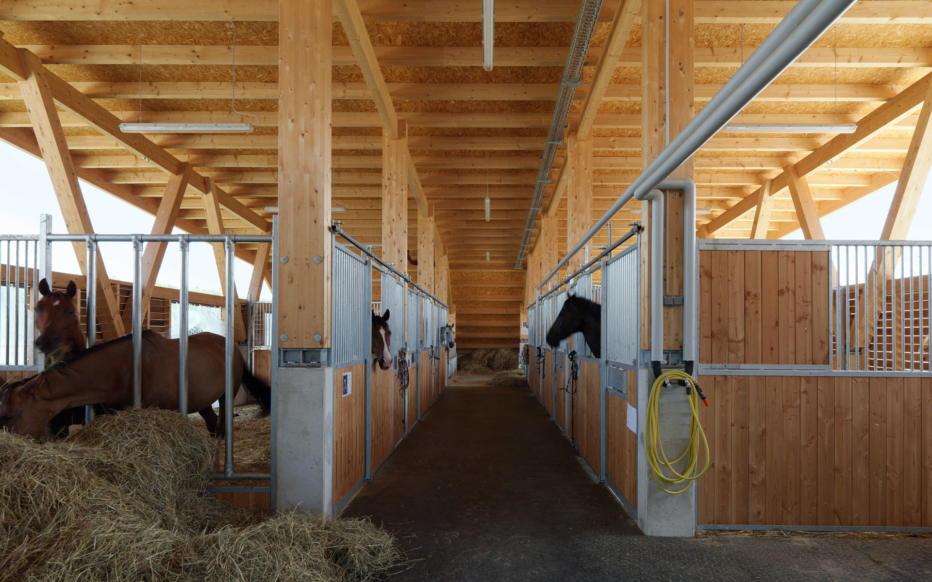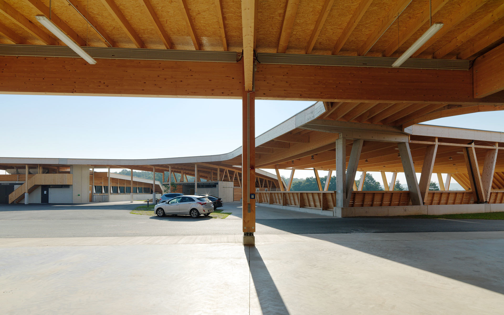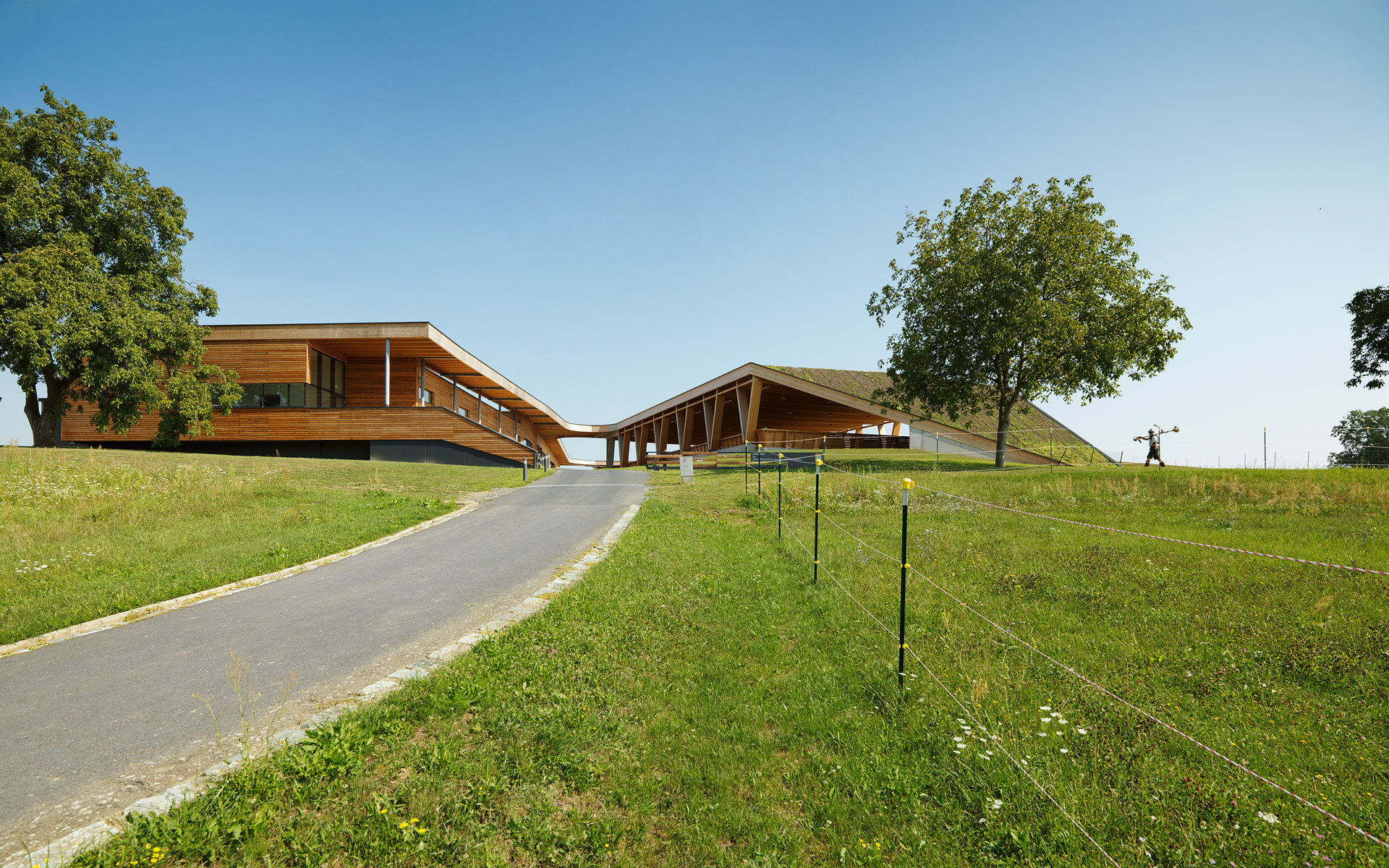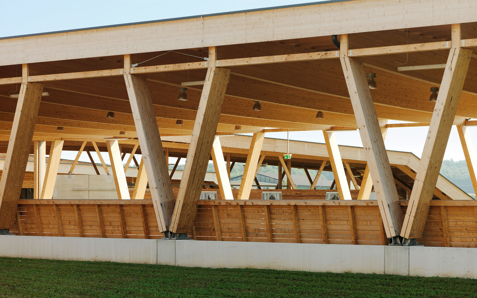 Die Ställe strecken sich locker wie Finger in die umgebende Landschaft. Die Anlage erscheint eher als ein Cluster, denn als vierkanthofartiges Bollwerk. Bewusst werden die Bauten als Teile des Landschaftlichen gesehen, die sich aus den umgebenden Wiesen herausfalten und deren Dächer quasi als hochgestelzte Grasnarben in Erscheinung treten. Das Ganze ist ein locker gestreuter LANDwirtschaftsbetrieb und keine kompakte Industrieanlage. (Text: Architekt)