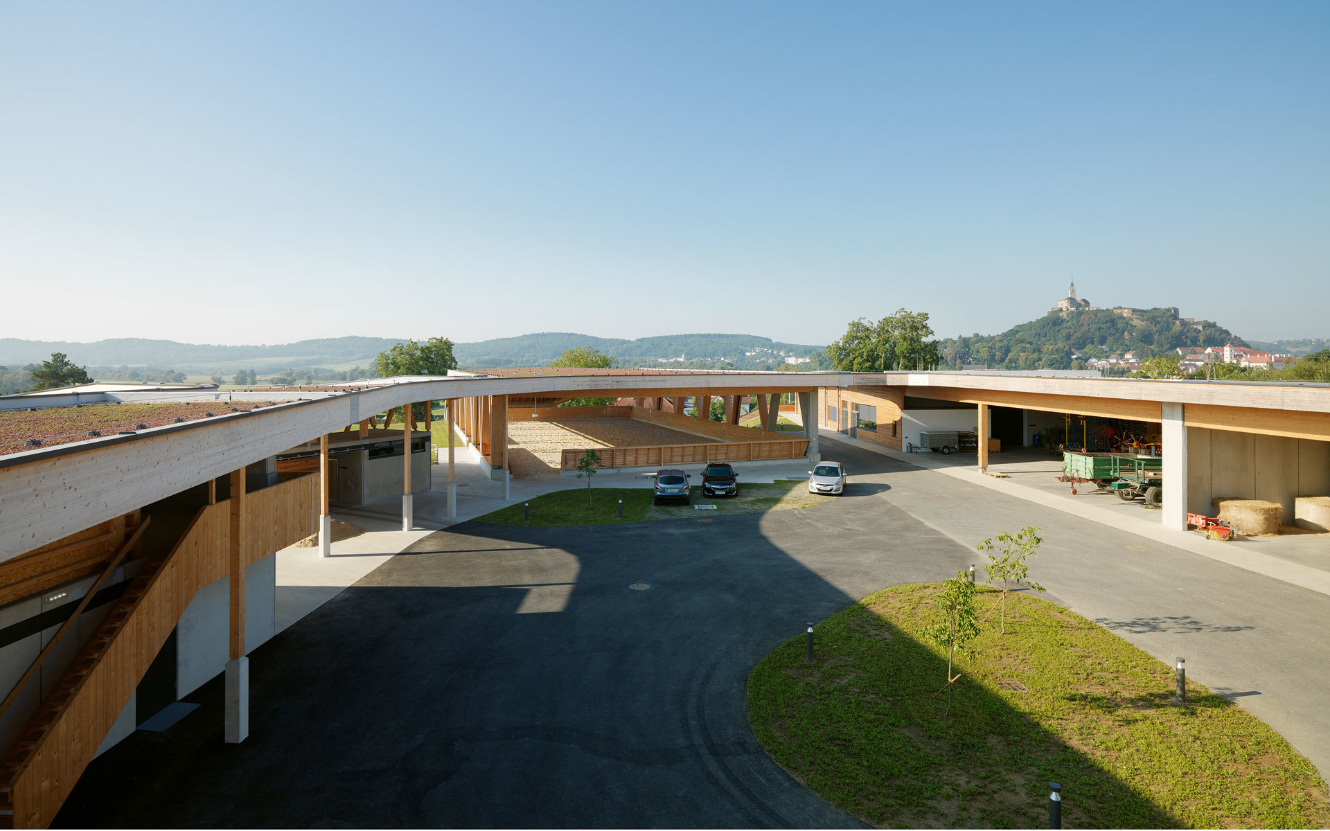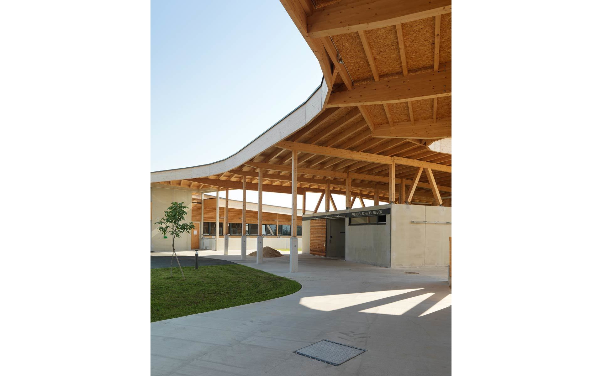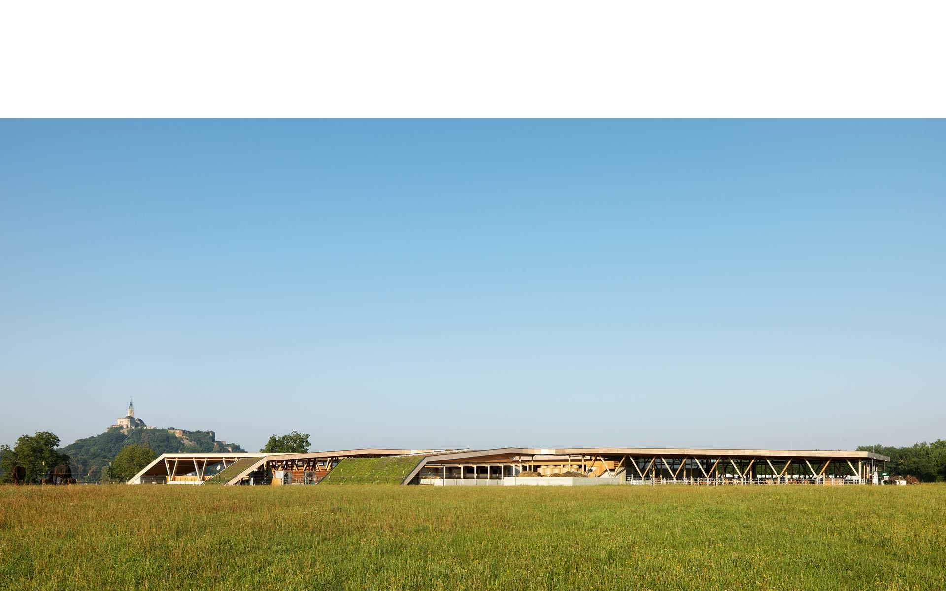 Die Stallanlagen werden um einen zentralen Hof herum angeordnet. Dies bewirkt einerseits kurze Wege und Übersichtlichkeit von jedem Punkt des Hofes aus. Für die Mitarbeiter ist hohe Effizienz in der Bewerkstelligung der täglichen Arbeiten gewährleistet. Über ein umlaufendes Vordach können witterungsgeschützt alle Teile erreicht werden. Die Ställe greifen radial in die Umgebung und werden von Freiräumen, Luft und Sonne umspielt. Somit wird den Tieren genügend Außenraumbezug verschafft. Nach Nordwesten hin bildet der Wirtschaftstrakt einen witterungsschützenden Abschluss. Der Lehrtrakt bildet den Beginn der Anlage von der Stremtalstraße her. Hier ist auch die Reithalle als der am ehesten öffentlich zugänglichen Teil des Ensembles angeordnet.