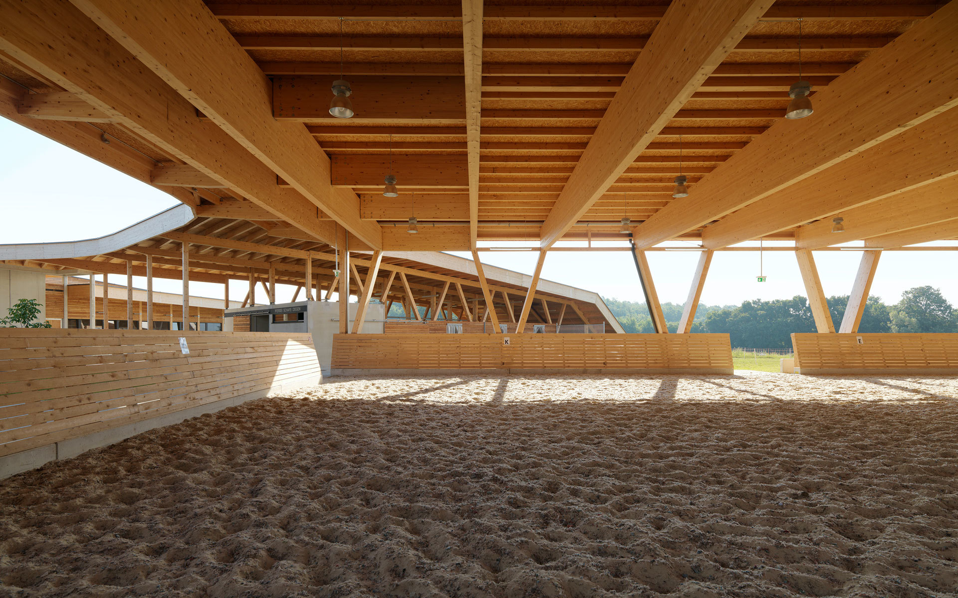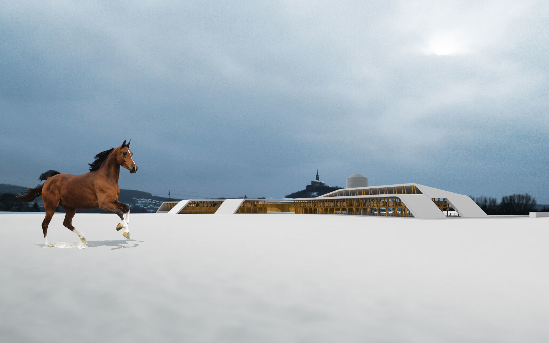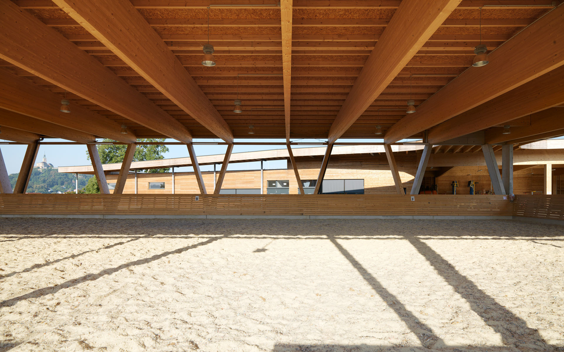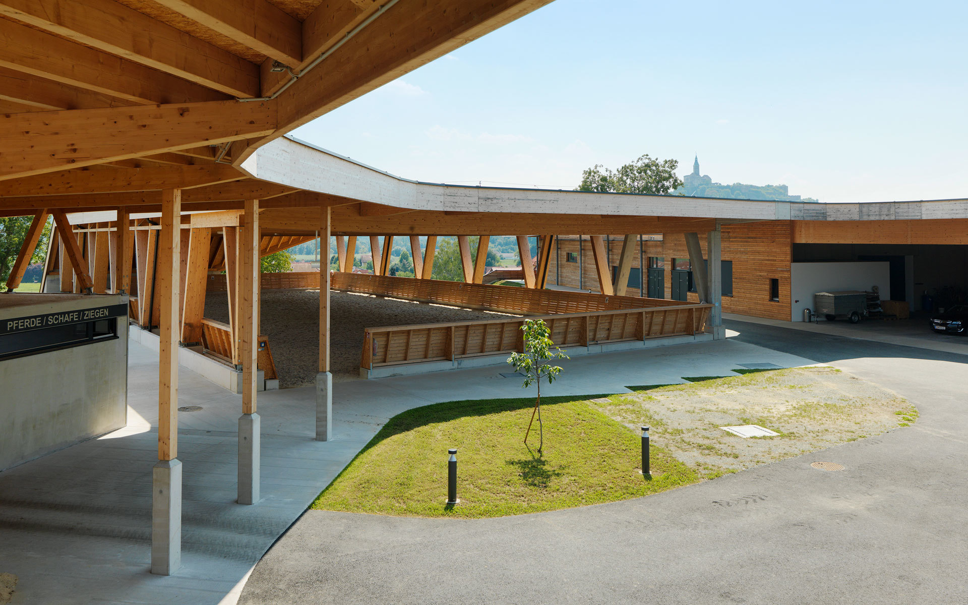 Die Stallanlagen werden um einen zentralen Hof herum angeordnet. Dies bewirkt einerseits kurze Wege und Übersichtlichkeit von jedem Punkt des Hofes aus. Für die Mitarbeiter ist hohe Effizienz in der Bewerkstelligung der täglichen Arbeiten gewährleistet. Über ein umlaufendes Vordach können witterungsgeschützt alle Teile erreicht werden. Die Ställe greifen radial in die Umgebung und werden von Freiräumen, Luft und Sonne umspielt. Somit wird den Tieren genügend Außenraumbezug verschafft. Nach Nordwesten hin bildet der Wirtschaftstrakt einen witterungsschützenden Abschluss. Der Lehrtrakt bildet den Beginn der Anlage von der Stremtalstraße her. Hier ist auch die Reithalle als der am ehesten öffentlich zugänglichen Teil des Ensembles angeordnet.