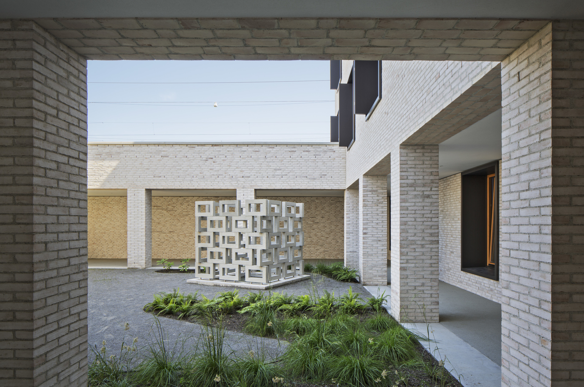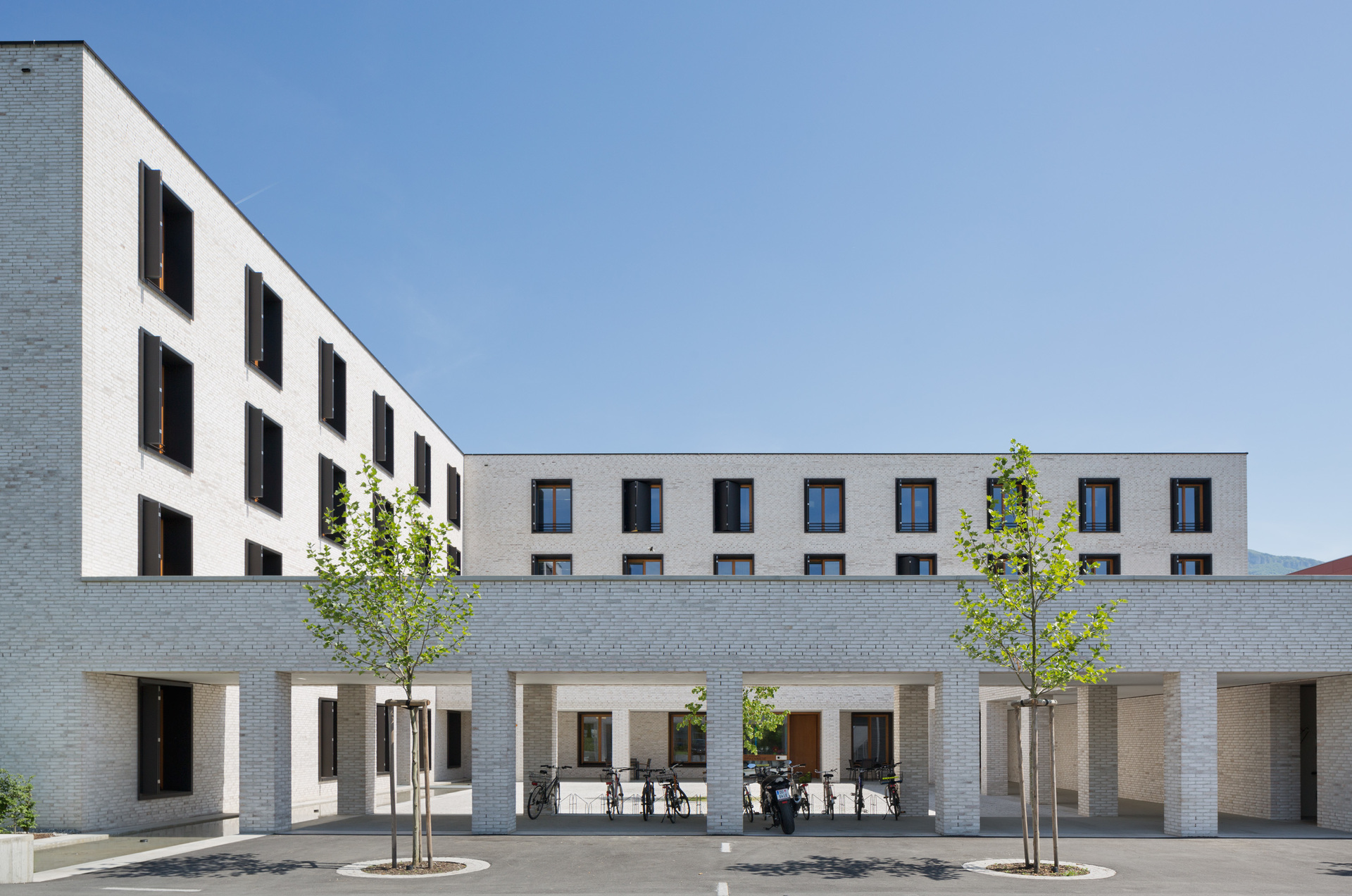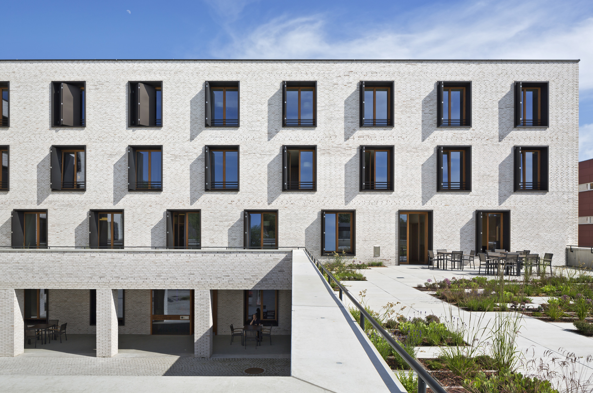 Nordseitig gelangt man über den Vorhof mit Wasserbecken und Lindenbaum zum zentral gelegenen, hellen Eingangsbereich mit geschwungenem Empfangstresen. Von hier aus blicken die Eintretenden in den rückseitigen Innenhof, der – gleich einem Kreuzgang – von eingeschoßigen Arkaden umschlossen ist. Zwei mit Kräuterbeeten bepflanzte Dachterrassen sowie vielfältige Gartenflächen in und um das Gebäude laden zum Spazieren und Ruhen ein.