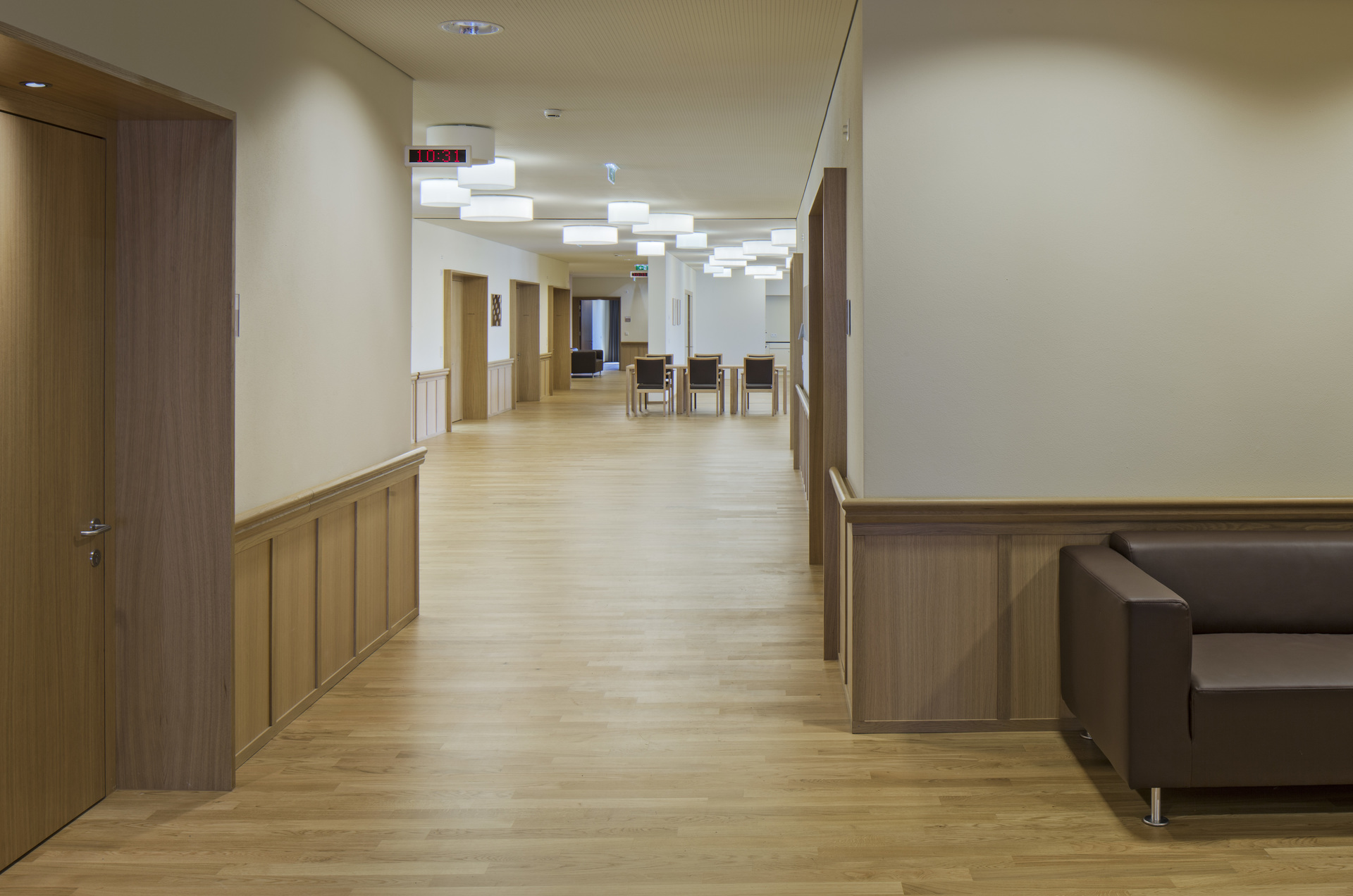 Jedes Zimmer ist mit einem Pflegelift ausgestattet und verfügt über ein großes Fenster mit Läden. Die Öffnungen sitzen besonders tief, sodass auch bettlägerige Bewohnerinnen und Bewohner hinausblicken können.