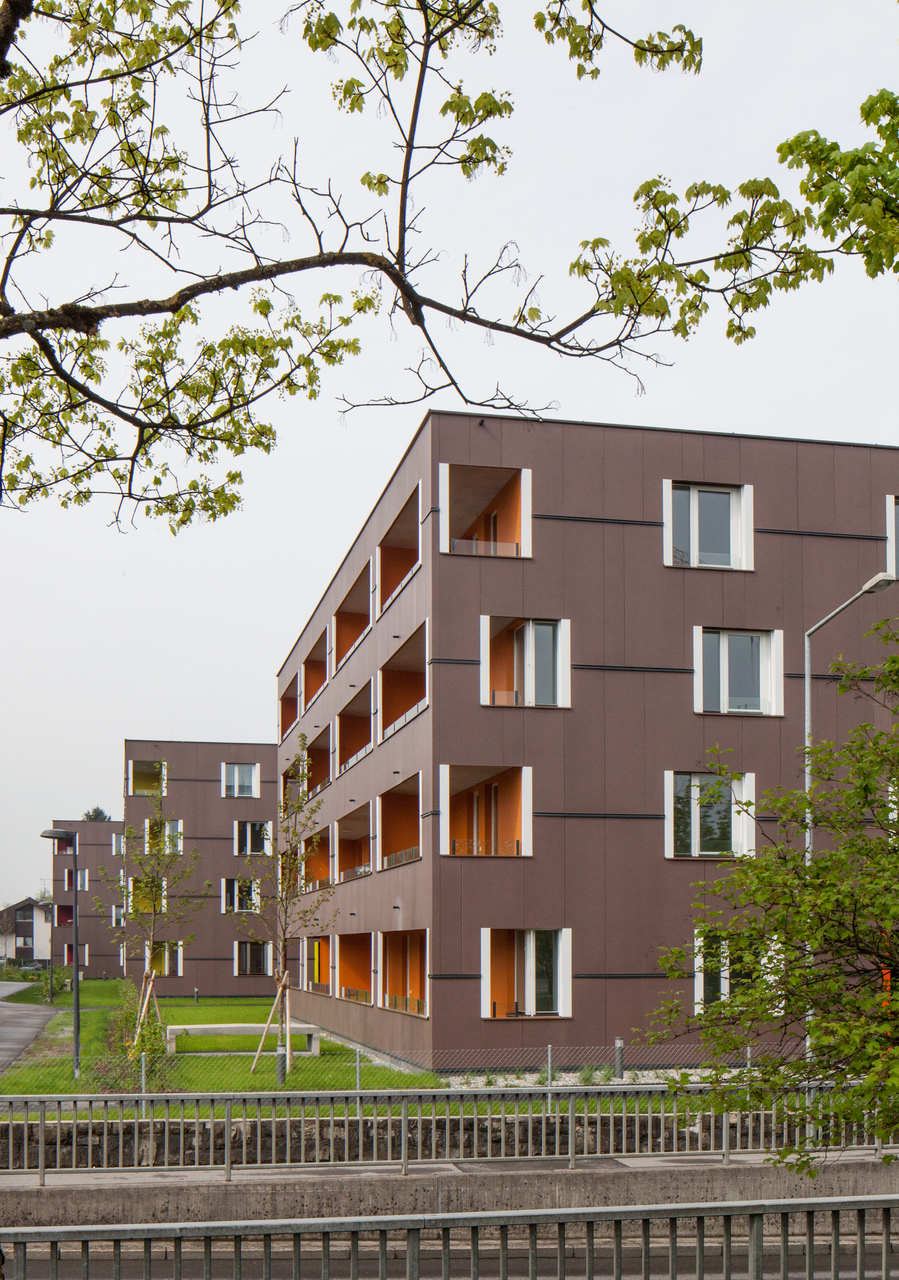 Alle drei Häuser sind in Mischbauweise ausgeführt. Ein Stahlbeton-Skelett mit Außenwänden aus mit Mineralwolle hochgedämmten Holz-Fertigteil-Tafeln bildet die Grundstruktur. Die hinterlüftete Fassade aus Eternit-Platten soll eine langlebige, wartungsfreie Außenhaut garantieren. (Text: Julia Ess nach einem Text der Architekten)