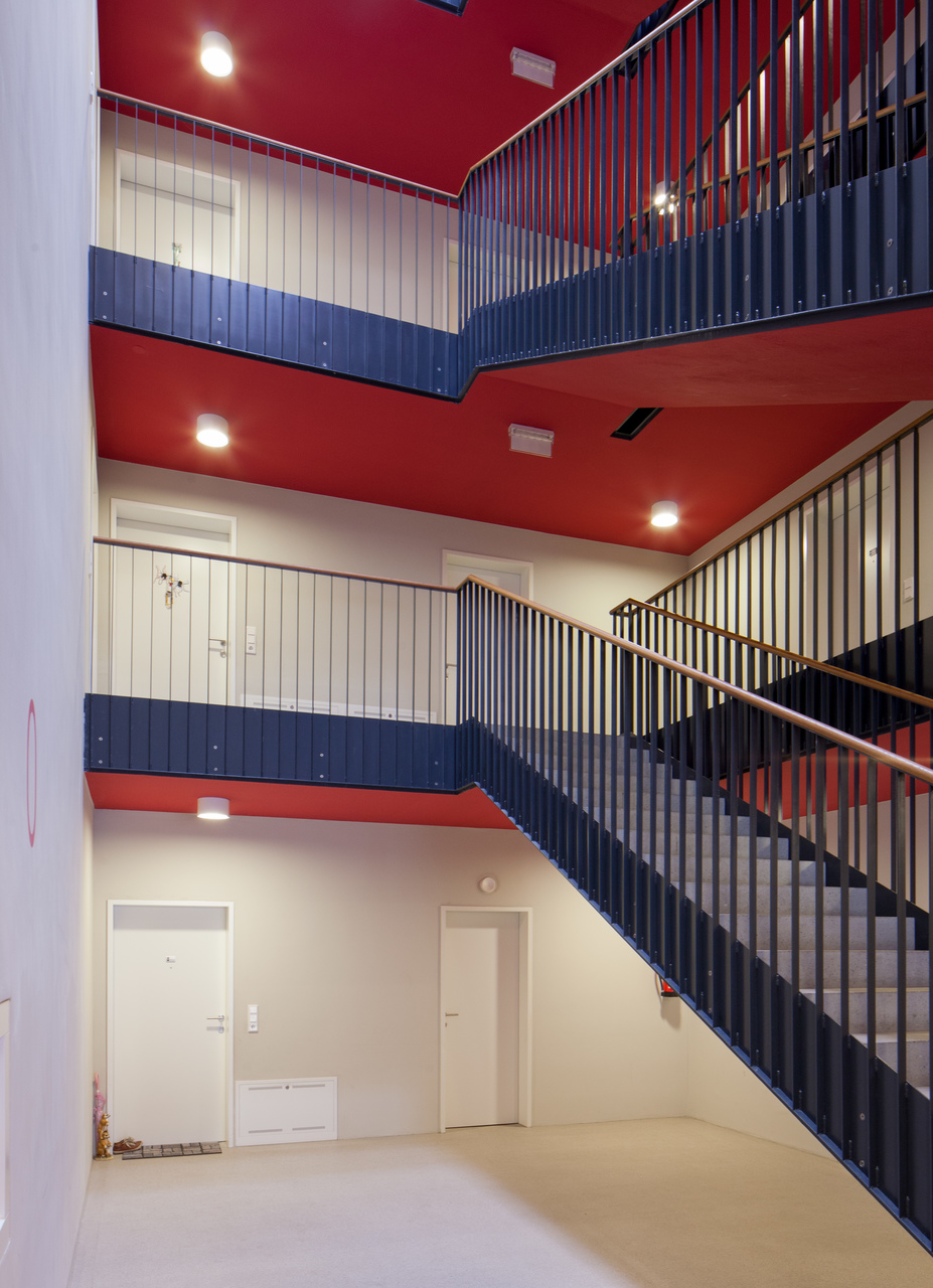 In den drei viergeschoßigen Baukörpern befinden sich insgesamt 61 Wohnungen unterschiedlicher Größe. Jeweils sechs Wohnungen mit zentraler Erschließung liegen im Regelgeschoß, im Erdgeschoß sind je Gebäude drei bzw. vier größere Wohnungen situiert. Jede Wohnung verfügt über eine eigene Loggia, die in die Fassade integriert ist. Die städtebauliche Struktur ermöglicht Ausblicke in die verschiedenen Freiräume und Orientierungen nach Nord-Osten, Süd-Osten und Süd-Westen. Zum Bahndamm im Nord-Westen sind keine Wohnungen orientiert.