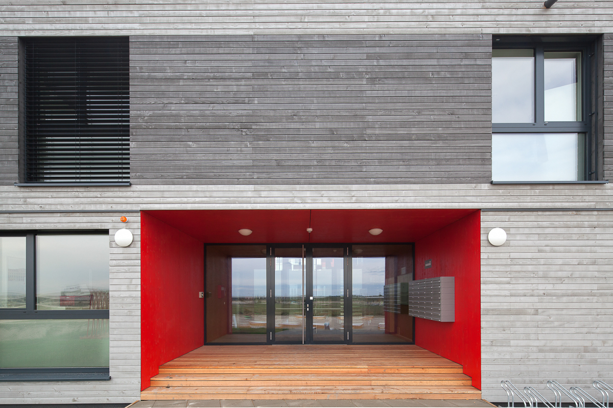 „Die Idee war, ein Fertigteilsystem zu entwickeln, das nicht nach Container aussieht, sondern gewisse wohnliche, architektonische Qualitäten bietet“, sagt Markus Fischer, F2 Architekten. „Es ist, wenn Sie so wollen, die bestmögliche Kombination aus Ästhetik und wirtschaftlicher Vorfertigung.“ Jede Einheit misst exakt 16,80 Meter in der Länge und 5,50 Meter in der Breite. Die Höhe des im Werk komplett vorgefertigten Holzriegelbaus beträgt 3,50 Meter. Die Außenmaße liegen weniger in der Architektur als in der Straßenverkehrsordnung begründet: „Das ist die größtmögliche Größe, die man transportieren kann, ohne dass dabei horrend hohe Kosten für Sondertransporte anfallen“, so Fischer.