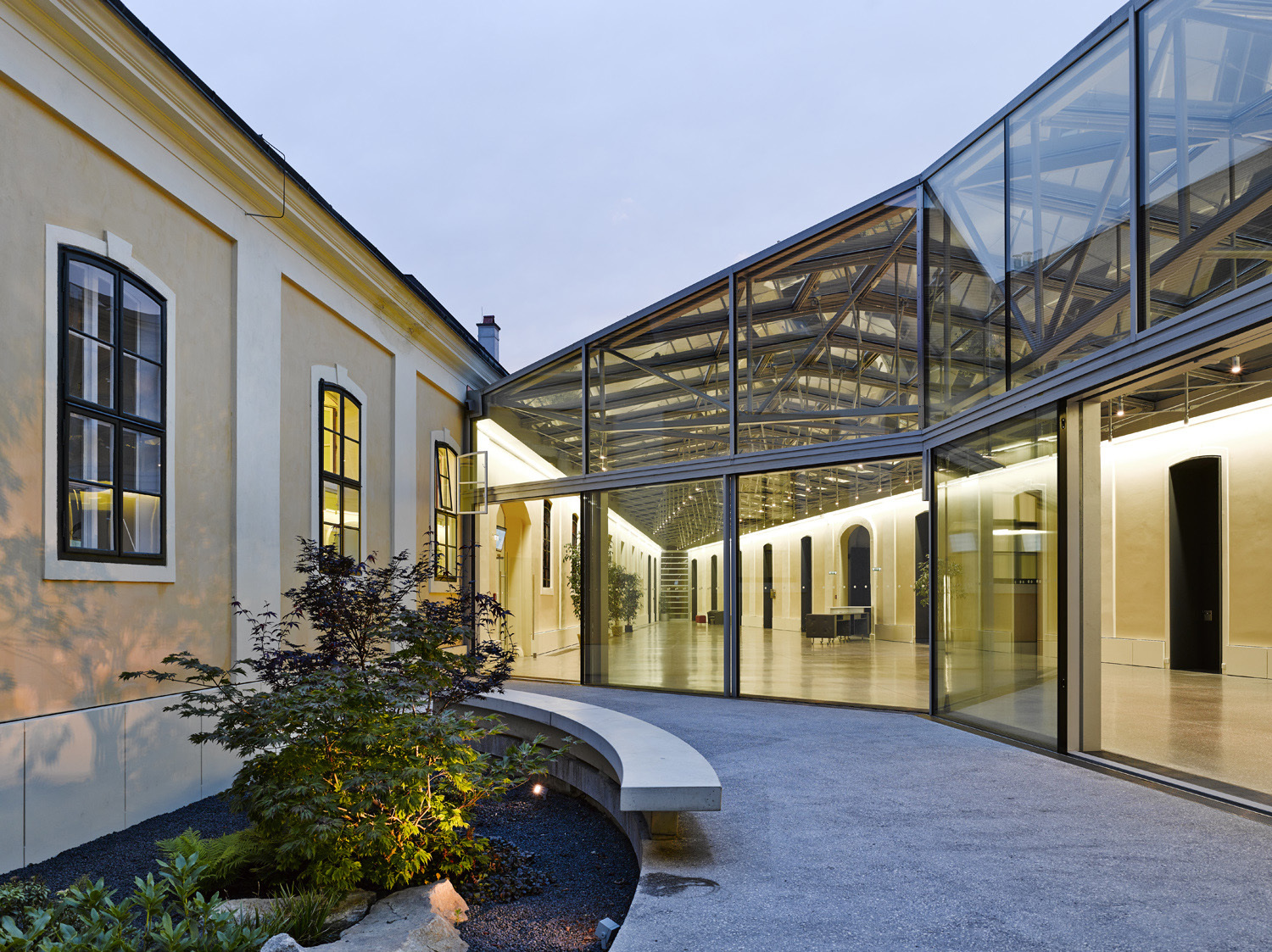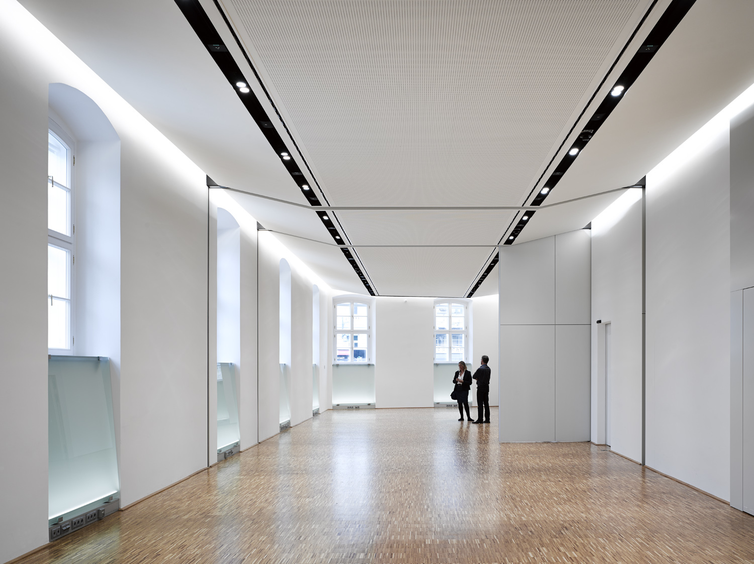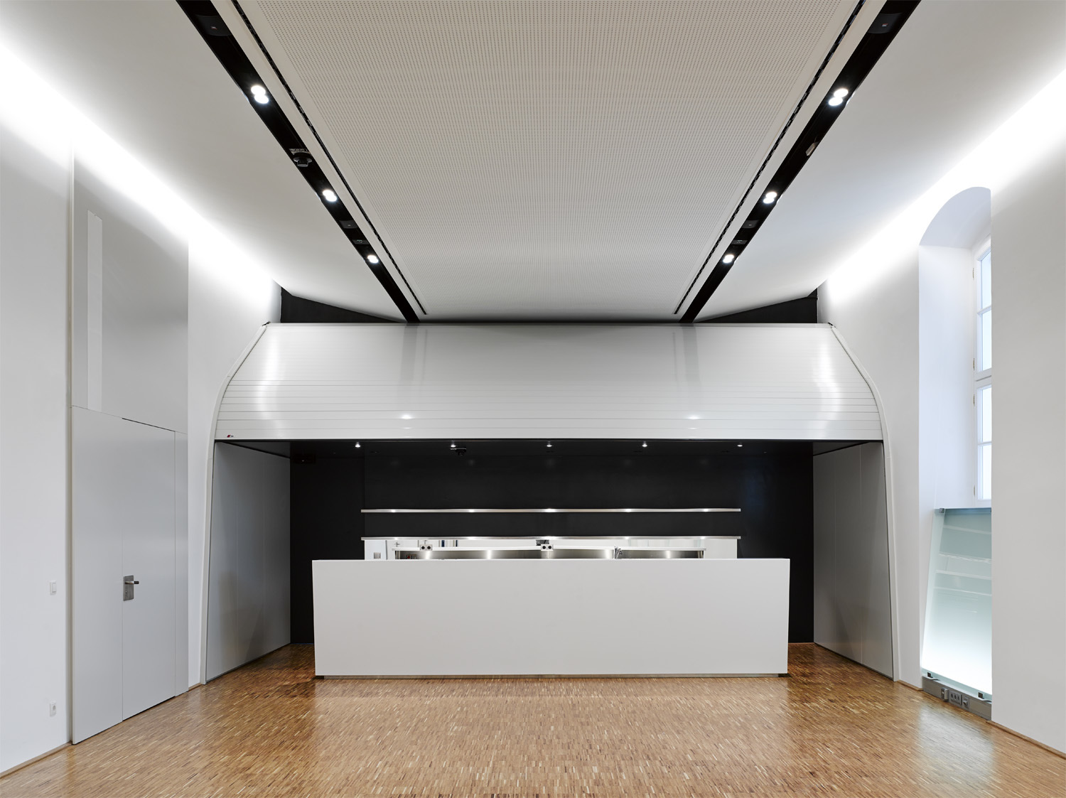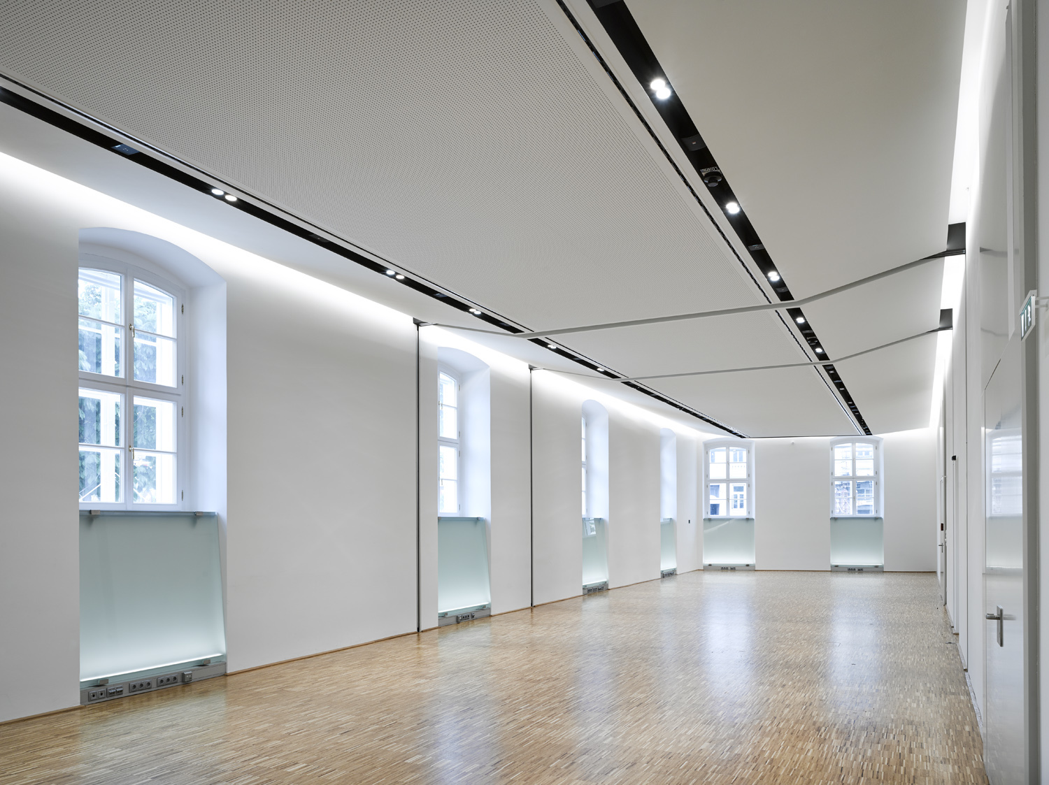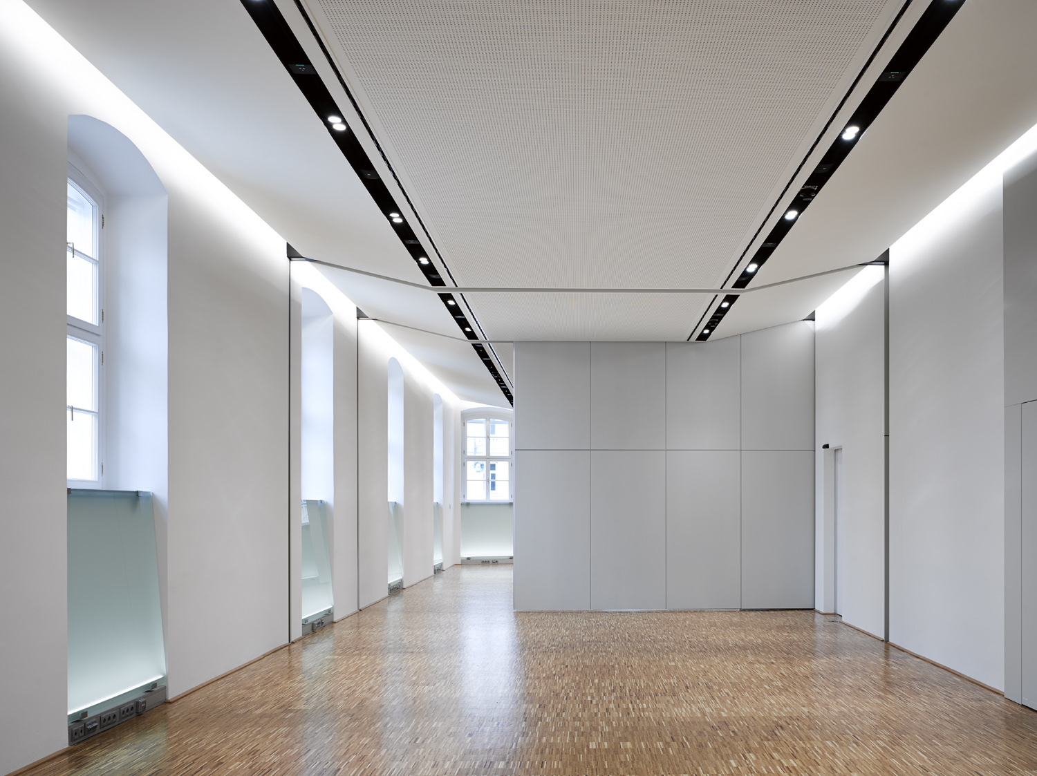 Die neuen Multifunktionsräume nördlich der Halle können sich flexibel an unterschiedliche Nutzungsansprüche anpassen und ergänzen die bestehenden Seminarräume auf ideale Weise. Flexibilität in der Fläche durch unterschiedliche Teilbarkeit und wahlweise Kombinierbarkeit mit der zentralen Halle durch einfach zu bedienende Schiebeelemente schaffen variantenreiche Raumzusammenhänge. (Text: Geiswinkler & Geiswinkler)