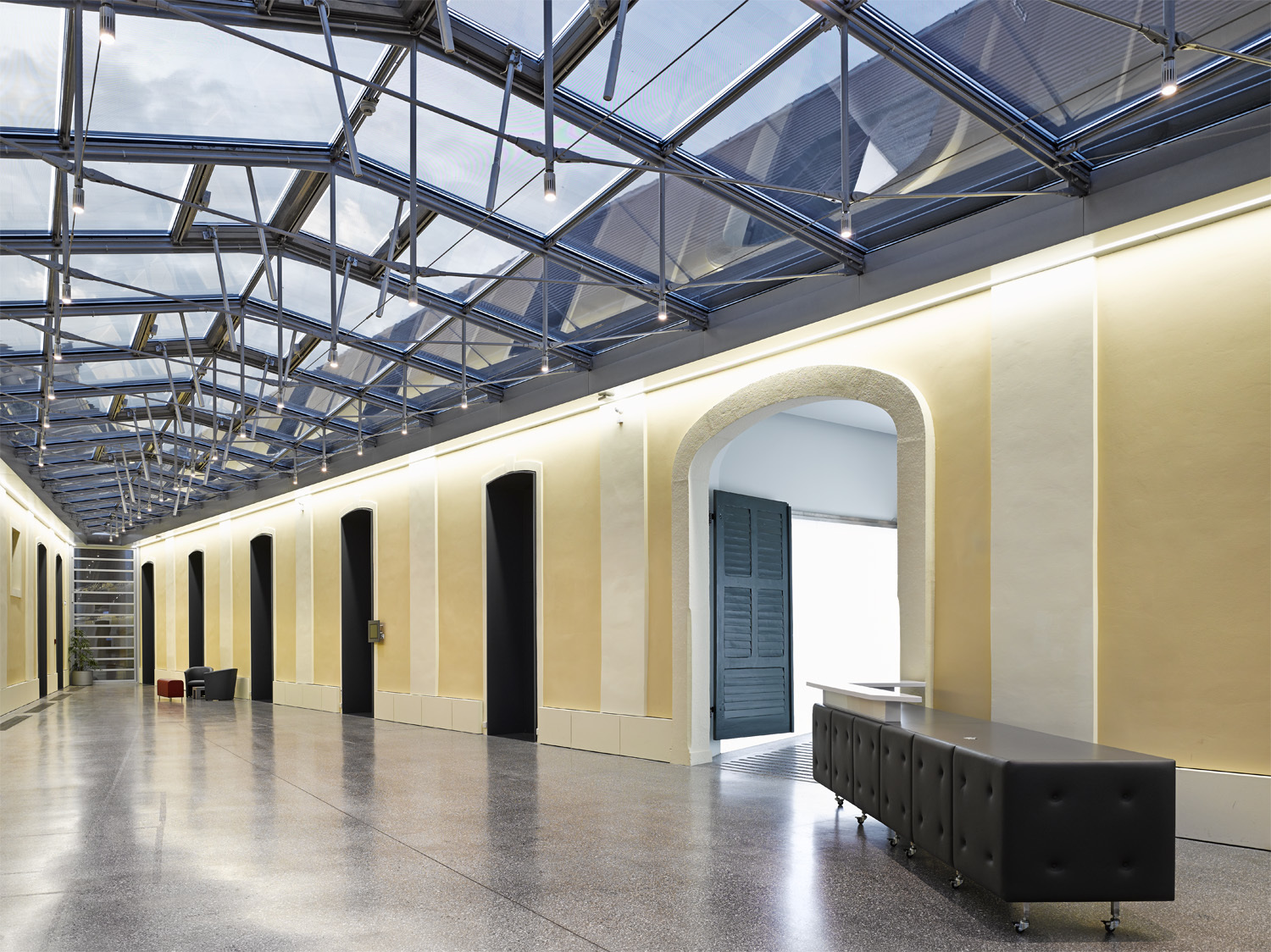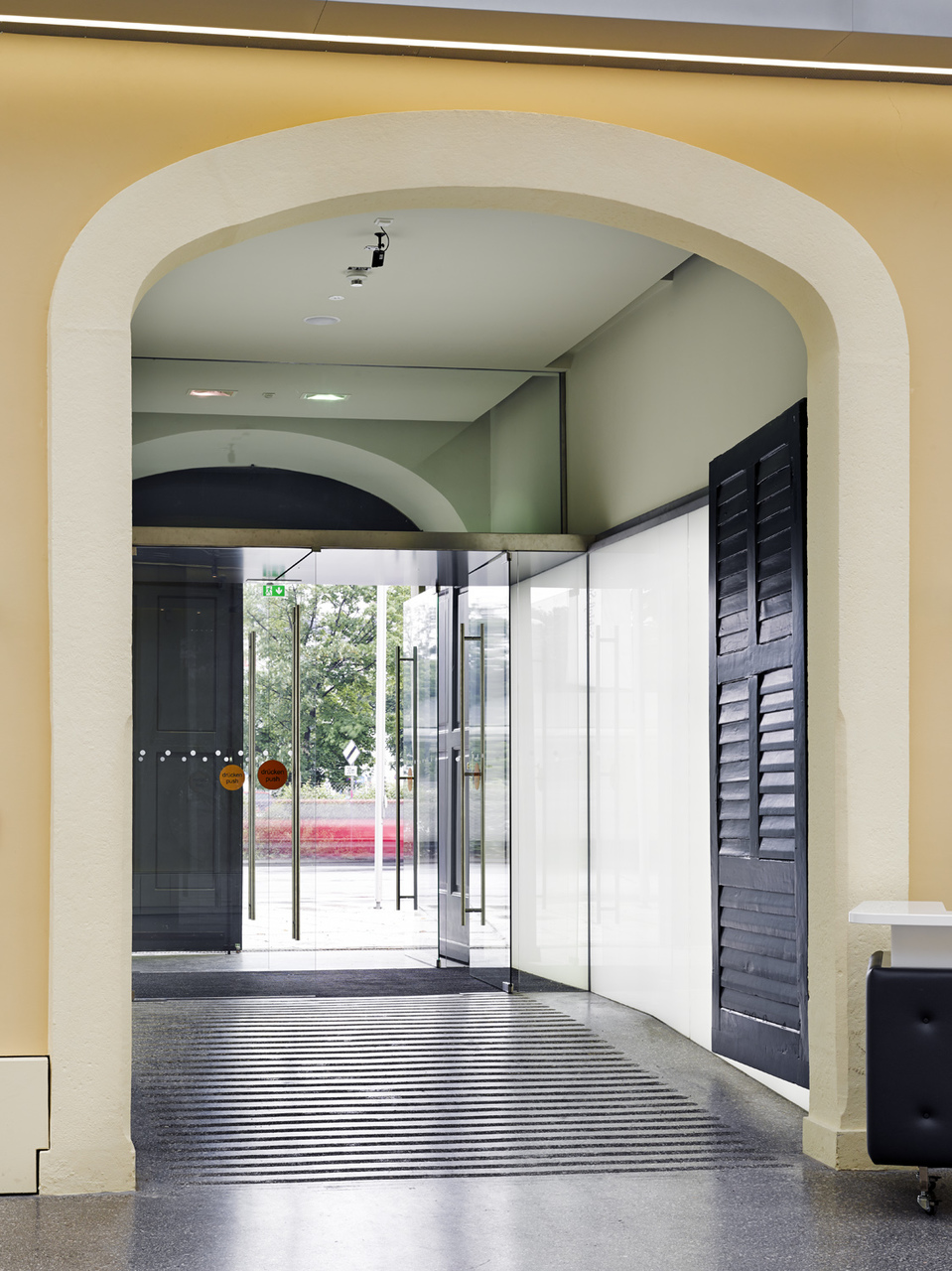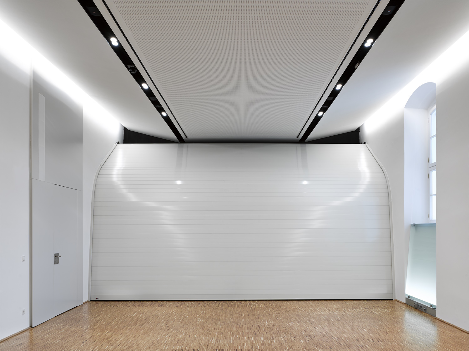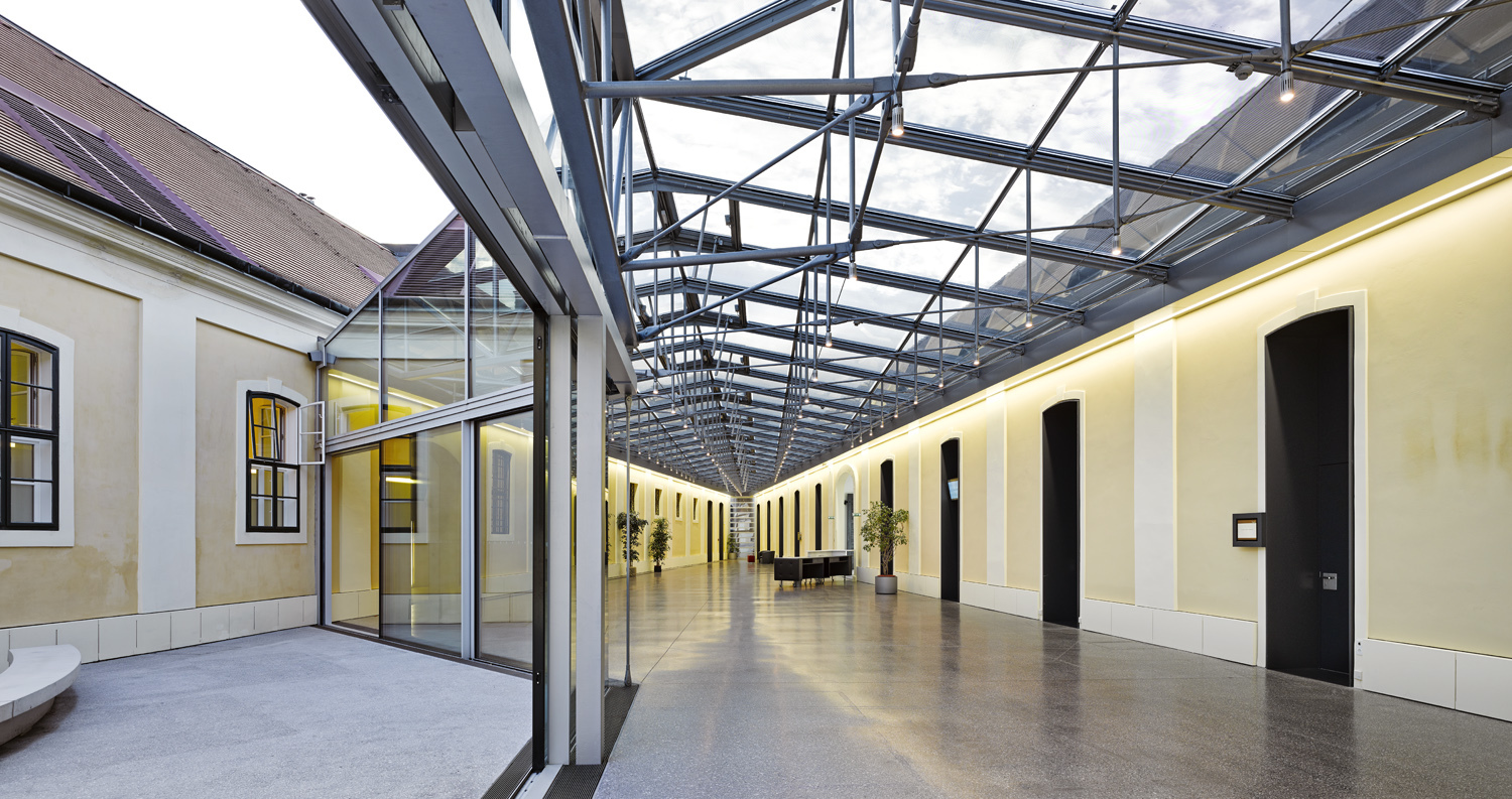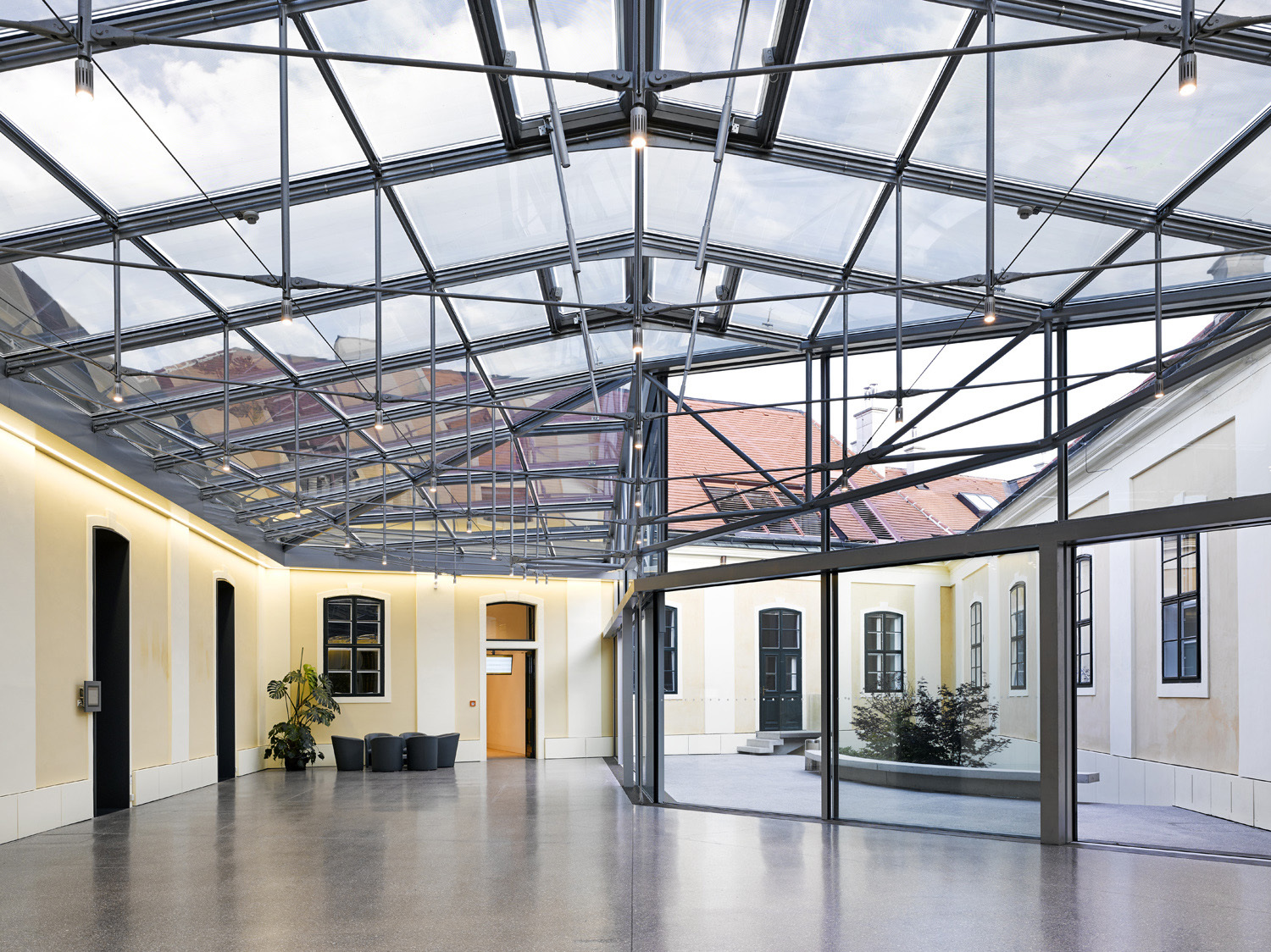 Die neuen Multifunktionsräume nördlich der Halle können sich flexibel an unterschiedliche Nutzungsansprüche anpassen und ergänzen die bestehenden Seminarräume auf ideale Weise. Flexibilität in der Fläche durch unterschiedliche Teilbarkeit und wahlweise Kombinierbarkeit mit der zentralen Halle durch einfach zu bedienende Schiebeelemente schaffen variantenreiche Raumzusammenhänge. (Text: Geiswinkler & Geiswinkler)