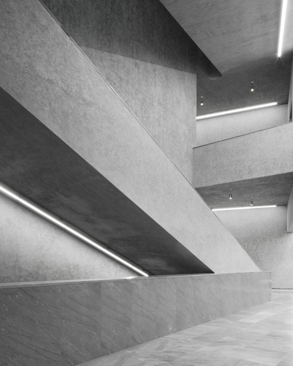 Man fühlt sich wie ein Statist in einem Schwarz-Weißfoto. Das Auge kennt sich nicht aus. Das Hirn sowieso nicht. Komplette Überforderung. „Es ist fast so, als hätte jemand im Photoshop das Bild desaturiert, als wären alle Farbnuancen verschwunden“, sagt Emanuel Christ, Architekt des Hauses, weißes Hemd, dunkelgrauer Anzug, heller Teint, perfekt ins monochrome Bild passend. „Genau das war unsere Absicht. Die Bühne gilt der Farbenvielfalt der Kunst der zweiten Hälfte des 20. Jahrhunderts. Wir haben uns entschieden, diesen Werken räumlichen Vorrang zu geben.“