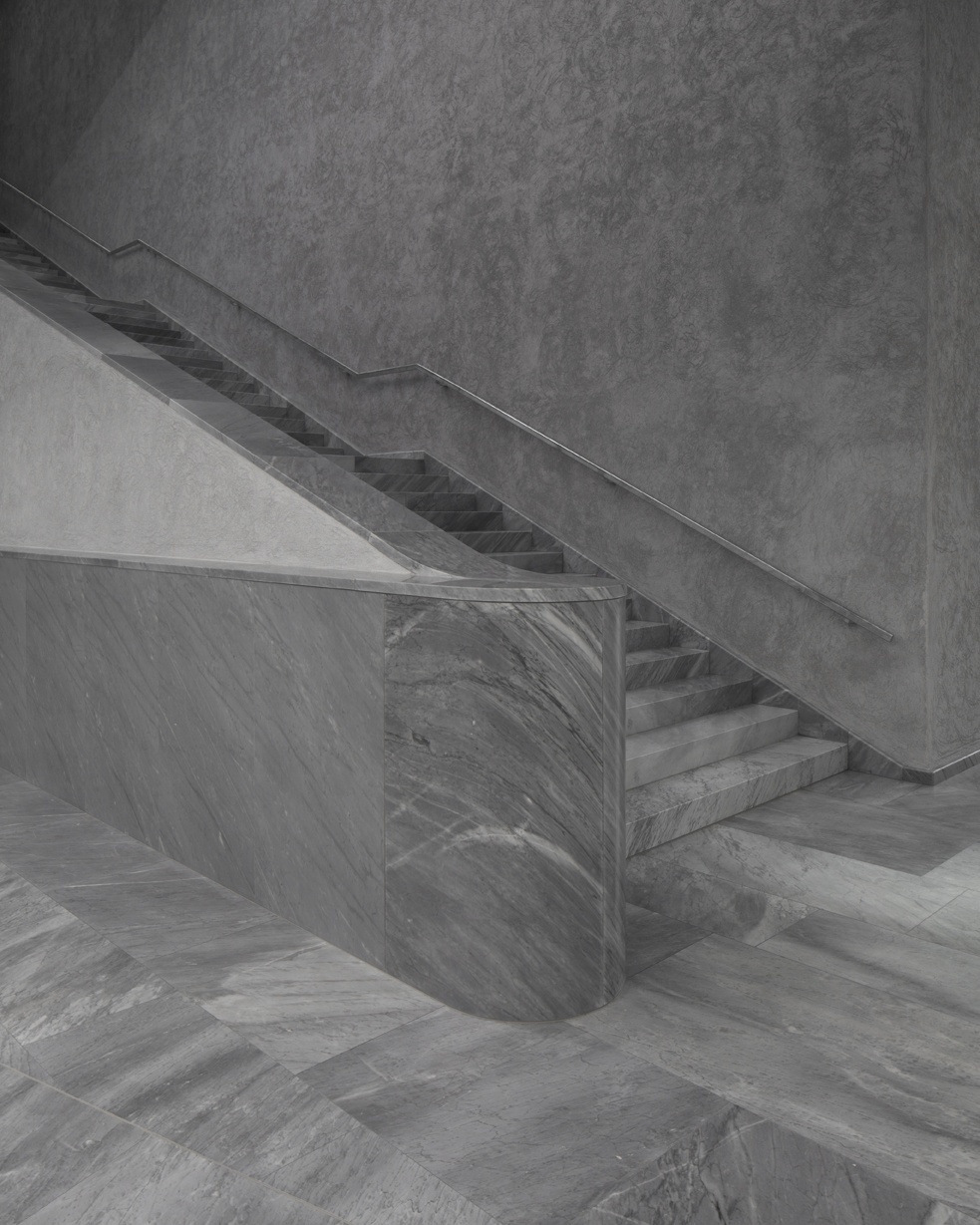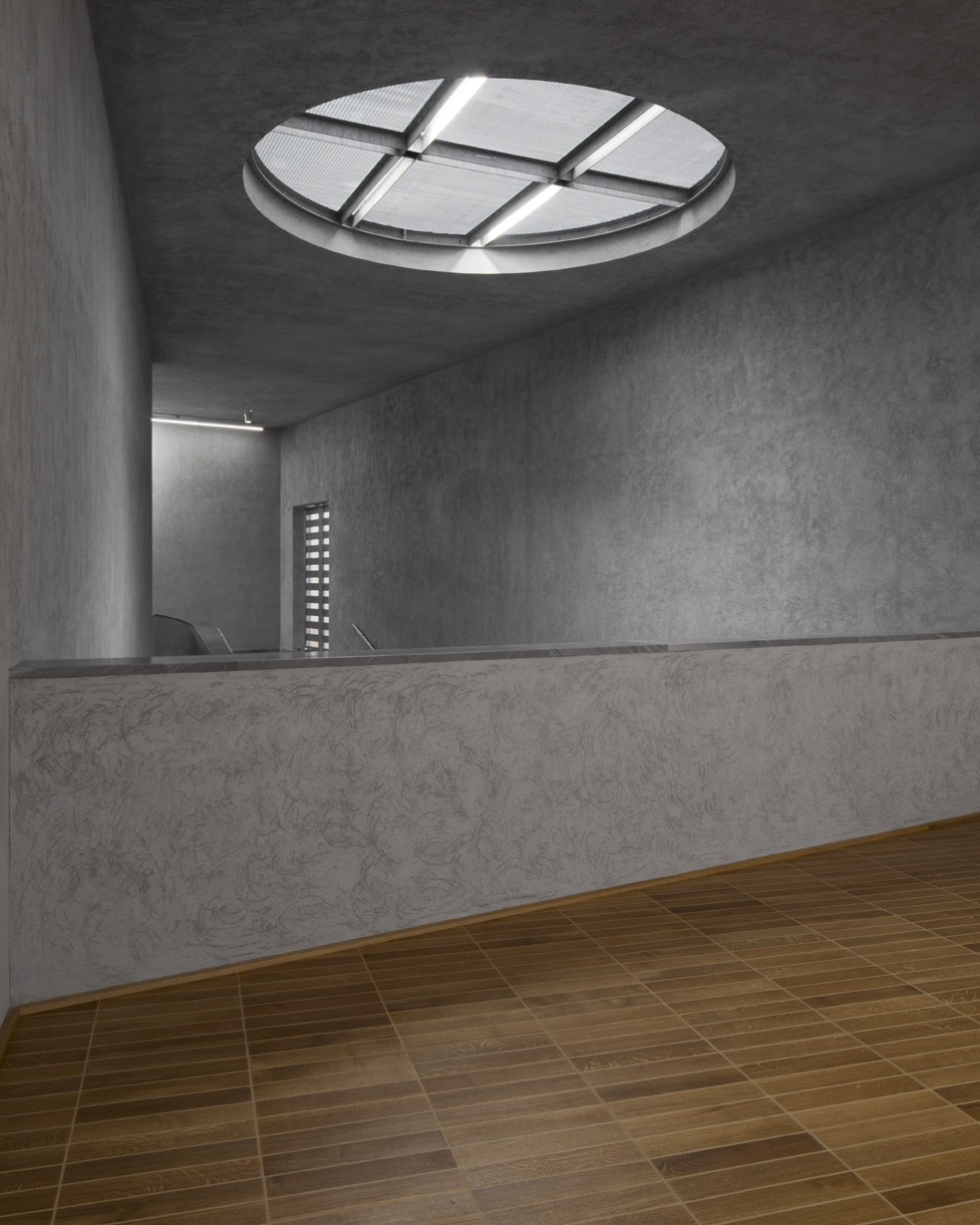 Tatsächlich ist der Dialog schon jetzt ein reichhaltiger. Das Stiegenhaus ist in kühlen, grauen, haptisch ansprechenden Kratzputz gehüllt. Die Methode ist aufwendig und handwerklich herausfordernd, weil der Putz zunächst ein wenig anzieht, bevor der Trocknungsprozess unterbrochen und die Oberfläche mit einer Nagelbürste wieder aufgekratzt wird. Die Risse, die sich dabei bilden, verleihen ihm auf diese Weise ähnliche bauphysikalische Eigenschaften wie Lehmputz. Tausende Quadratmeter davon zieren Wand und Decke. „Dieser Putz kann so viel Feuchtigkeit und Wärme absorbieren, dass die Unterschiede zwischen Tag und Nacht, zwischen Sommer und Winter, zwischen vielen und wenigen Besuchern gut kaschiert werden“, erklärt Emanuel Christ, Partner im Basler Architekturbüro Christ & Gantenbein. Das entlastet die Heizung, Kühlung und Klimatisierung der Räume so sehr, dass das Gebäude unterm Strich Passivhausqualität erreicht. „Die Kuratoren dachten am Anfang sogar, dass die Klima- und Luftmessgeräte kaputt seien“, so Christ. „Unabhängig von Wetter, Temperatur und Anzahl der Menschen im Raum war die angezeigte Luftqualität immer die gleiche.“