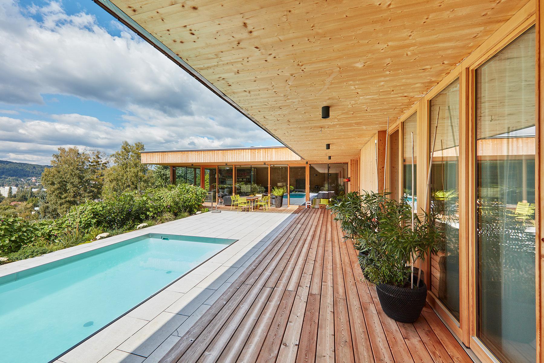 Ein Haus in solch schöner, sanfter Hanglage zu planen, scheint nicht schwierig. Die Herausforderung: Aufenthalts- und Schlafbereiche richtig positionieren, gezielte Ausblicke und erweitertes Wohnen im Freien ermöglichen. Der Bauherr, als Vorarlberger vom Holzbau überzeugt, wünschte sich Holz in modernstem Einsatz und perfekter Verarbeitung.All das kann dieses Haus für eine vierköpfige Jungfamilie. Seine klare L-Form mit zwei fein differenzierten Raumhöhen trennt die öffentlichen Funktionen Wohnen, Spielen, Kochen und Essen von den persönlichen, intimen Räumen und schafft zugleich ein attraktives Ganzjahresangebot - den geschützten Hofraum als Sommerrefugium.