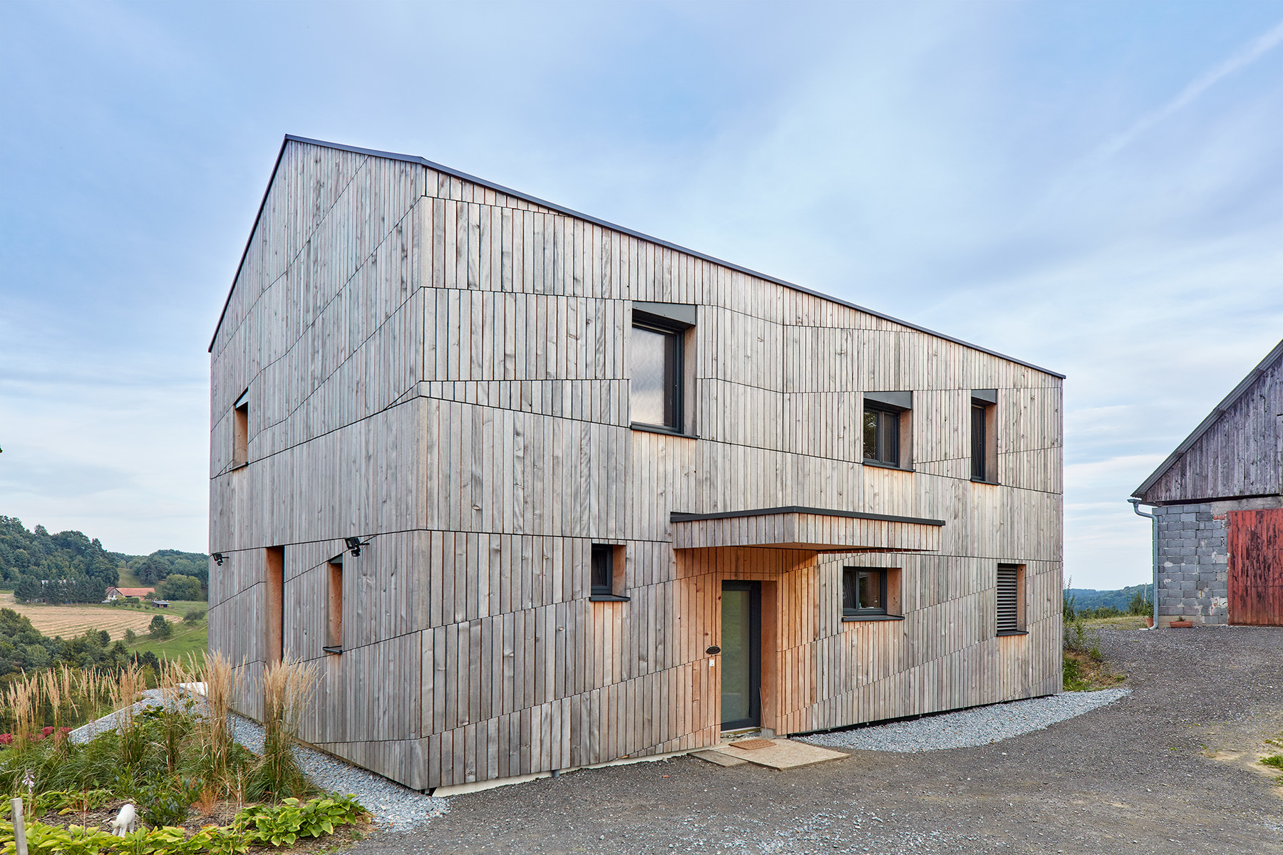 Seine schlichte Form ohne Dachvorsprünge, gleich einem Bauklotz im Holzbaukasten, macht dieses Heim für eine Jungfamilie zum Archetypus eines Hauses. Es will sich in eine bestehende Hofanlage mit ganz unterschiedlichen Bestandsobjekten einfügen und zeigt keinerlei Extravaganzen – mit Ausnahme der Fassade, die ein Blickfang ist. Ein „billiges“ Material, sägeraue Tanne, macht sie durch schräge Schnitte, die wiederum schräge Fensterabschlüsse bedingen, zur Besonderheit.Der Bauherr ist Forstwirt und die Verschalung eine Eigenleistung mit eigenem Holz. Für Wandscheiben und Decken kam auch hier Brettsperrholz mit hohem Vorfertigungsgrad zum Einsatz, das innen großteils sichtbar belassen wurde. An den relativ kleinen Fenstern der Rückzugsräume im Obergeschoss kann man ablesen, dass hier gar kein Bedürfnis besteht, Innen- und Außenraum miteinander zu verschmelzen. Von Grün umgeben ist dieses Haus ein Haus, ist ein Haus … (Text: Jurytext Holzbaupreis Steiermark 2015)