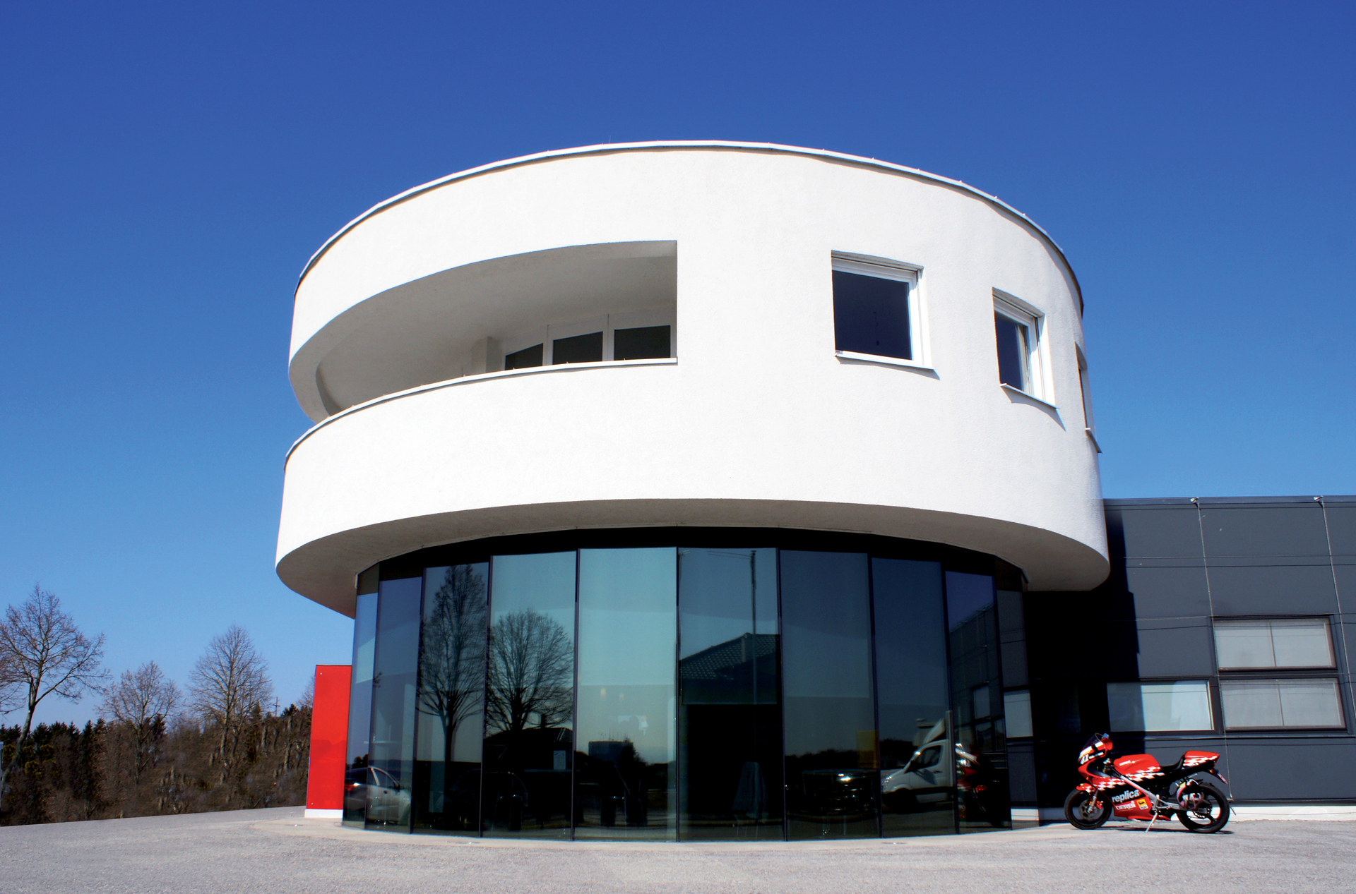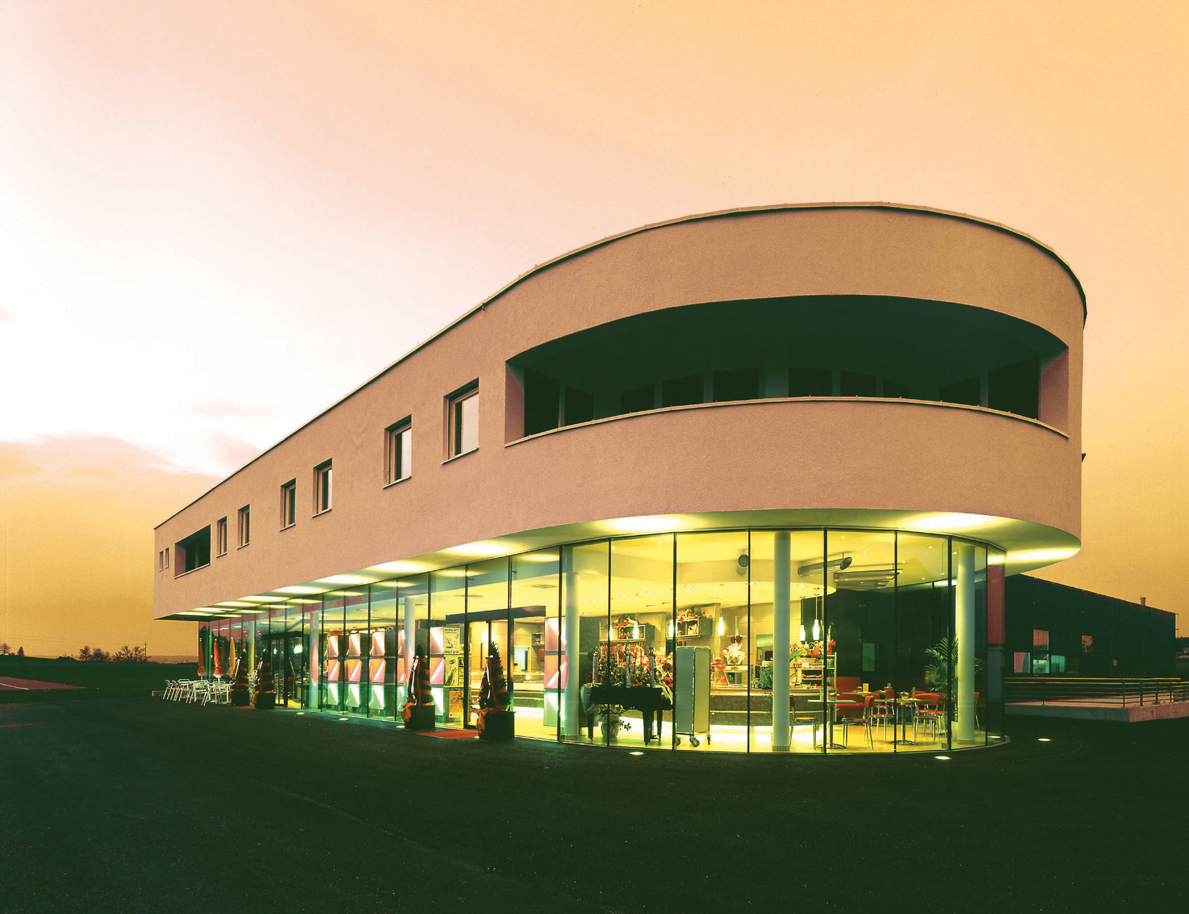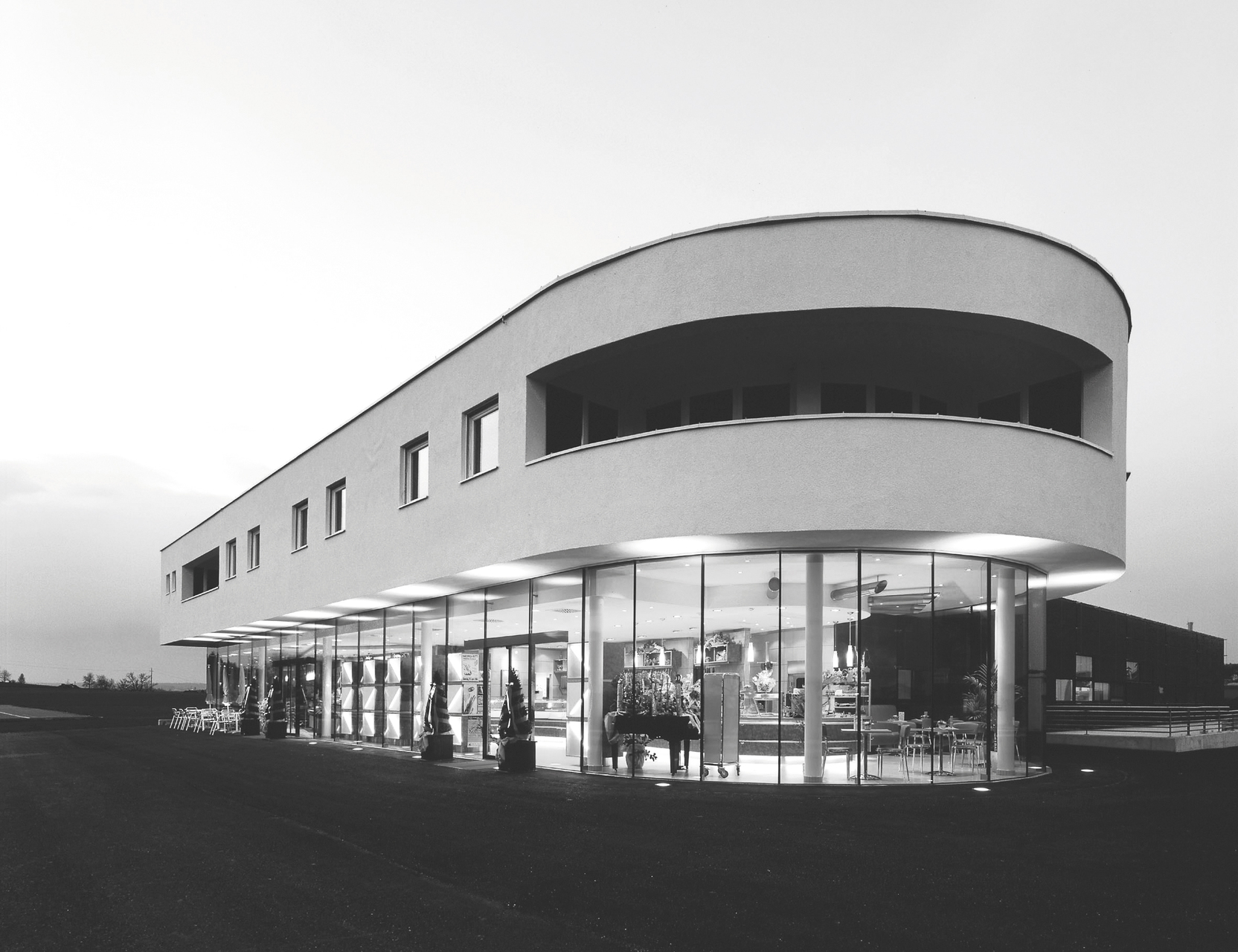 Der im Erdgeschoss optisch durchlässige und freischwebende Baukörper mit den Geschäftsräumen – Verkauf – Imbiss - Büro , wurde Richtung Süden halbkreisförmig abgerundet um eine zeichenhafte Gestalt des Hauptbaukörpers zu erreichen. Erd – und Obergeschoss sind konstruktiv – typologisch und im Material differenziert : Im EG Nurglasscheiben in „ struktural glasing – System“, Stützen, Querscheiben und Decken in Beton, oben geschlossene schwerlastige Putzfassade ; Lochfassade mit horizontalen Fensterbändern.